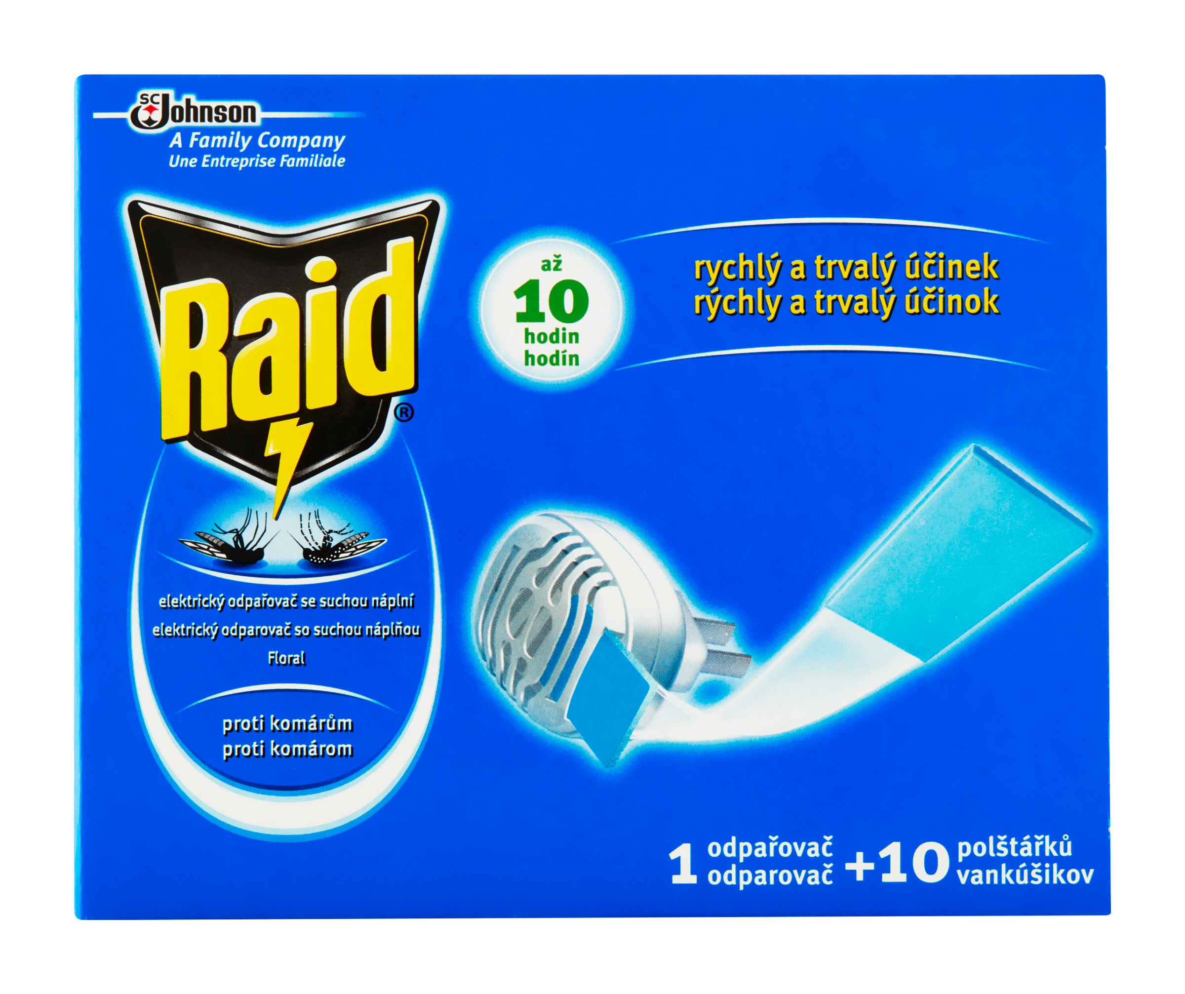 Raid® elektrický odpařovač se suchou náplní Floral, insekticid poskytuje ochranu proti komárům včetně tygřích po celou noc. Každý polštářek poskytuje až 10 hodin ochrany.