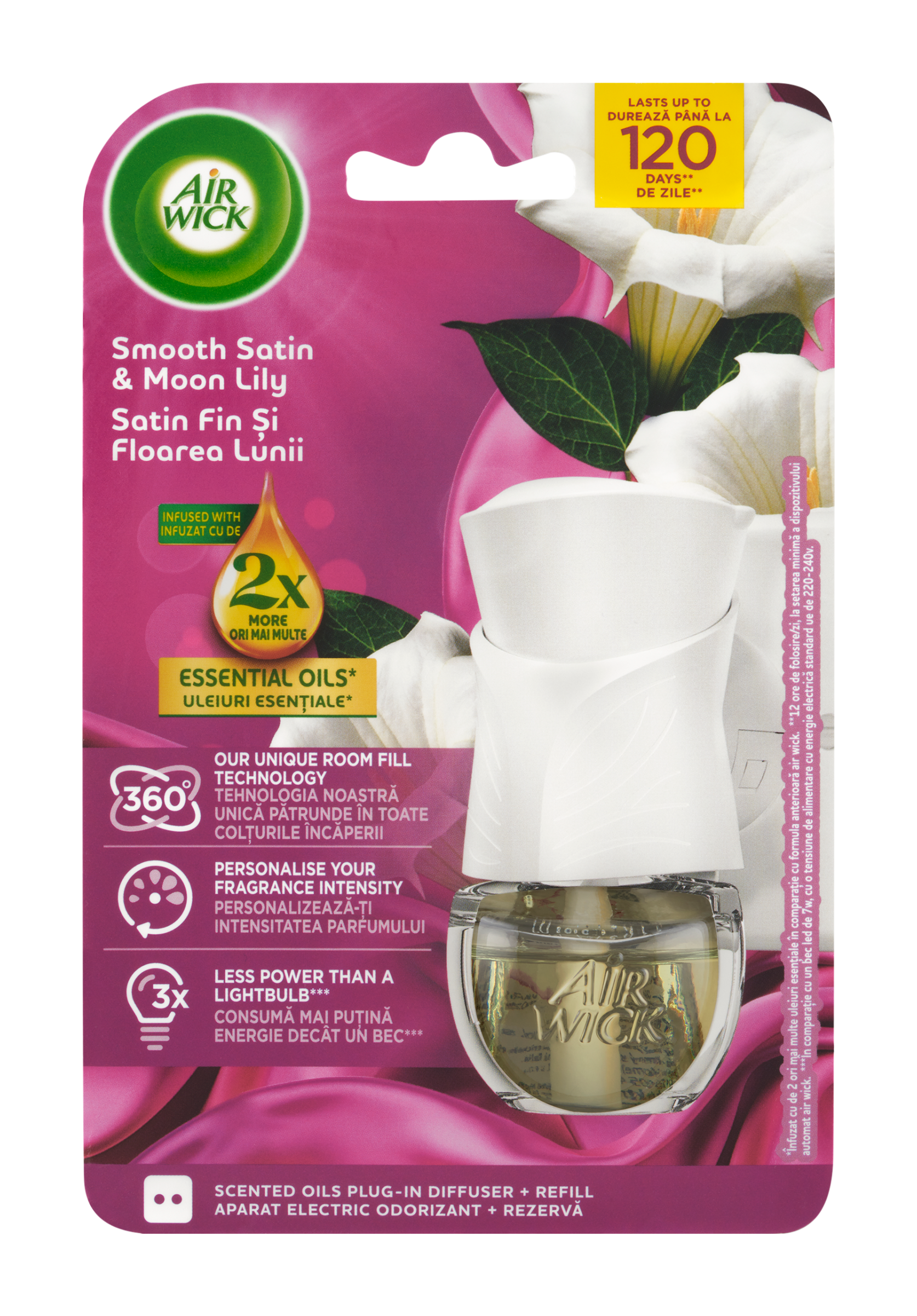 Představujeme elektrický difuzér s nejnižší spotřebou elektřiny od značky Air Wick. Díky “Upwards and Outwards” technologii se vůně dostane do každého koutu vaší místnosti a vytvoří příjemné prostředí. Nový stylový design navíc dokonale ladí s interiérem domácnosti. Naše složení je obohaceno o přírodní esenciální oleje, které vám zprostředkují autentický zážitek z vůně. Lahodná a okouzlující květinová gourmand vůně, která spojuje svěžest citrusových plodů, hřejivost koření a sladkost květinových a gurmánských tónů. Provoňte svůj domov vůněmi inspirovanými přírodou a vytvořte si hřejivou a příjemnou atmosféru. Vůně je obohacena o dvojnásobné množství přírodních esenciálních olejů ve srovnání s předchozím složením Air Wick náplně do elektrického přístroje. Vydrží až 120 dní při používání 12 hodin denně na nejnižší úrovni intenzity vůně.