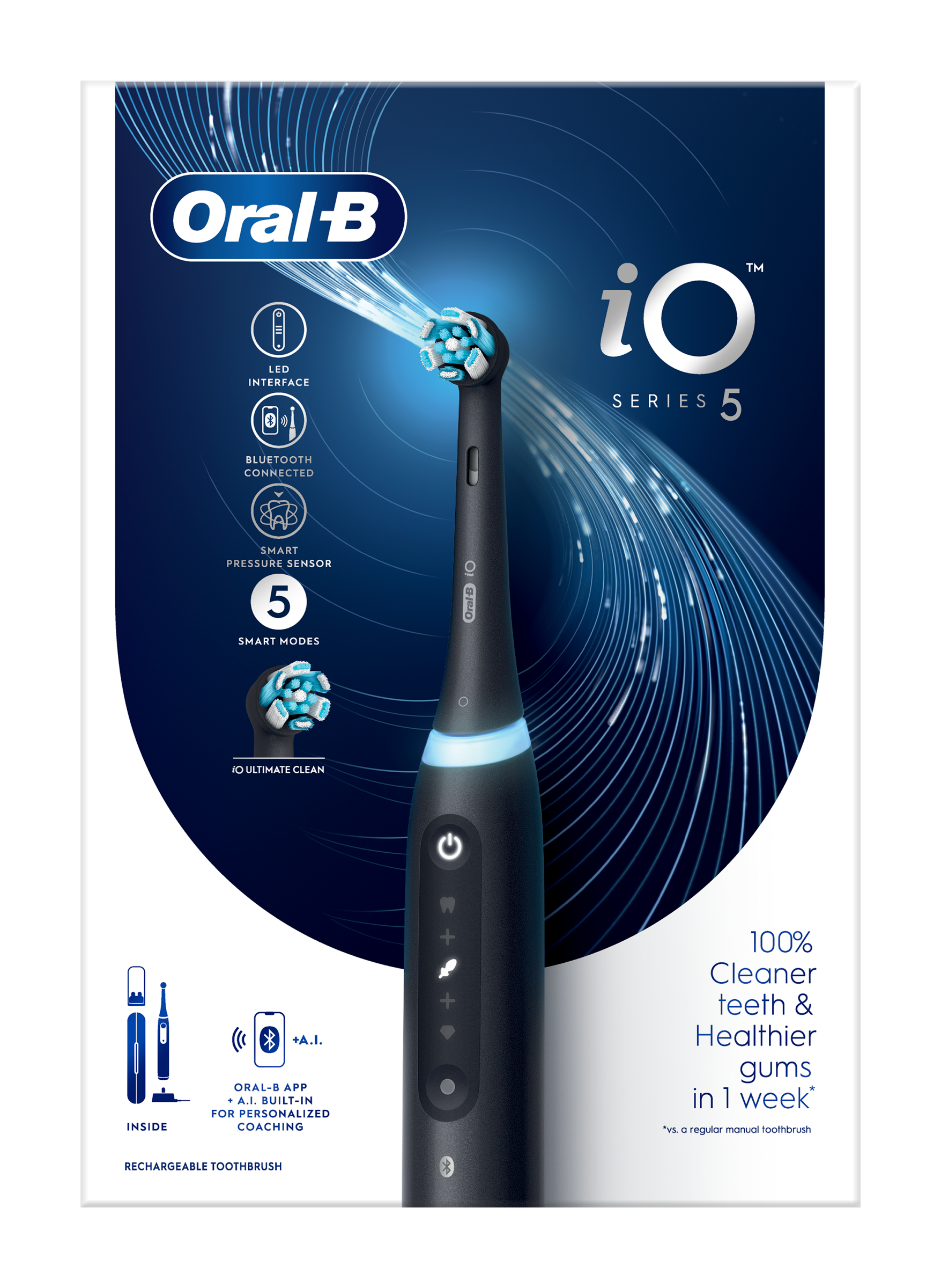 Elektrický zubní kartáček iO 5 má nejlepší technologii od Oral-B. Kombinuje kulatou kartáčkovou hlavu inspirovanou zubními lékaři s jemně mikrovibrujícími vlákny pro pocit profesionální čistoty v pohodlí domova. Chytrý senzor tlaku pomáhá zabránit, abyste při čištění příliš nebo naopak málo tlačili, čímž chrání dásně. U.I. funkce rozpoznání čištění pozná váš styl čištění a každý den vás povede, abyste si zuby čistili lépe. Připojí se k bezplatné aplikaci Oral-B, která umožňuje sledovat čištění v reálném čase a navádět v 6 zónách čištění. Aby byly výsledky nejlepší, vyměňujte kartáčkovou hlavu Oral-B iO každé 3 měsíce za novou.