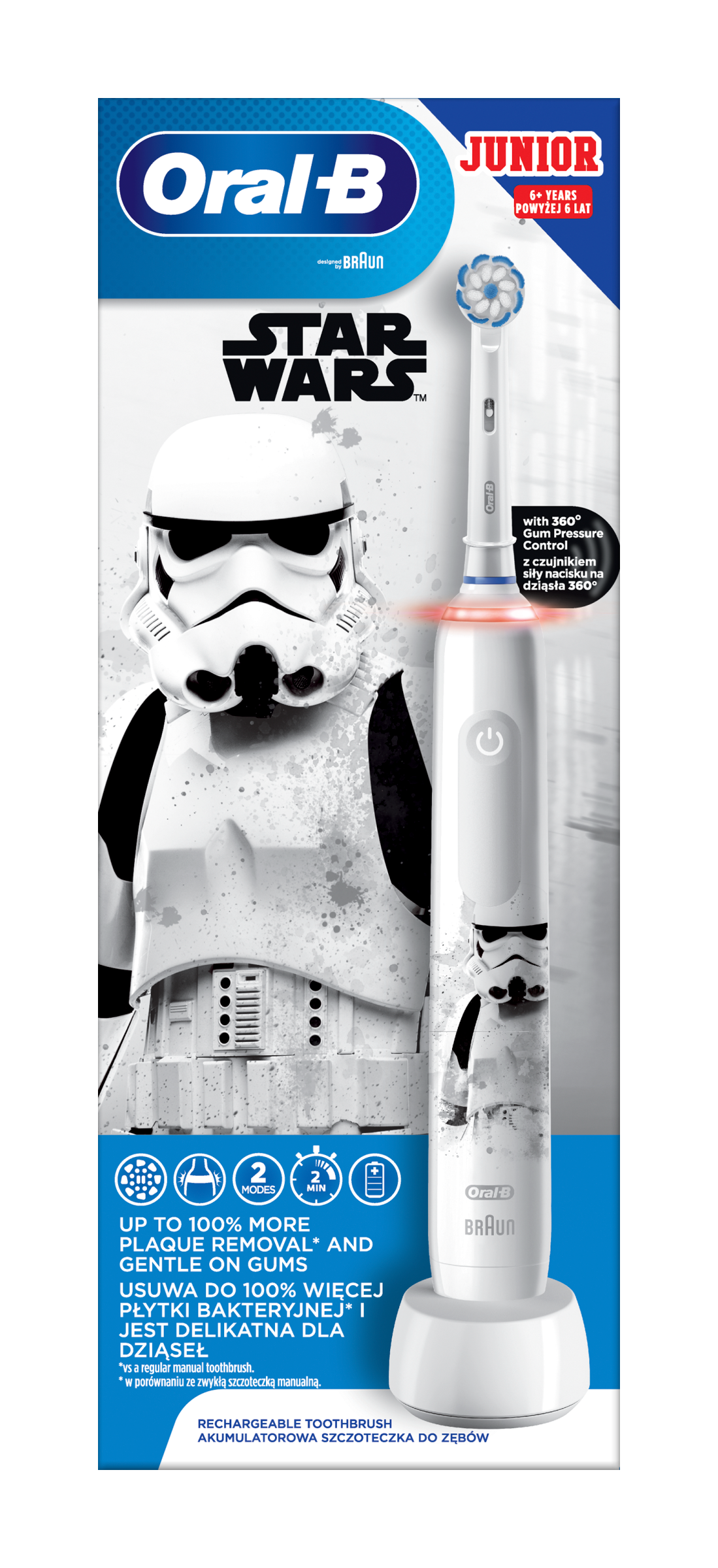 Elektrický zubní kartáček Oral-B Junior s motivem Hvězdných válek pro děti od 6 let byl navržen ve spolupráci se zubními lékaři a zajišťuje špičkovou čistotu zubů. Na ochranu jemných dětských dásní má zubní kartáček vizuální senzor tlaku, který červeně bliká a snižuje rychlost čištění, jakmile zjistí, že se při čištění moc tlačí. Jeho kulatá kartáčková hlava má navíc extra měkká vlákna. Pokud chcete, aby bylo čištění zubů ještě zábavnější, je možné použít bezplatnou aplikaci Disney Magic Timer od Oral-B. S touto aplikací si 90 % dětí čistí zuby déle. Je to ten pravý kartáček, který dětem pomůže, aby si čistily zuby samostatně a vytvořily si zdravé návyky při čištění, které jim vydrží celý život.