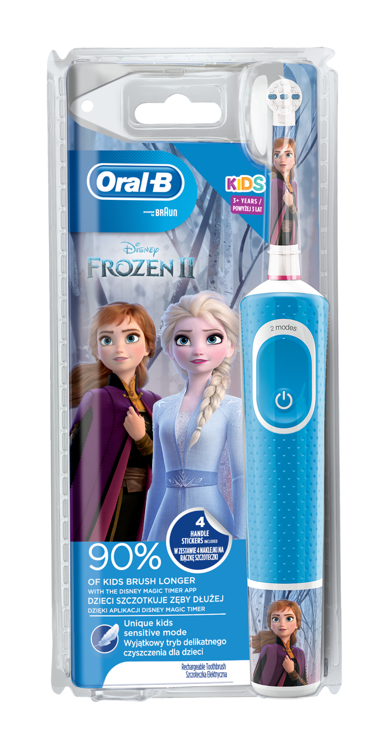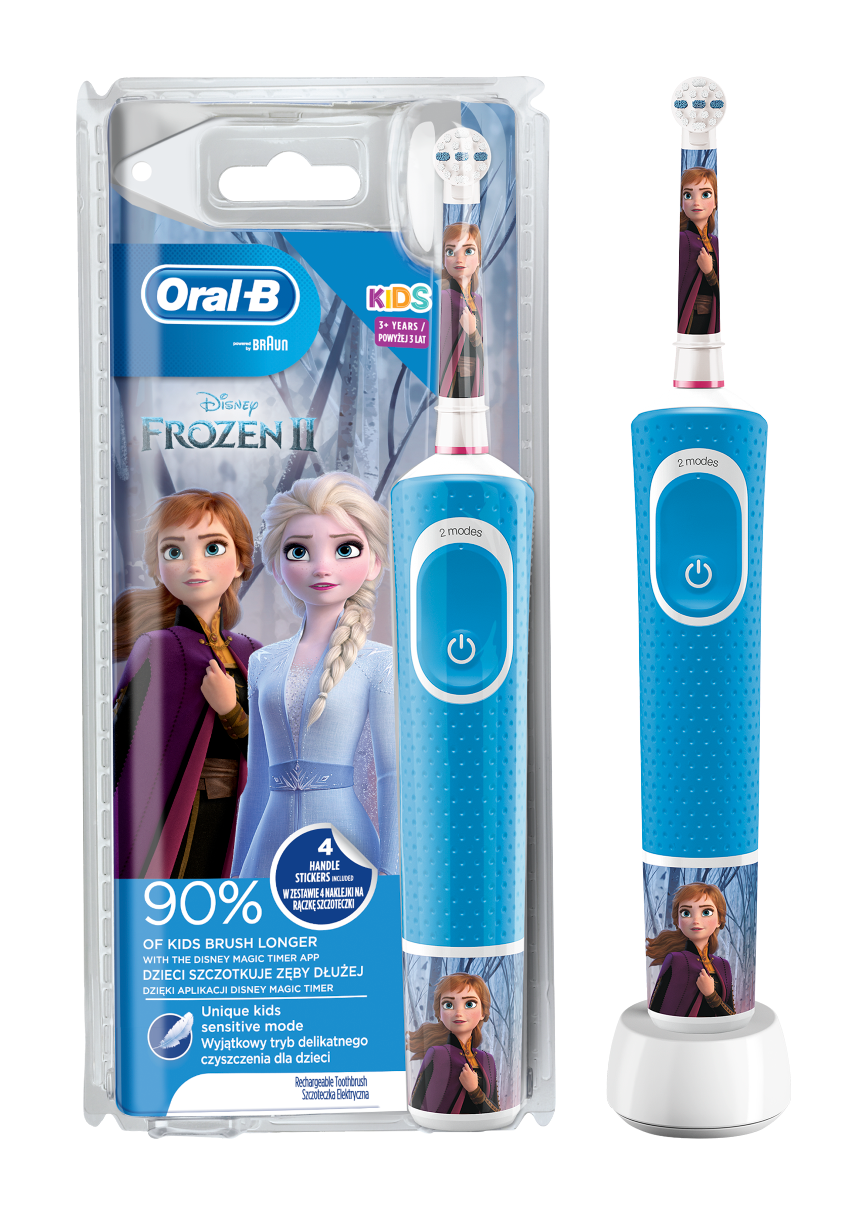 Elektrický zubní kartáček Oral-B Kids pro děti od 3 let přináší dětem zábavu s Disney Ledovým královstvím 2 a zároveň jemné efektivní čištění pomocí zubního kartáčku Oral-B, který doporučují zubní lékaři.. Tento kartáček má unikátní režim jemného čištění, takže čistí dětské zoubky šetrně. Odstraňuje více zubního plaku než běžný manuální zubní kartáček. Vzhled rukojeti můžete upravit 4 přiloženými samolepkami s motivy Disney Ledového království 2..
