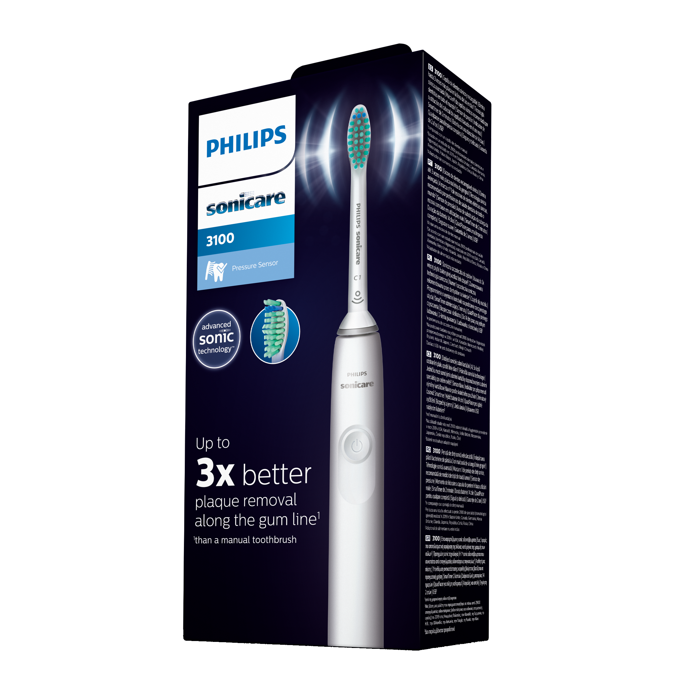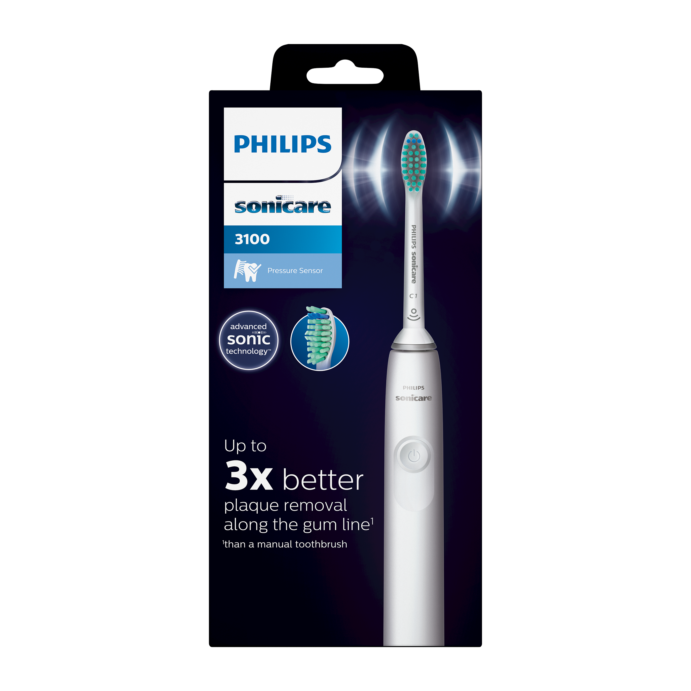 Sonický elektrický zubní kartáček Philips Sonicare 3100. Odstraňuje až 3x více zubního plaku než manuální kartáček. Šetrné čištění zubů díky našemu tlakovému senzoru, který upozorní, pokud s kartáčkem při čištění příliš tlačíte. Pomáhá zlepšovat zdraví dásní.
