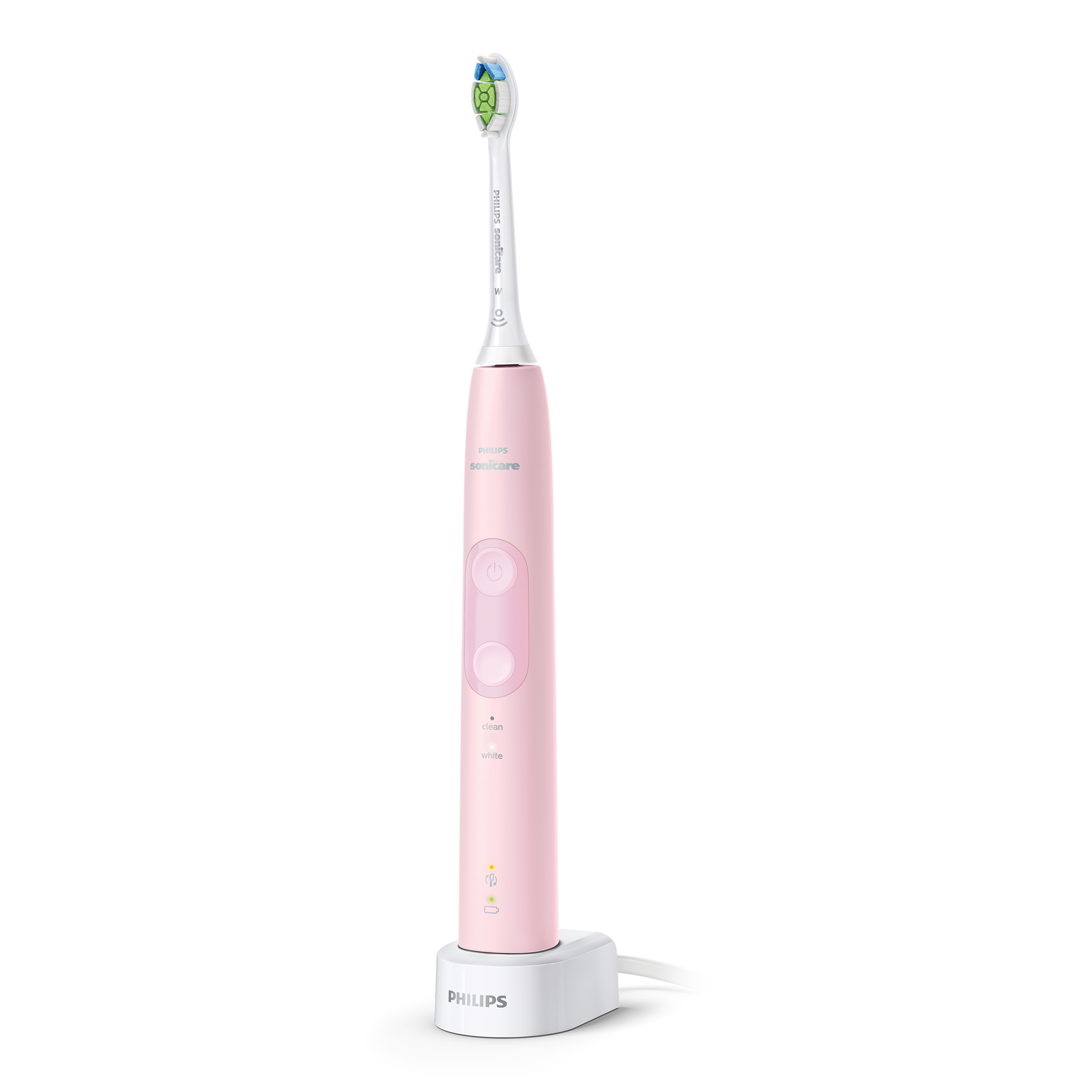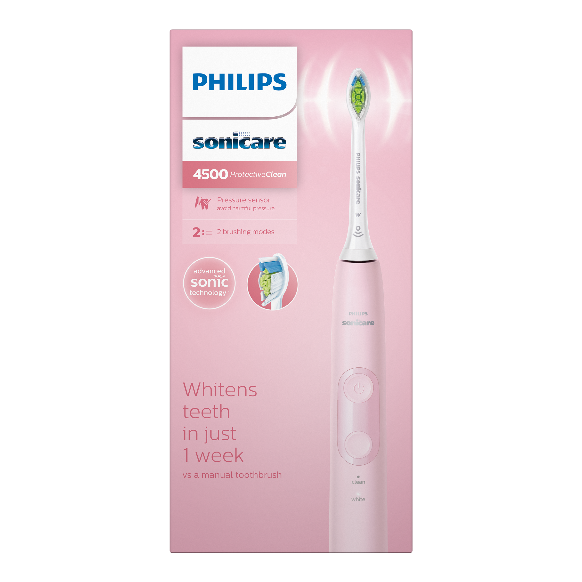 Philips Sonicare ProtectiveClean 4500, růžová edice. Šetrné čištění zubů díky našemu tlakovému senzoru, který upozorní, pokud s kartáčkem při čištění příliš tlačíte. Světlejší zuby během 1 týdne. Bezpečný a šetrný pro citlivé zuby a dásně, rovnátka a zubní náhrady.