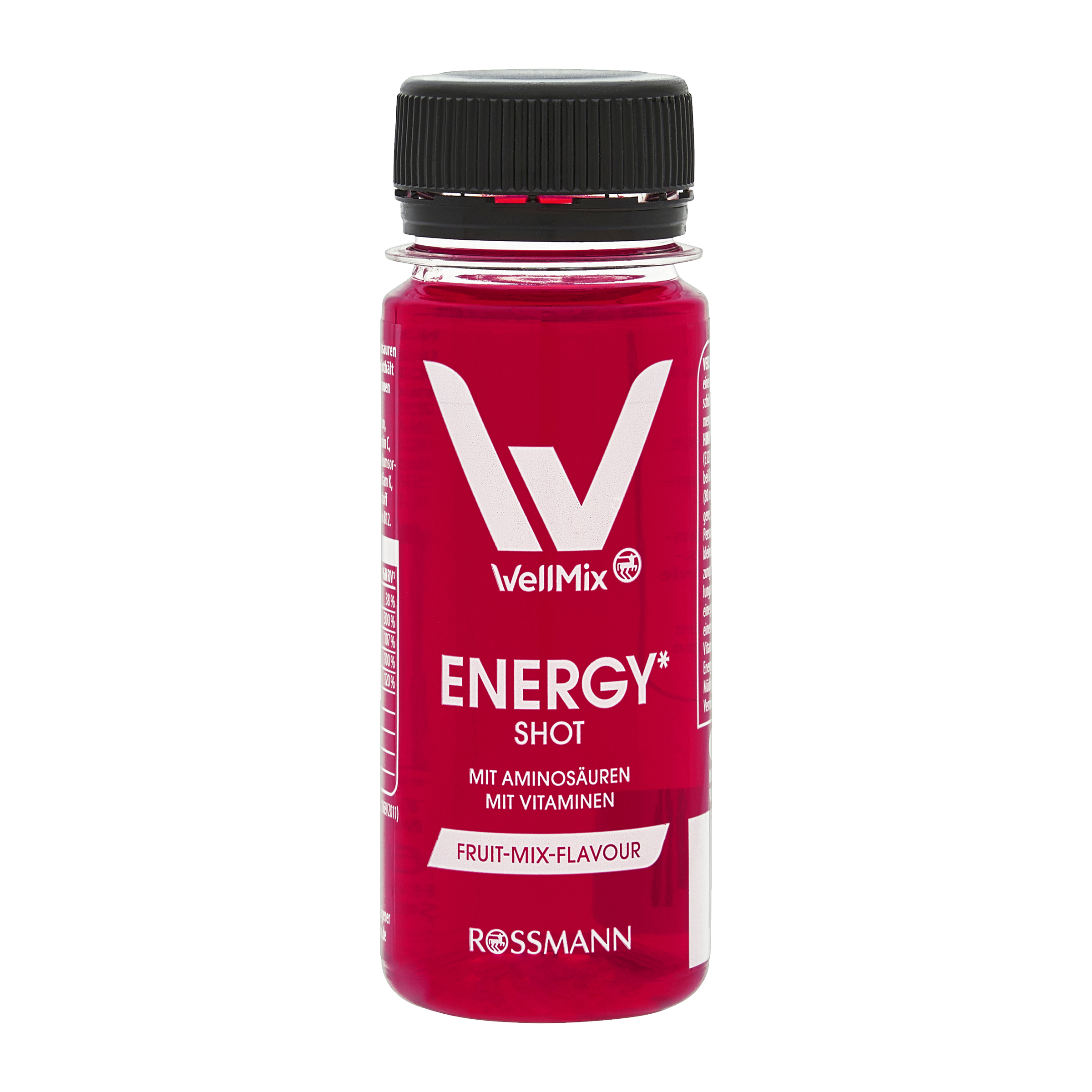 Objevte sílu ve WellMix Energy Shotu s příchutí ovocné směsi. Osvěžující ovocné příchutě v kombinaci s intenzivní energií pro váš aktivní životní styl. Jediným douškem oživí vaše smysly a rozjede vás. Ideální na cesty, v kanceláři nebo před tréninkem – nabijte se energií nyní s naším malým shotem. Obsahuje kofein (80 mg / 60 ml), aminokyseliny a vitamíny.
