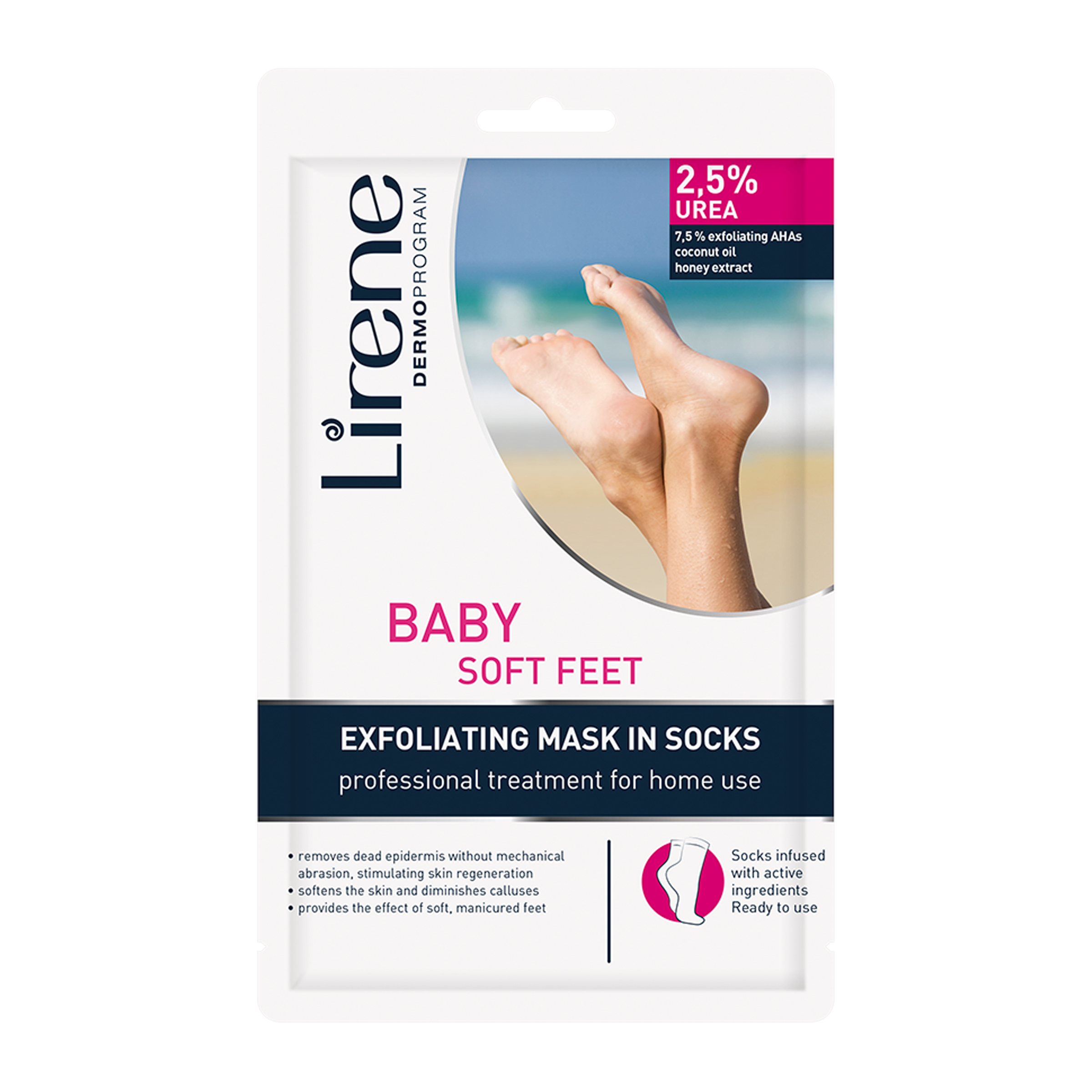 Profesionální péče pro domácí použití pro nohy bez ztvrdlé kůže. Maska obsahuje 2,5 % UREU, 7,5 % kyselin AHA, kokosový olej a medový extrakt. Exfoliační maska na nohy odstraňuje odumřelé buňky bez mechanického tření, stimuluje regeneraci pokožky, zjemňuje pokožku, minimalizuje ztvrdlou kůži a poskytuje efekt jemných nohou jako po salónním ošetření.