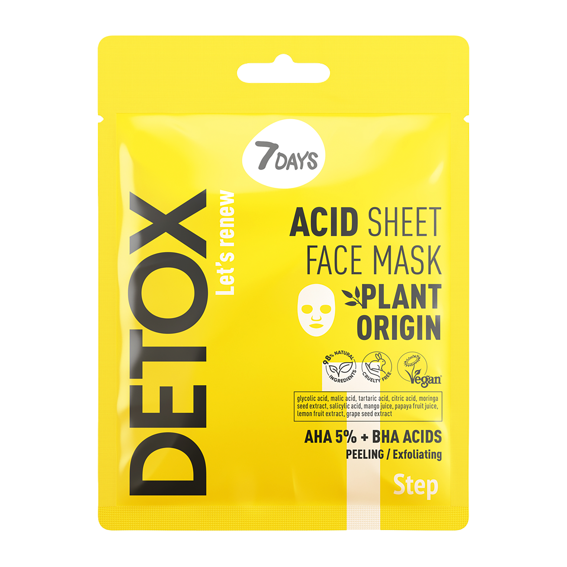 Exfoliační plátěná pleťová maska s AHA a BHA je prvním krokem v systému čištění pleti 7DAYS DETOX. Tato maska odstraní z pokožky odumřelé částečky pokožky a připraví vaši tvář na další krok v čisticím systému – DETOX. Díky 5% koncentraci AHA maska změkčuje odumřelé kožní buňky a odstraňuje je jemně, rovnoměrně a bez traumatizace pokožky, stimuluje procesy obnovy buněk a produkci přirozeného kolagenu a elastinu. Komplex výtažků z tropického ovoce vaši pleť tonizuje, vyrovnává její mikrotexturu a navrací jí lesk.
