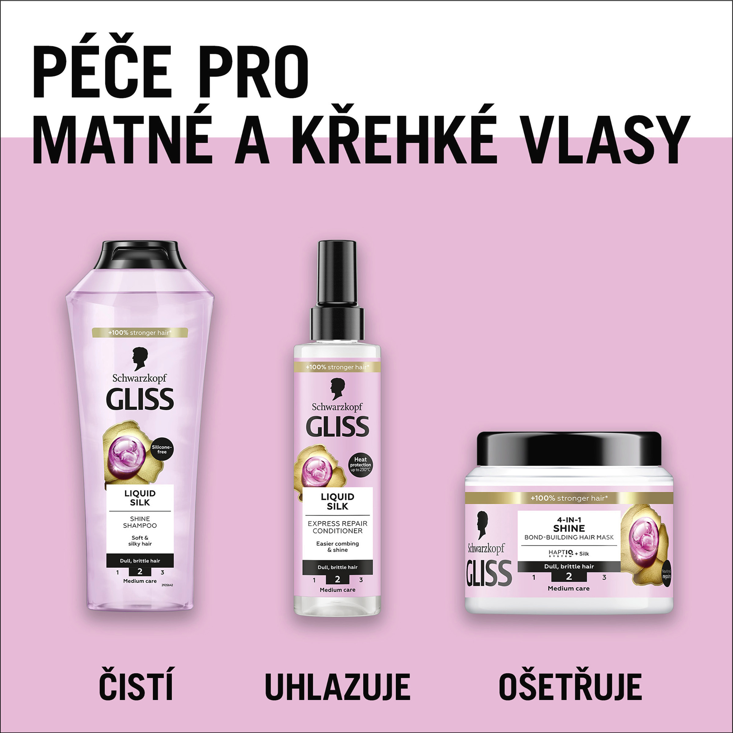 Oprava vlasů je věda, nikoli tajemství. Všechny receptury Gliss, založené na POKROČILÝCH AKTIVNÍCH LÁTKÁCH & PŘÍRODNÍCH POKLADECH, jsou šité na míru speciálním potřebám vlasů, aby zajistily jejich opravu a viditelně zlepšily jejich kvalitu. Opravují stávající poškození a zabraňují budoucímu poškození tím, že posilují buněčnou strukturu a bojují proti volným radikálům. Naše dosud nejlepší oprava vlasů: zabraňuje poškození dříve než k němu dojde, pro dlouhotrvající krásné vlasy. Dostupné ve více než 50 zemích a již více než 60 let důvěřují Gliss miliony lidí.