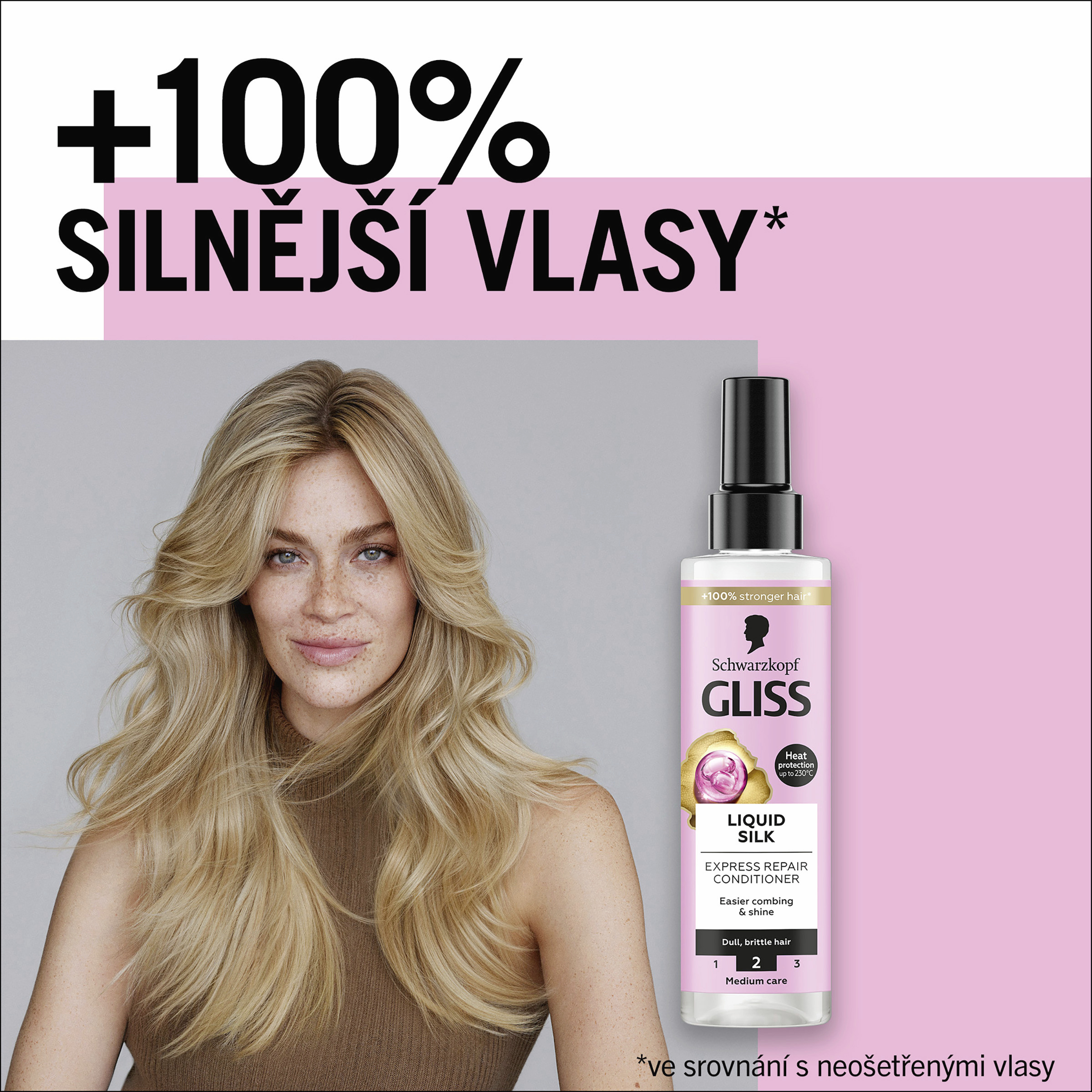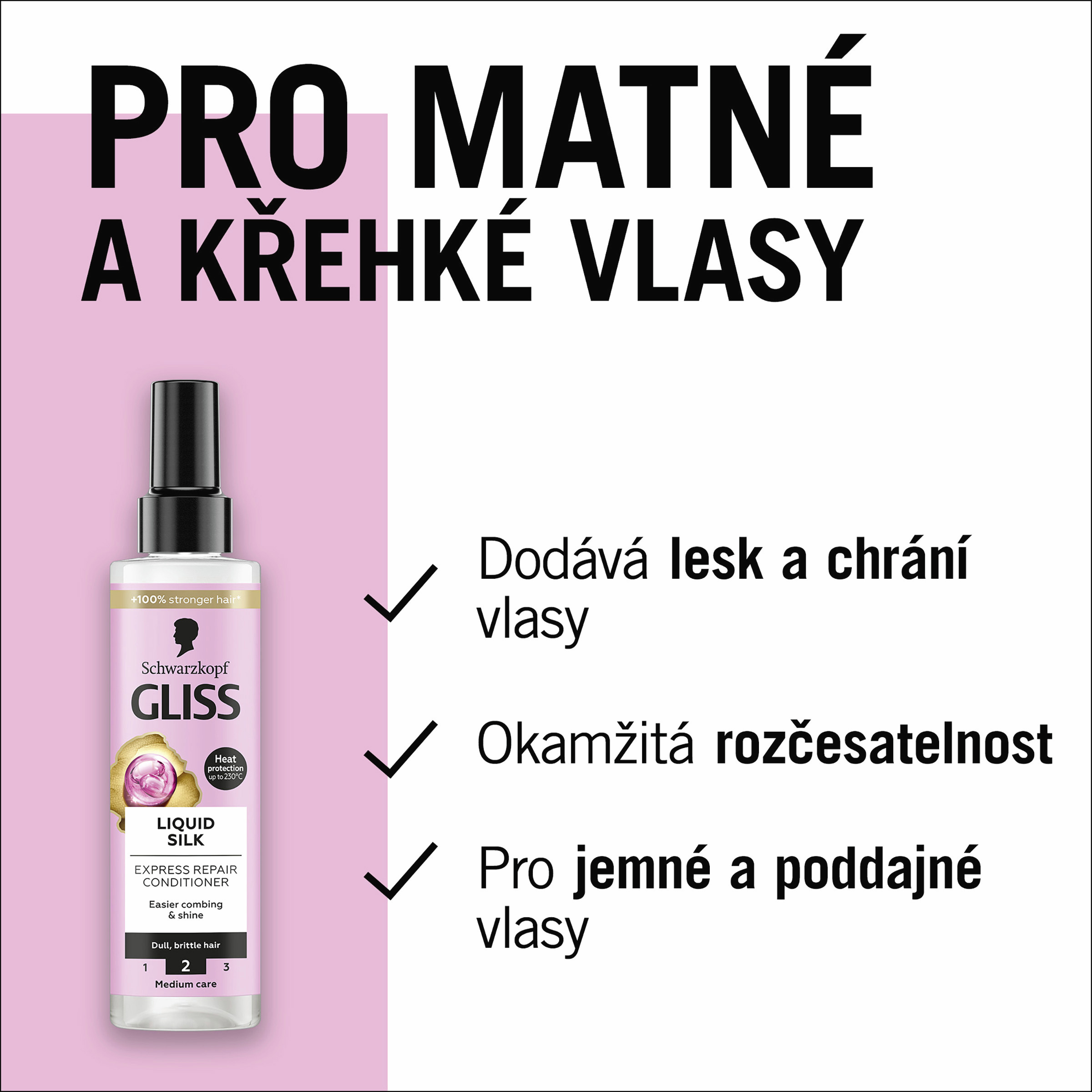 Schwarzkopf Gliss Liquid Silk Expresní regenerační kondicionér ve spreji 200 ml s ceramidy & hedvábím, bezoplachový kondicionér ve spreji pro lámavé & matné vlasy Schwarzkopf Gliss Liquid Silk Expresní regenerační kondicionér pro snadnější rozčesávání a lesk pro lámavé a matné vlasy. Schwarzkopf Gliss Liquid Silk Expresní regenerační kondicionér ve spreji - kondicionér pro lámavé, matné vlasy Vlasy mohou trpět nerovnostmi na jejich povrchu, takže jsou křehké a matné se sklony k lámavosti. Vyžadují tak intenzivní vyživující péči, díky které budou vlasy hladké a hedvábné. Gliss Liquid Silk kondicionér ve spreji kombinuje ceramidy a hedvábí pro vyhlazení povrchu vlasů a zesílení jejich přirozeného lesku. Úroveň péče Gliss: 2 - Střední péče, s vyváženým složením vyživujících ingrediencí. Gliss expresní regenerační kondicionér ve spreji pomáhá pečovat ošetřit vlasy pro jejich okamžité a snadnější rozčesávání. Tento Gliss kondicionér ve spreji poskytuje vlasům ochranu před teplem až do 230°C a intenzivní vyživující péči, díky které jsou vlasy mimořádné jemné, hladké a hedvábné. S pečující ovocnou vůní. 87 % ingrediencí je přírodního původu*. Gliss vlasové produkty jsou certifikovány organizací PETA**. Tělo láhve je vyrobeno ze 100% recyklovaného plastu***.