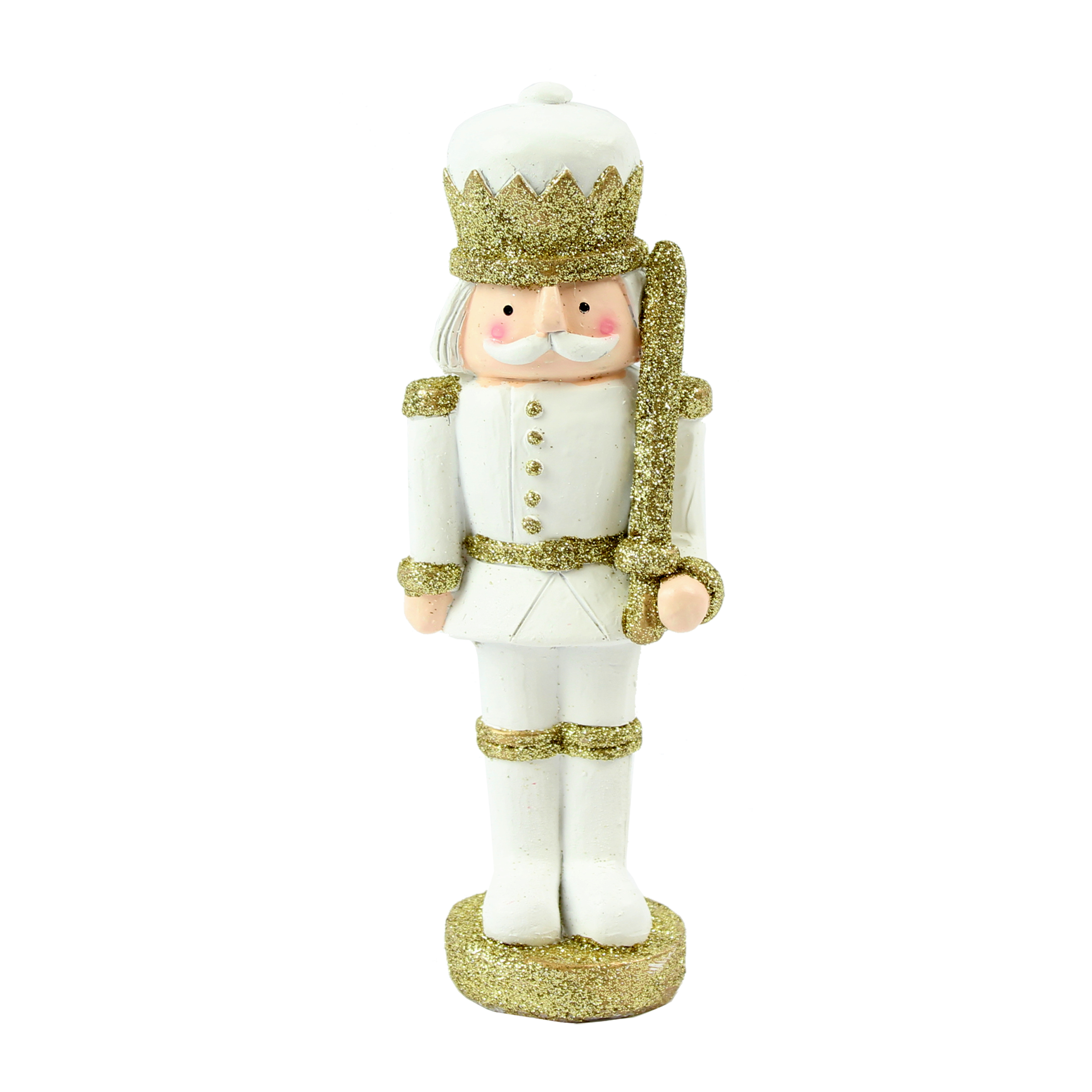 Elegantní figurka louskáčka v bílé uniformě se zlatými třpytivými detaily dodá vašemu interiéru noblesní vánoční atmosféru. S typickým knírkem, růžovými tvářemi a zlatou čepicí stojí pevně na kulatém podstavci. Stylový doplněk pro klasickou i moderní sváteční výzdobu. Výška: 19,5 cm