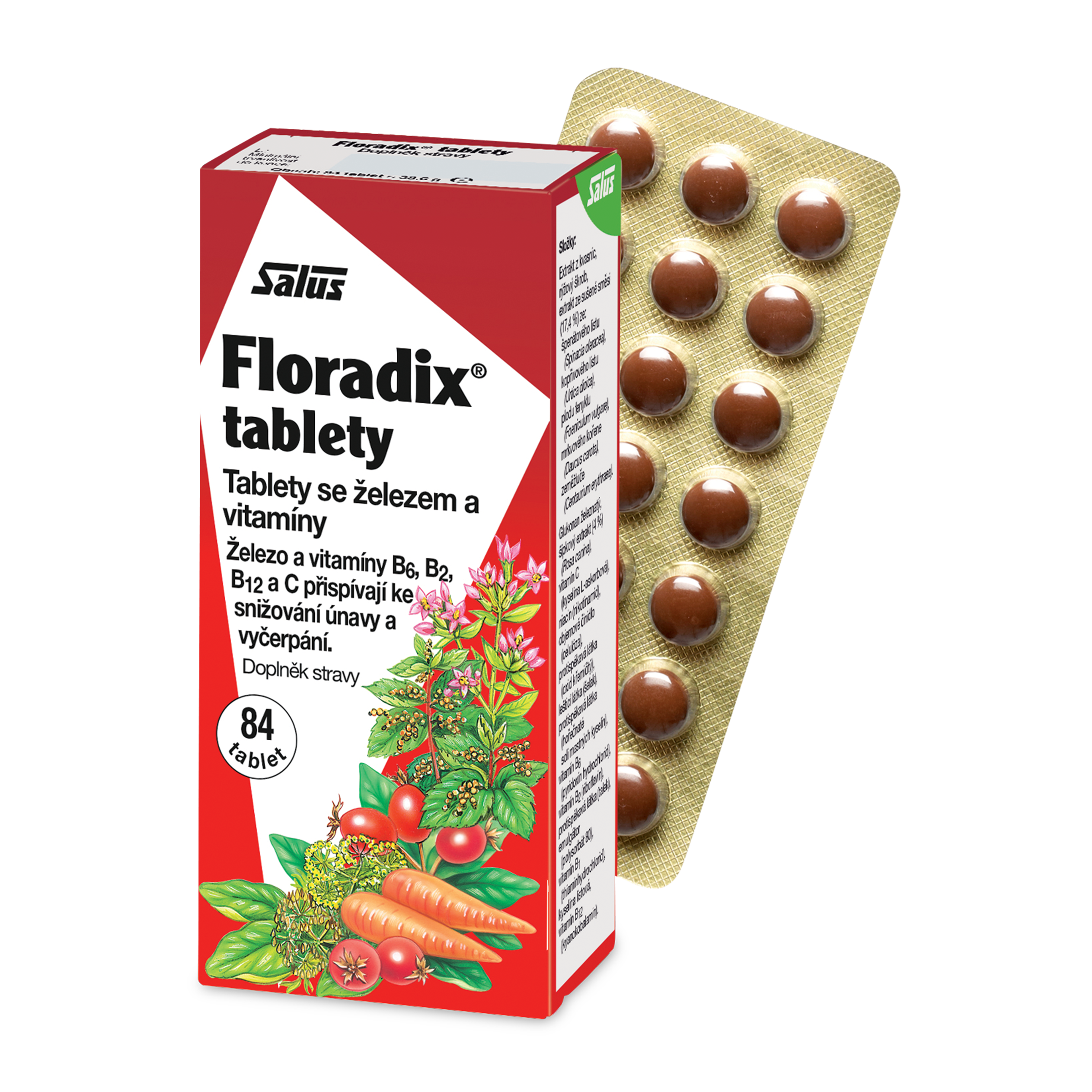 Při únavě a nedostatku železa. Salus Floradix® Železo+ v tabletách je doplněk stravy s obsahem železa a mnoha dalších prospěšných látek, které přispívají ke snížení pocitu únavy a vyčerpání. Železo přispívá k tvorbě červených krvinek a k tvorbě hemoglobinu. Kromě toho přispívá kyselina listová k normálnímu růstu mateřských tkání během těhotenství.