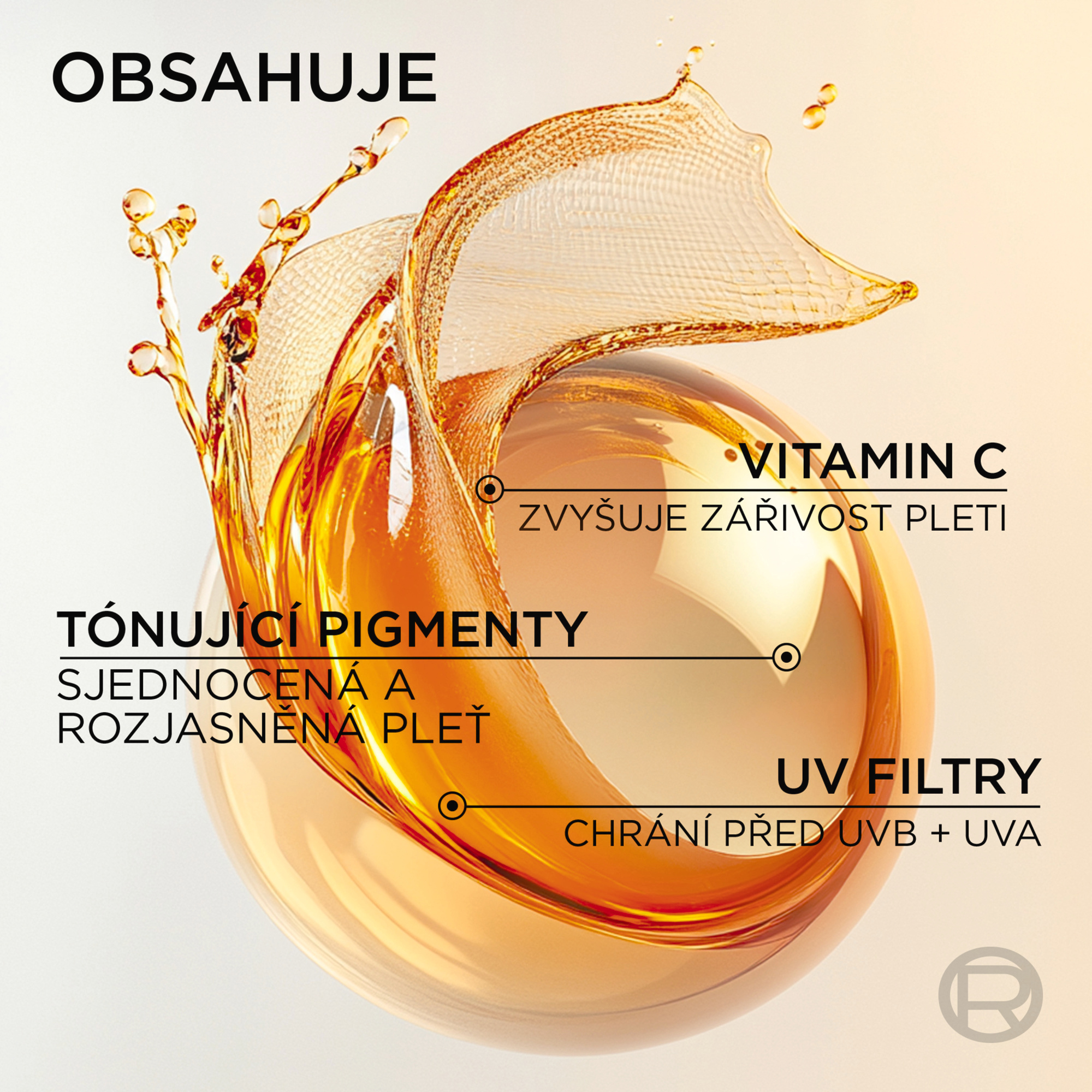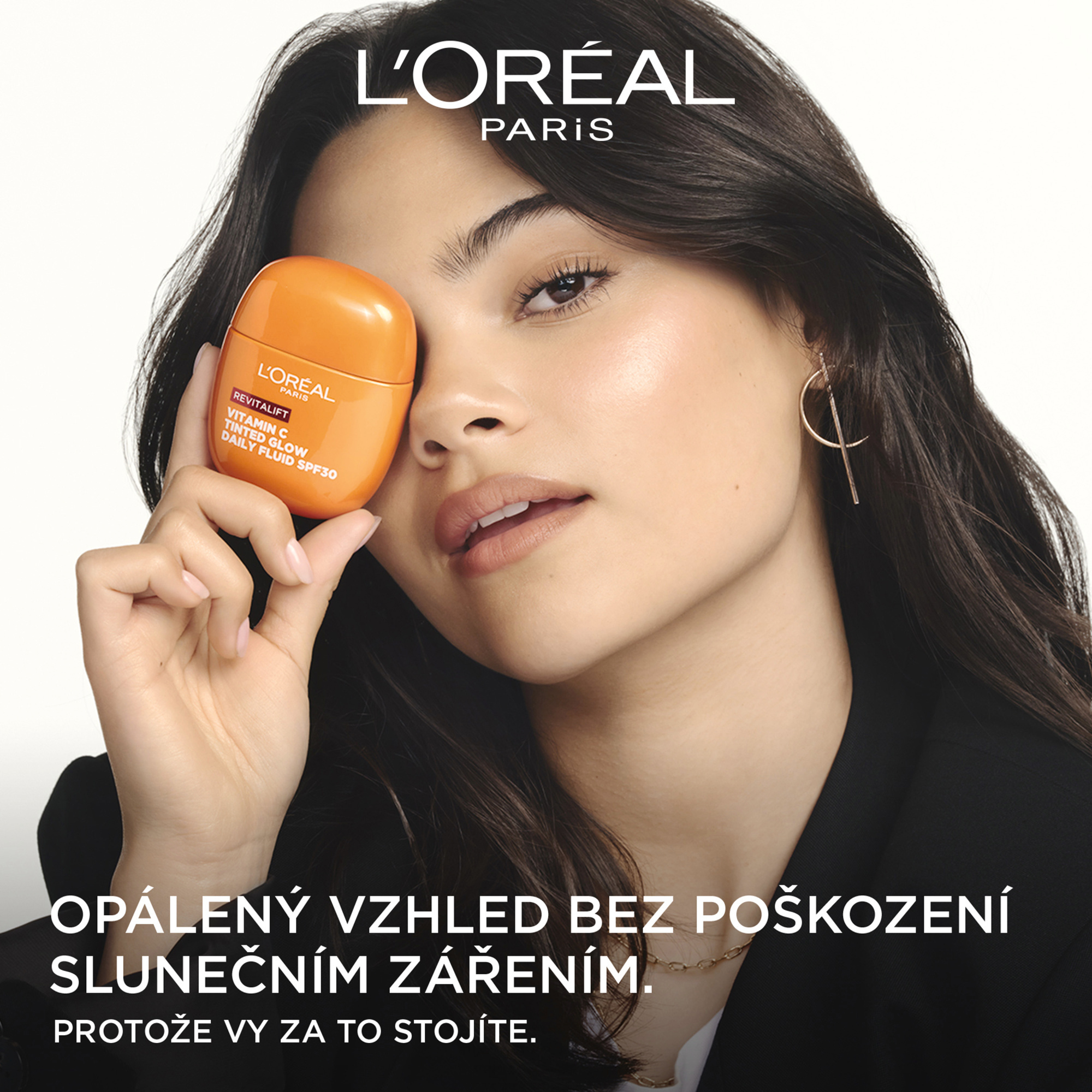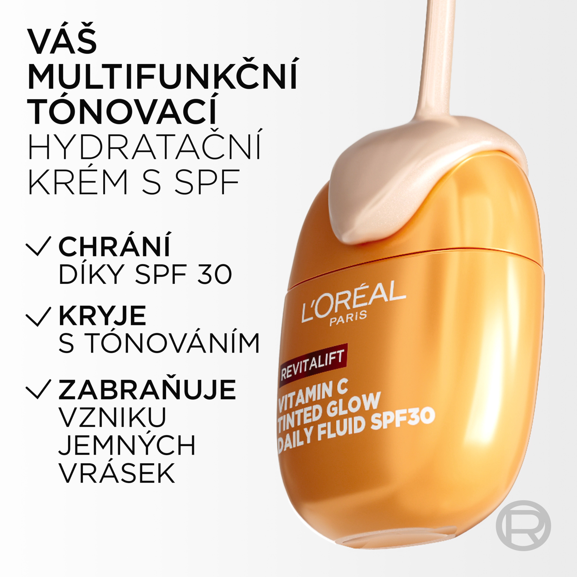 Tónovací denní fluid Revitalift Vitamin C od L'Oréal Paris s SPF30 chrání a rozjasňuje pleť za každé situace. Vysoce účinné tónovací složení obsahuje Vitamin C* pro rozjasnění a sjednocení pleti a redukci viditelnosti jemných vrásek, Vitamin E, který chrání pokožku před oxidačním stresem a stárnutím. Denní fluid je zároveň obohacen o 4 % tónovacích pigmentů, které napomáhají k rozjasnění pleti. UV filtry chrání před UVB a UVA zářením a napomáhají ke zjemnění jemných vrásek způsobených slunečním zářením. Ultra-lehký fluid, který nemastí, rychle se vstřebává a je také perfektní jako základ pod make-up.