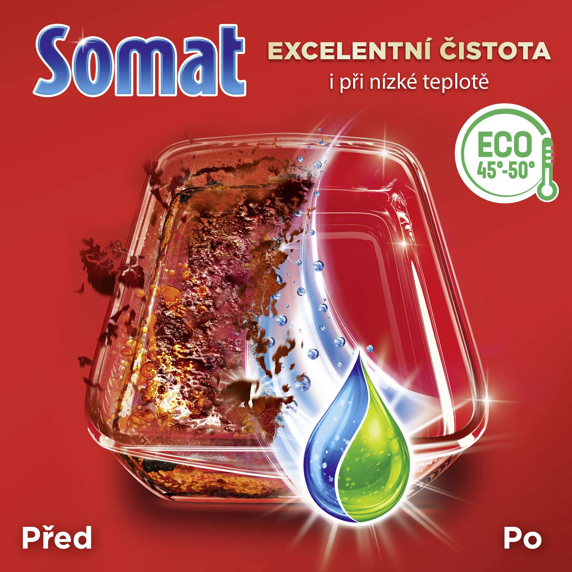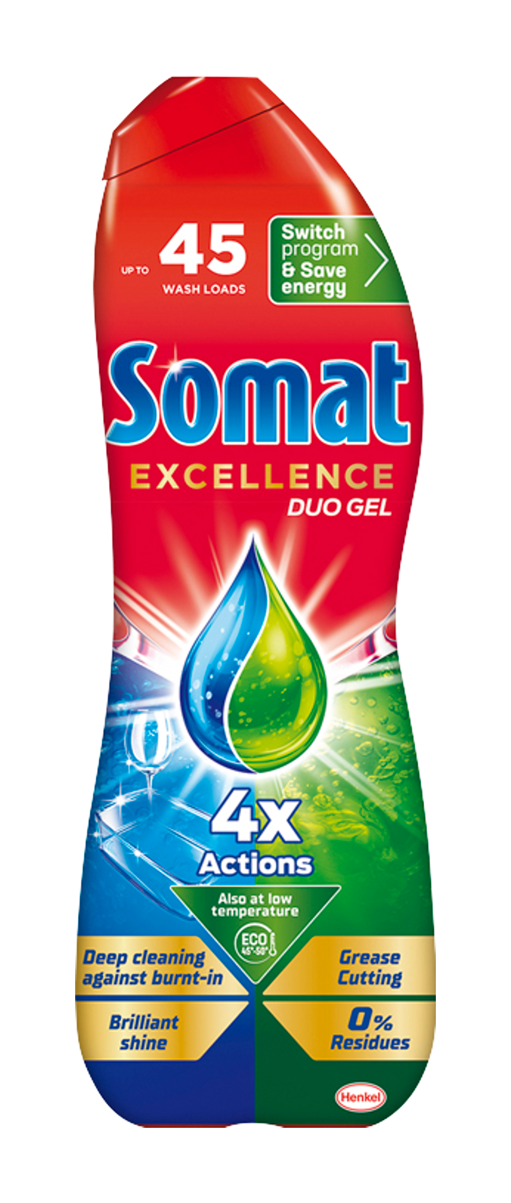 Tento multifunkční tekutý prostředek na mytí nádobí kombinuje dvě doplňující se složení, která působí proti odolným skvrnám a nečistotám! Gel do myčky nádobí se rychle rozpouští i při ekologických cyklech s nízkými teplotami, takže nezanechává žádné zbytky a poskytuje zářivě čistý lesk po každém mycím cyklu. Navíc složení gelu do myčky Somat Excellence proti mastnotě obsahuje aktivní odmašťovače pro čisté a lesklé nádobí! Tekutý čisticí prostředek do myčky nádobí lze snadno dávkovat podle kapacity myčky a znečištění nádobí.
