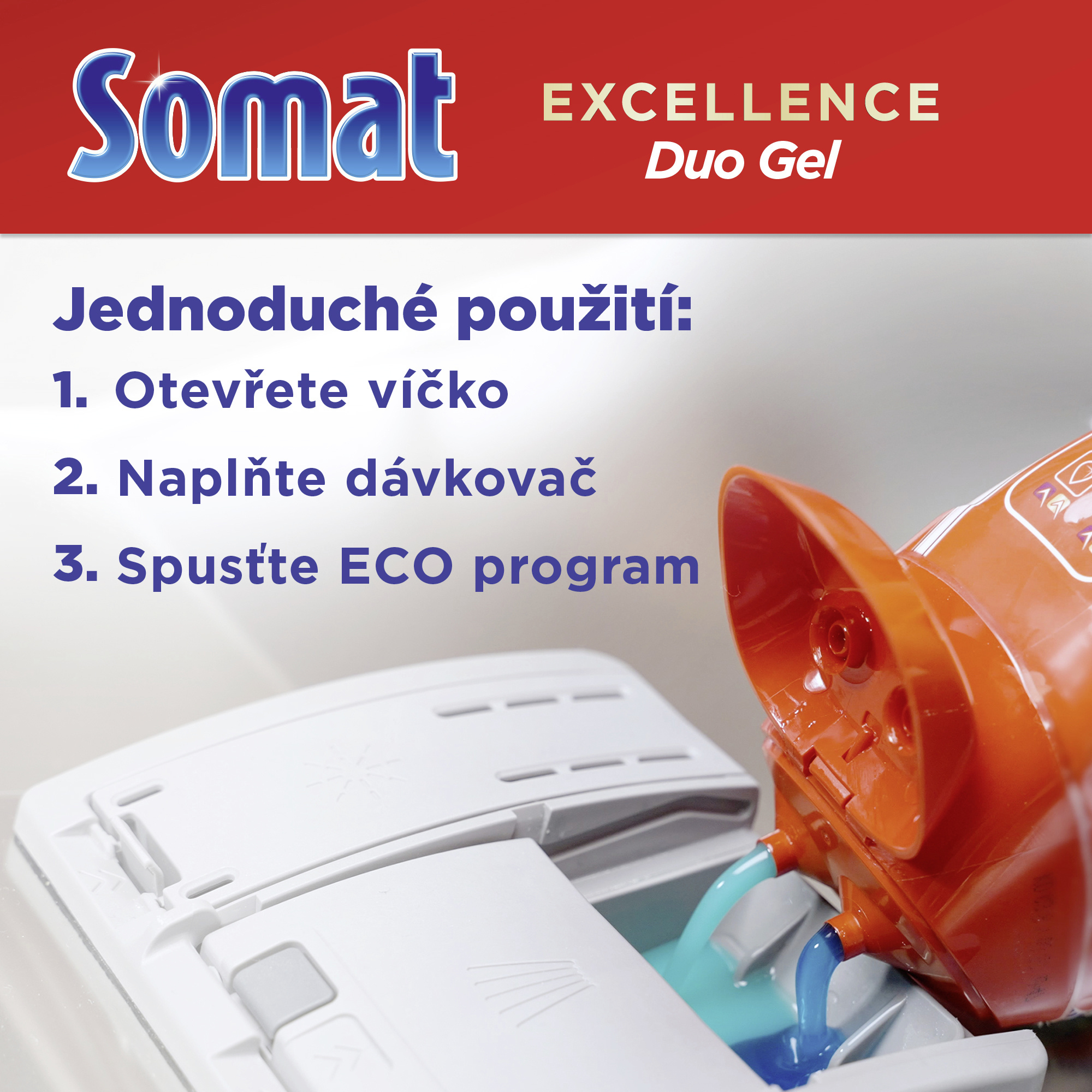 Návod na použití: 1. Nadzvedněte uzávěr a naplňte dávkovací komoru vhodným množstvím podle doporučeného dávkování. 2. Zavřete dávkovací komoru a vyberte mycí program bez předmytí. Tvrdost vody: v případě velmi tvrdé vody (>21°dH), doporučujeme použít Somat Excellence Duo Gel + Somat Sůl + Somat oplachovač. Pro údaje ohledně tvrdosti Vaší vody, kontaktujte, prosím, svého dodavatele vody.