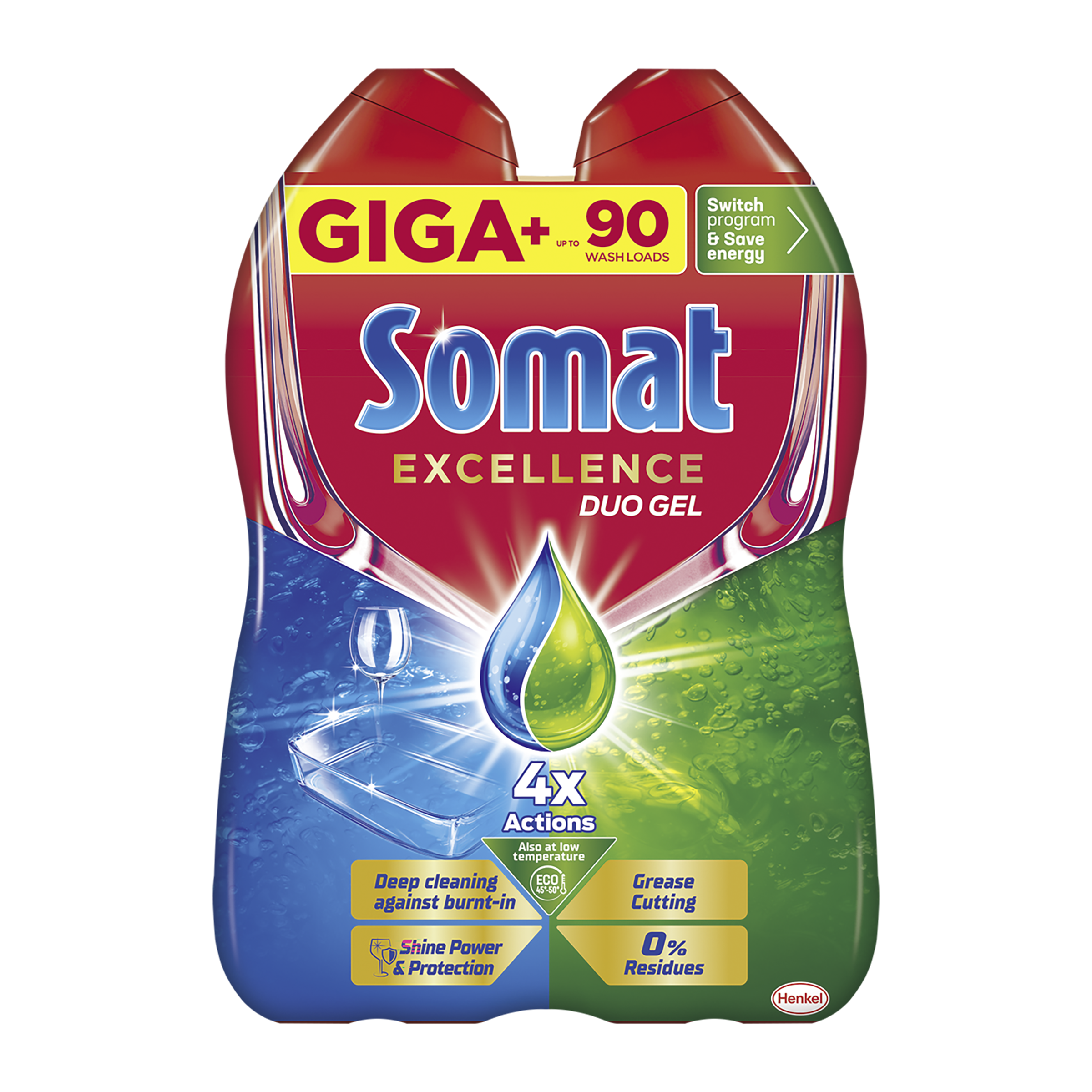 Ochrana proti skvrnám od vodního kamene. Somat Excellence Duo Gel - naše nejlepší složení Somat gelu zajišťuje účinné čištění a brilantní lesk i při nízkých teplotách na eco a krátké programy. Jedinečná kombinace dvou doplňujících se receptur poskytuje hloubkové čištění připálenin a silné odmašťovací účinky. Pro okamžitý efekt a extra lesk nádobí. I při nízkých teplotách na eco a krátké programy zanechá za sebou oslnivě čisté nádobí bez usazenin.