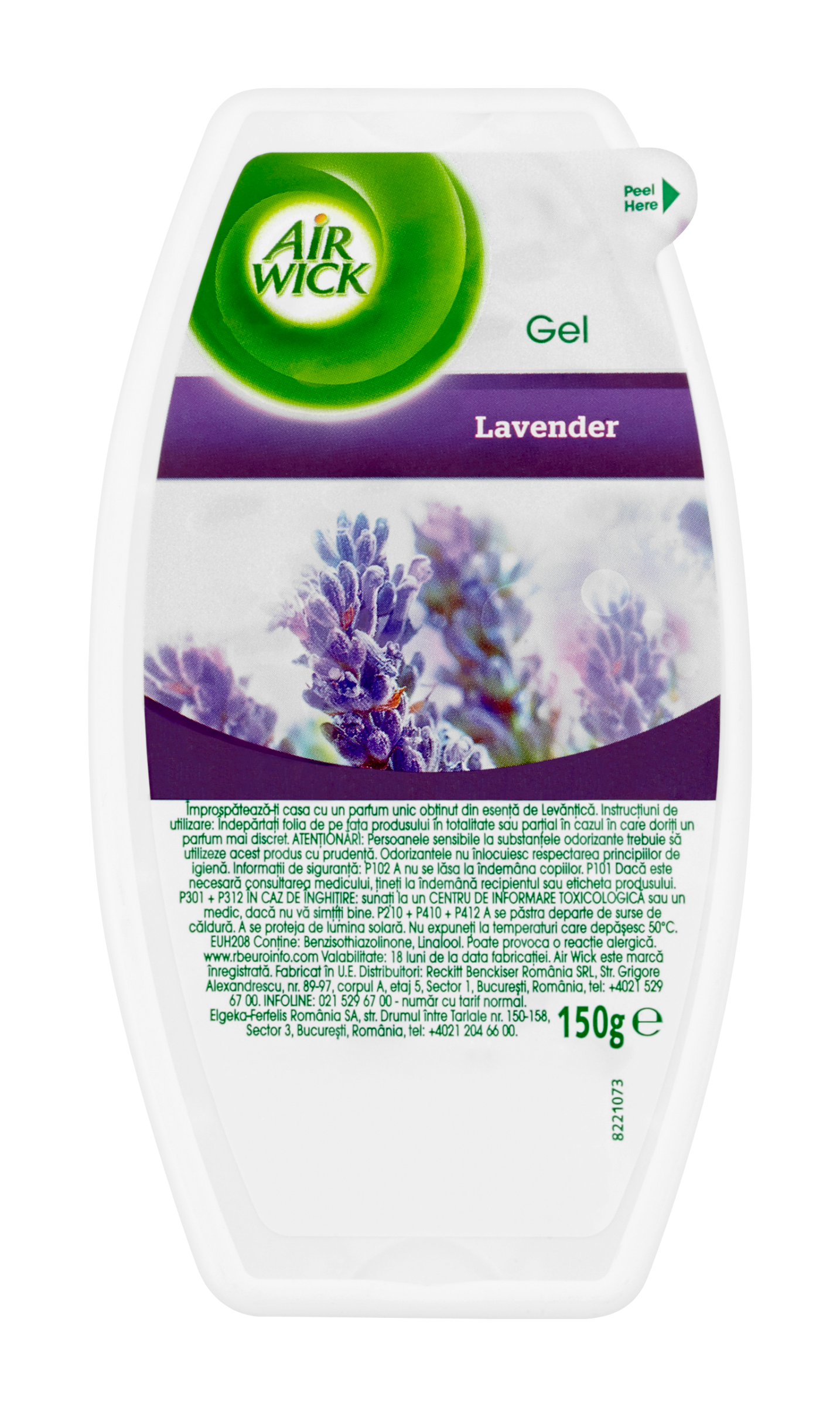 Vonný gel Air Wick s vůní levandule. Charakteristická vůně aromatické levandulové esence pomáhá eliminovat pachy.