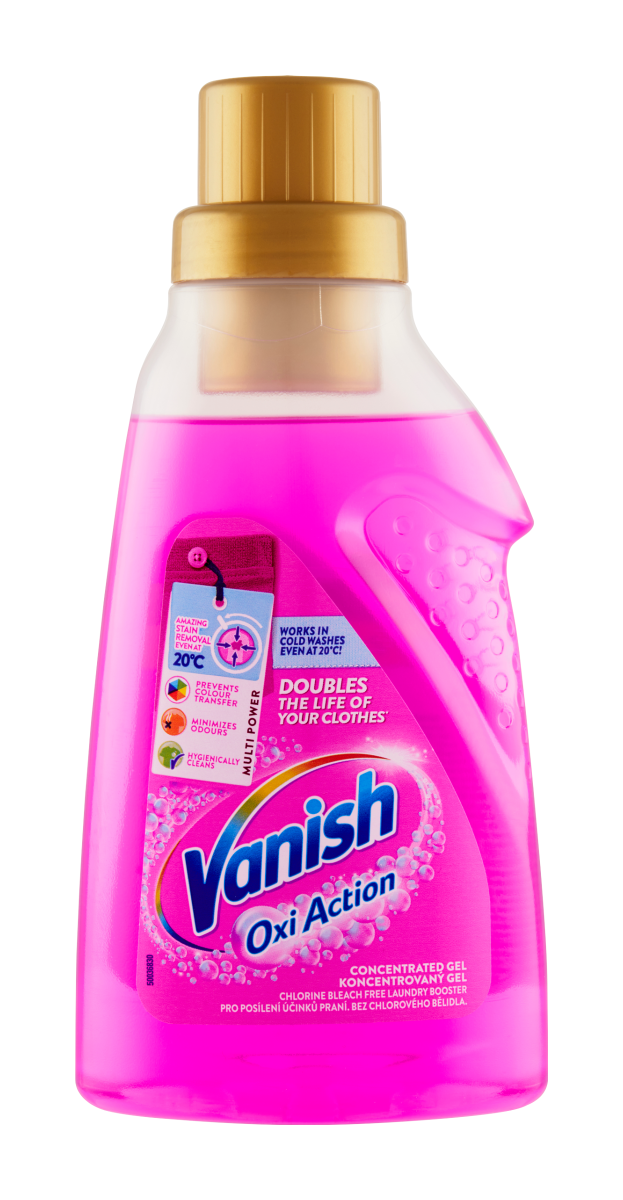 *Posílená ochrana barev a vlákna při použití přípravku Vanish spolu s tekutým pracím prostředkem při praní na 20 °C v porovnání s praním bez přípravku Vanish na 40 °C. Testováno na bavlněném oblečení. Bezpečný pro bílé i barevné prádlo, pro každodenní tkaniny jako je bavlna a polyester.