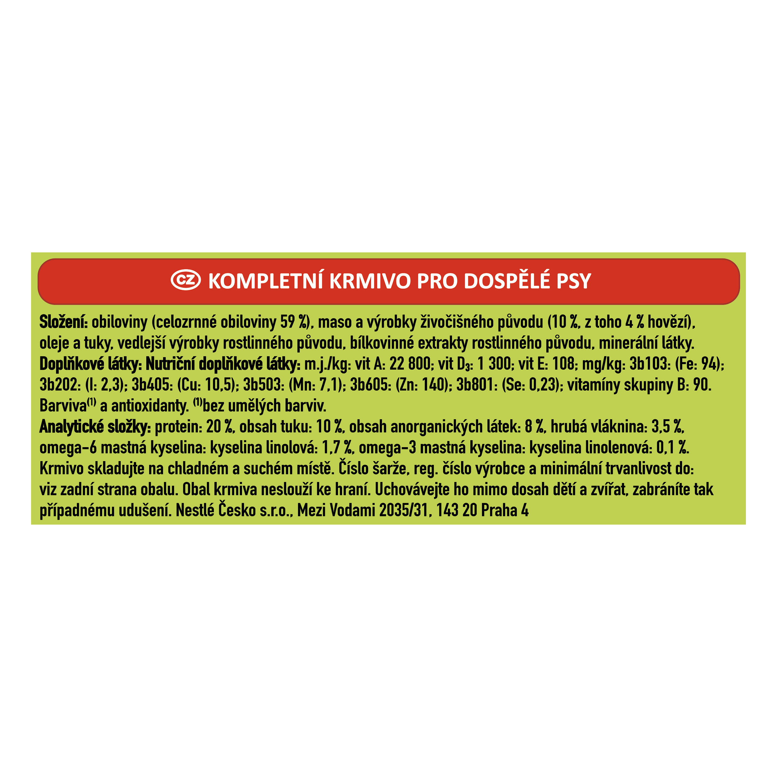 Složení: obiloviny (celozrnné obiloviny 59 %), maso a výrobky živočišného původu (10 %, z toho 4 % hovězí), oleje a tuky, vedlejší výrobky rostlinného původu, bílkovinné extrakty rostlinného původu, minerální látky.