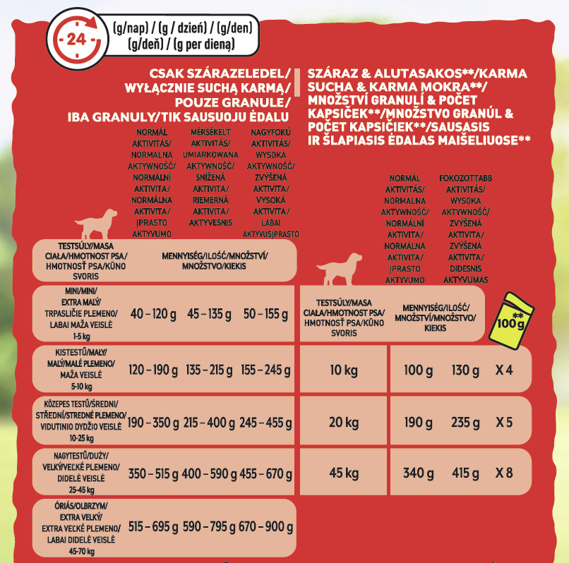 - Hmotnost psa 45 kg: Normální aktivita 340 g + 8 kapsiček, Zvýšená aktivita 415 g + 8 kapsiček.