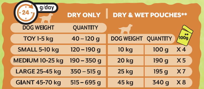 Krmný návod: Krmivo může být podáváno samostatně nebo v kombinaci s Friskies® kapsičkami: Denní krmná dávka pro dospělého psa: Pouze granule: Trpasličí plemena 1 – 5 kg: 40 – 120 g, Malá plemena 5 – 10 kg: 120 – 190 g, Středně velká plemena 10 – 25 kg: 190 – 350 g, Velká plemena 25 – 45 kg: 350 – 515 g, Extra velká plemena 45 – 70 kg: 515 – 695 g. Granule + počet kapsiček (100 g*): Hmotnost psa 10 kg: 100 g + 4 kapsičky; Hmotnost psa 20 kg: 190 g + 5 kapsiček, Hmotnost psa 25 kg: 195 g + 7 kapsiček, Hmotnost psa 45 kg: 340 g + 8 kapsiček. * jakákoliv "Friskies® kapsička ve šťávě 100 g" pro dospělé psy. Dostupnost se může v jednotlivých zemích lišit. Krmné dávky jsou určené pro dospělé středně aktivní psy v přirozeném prostředí. Individuální potřeby se mohou lišit. Krmnou dávku je třeba přizpůsobit tak, aby si váš pes udržel optimální hmotnost. Čerstvá pitná voda by měla být vždy k dispozici. Balení obsahuje krmivo zhruba pro následující počet misek (dní), záleží na velikosti balení: 10. Tato hodnota je spočítána pro dospělého psa o hmotnosti 20 kg za normální aktivity.