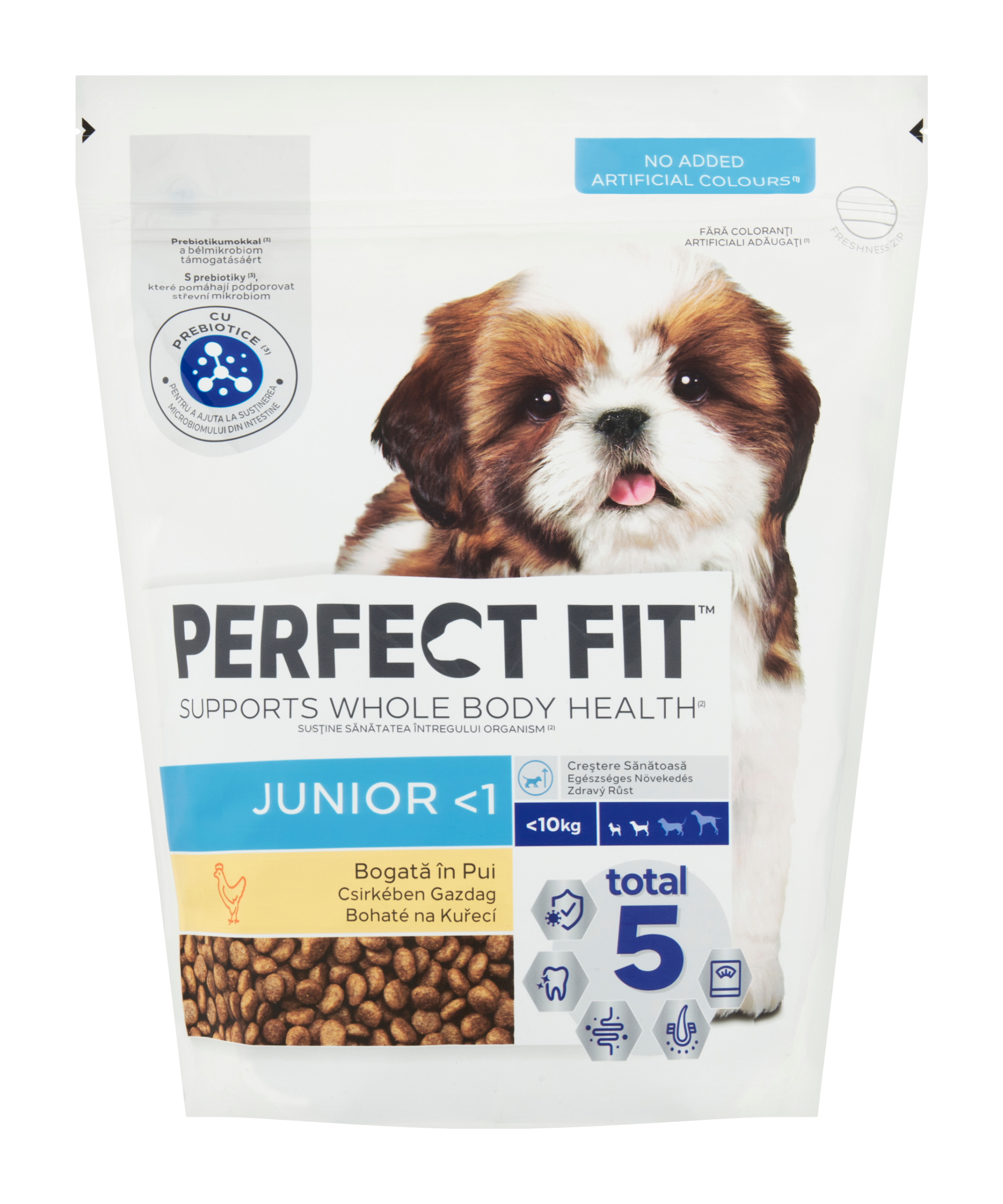 PERFECT FIT je vysoce kvalitní suché psí krmivo pro podporu mladistvého ducha vašeho psa během celého jeho života. Vyvinuto ve spolupráci s našimi veterináři a specialisty. Výrobek PERFECT FIT Total 5 z řady PERFECT FIT pozitivně přispívá ke zdraví psů v 5 hlavních oblastech a poskytuje komplexní ochranu, a to bez ohledu na jejich věk či životní styl. Jedinečná receptura výrobku PERFECT FIT Total 5 pozitivně přispívá ke zdraví psů v 5 hlavních oblastech: - zdravé zažívání - zdravé zuby - silná přirozená obranyschopnost - zdravá kůže a srst - udržování optimální hmotnosti a tělesné kondice Každý produkt z naší řady přináší také 3 další zdravotní benefity ušité na míru specifickým potřebám vašeho psa, takže si můžete být jisti, že mu poskytujete tu správnou výživu. Naše produkty jsou navíc vyrobeny z kvalitních bílkovin, takže vás můžeme ujistit, že váš pes je bude zbožňovat! 3 další benefity ušité na míru specifickým potřebám štěňat mini a malých plemen: - Zdravý růst: Optimální množství vápníku a fosforu, které podporují zdravý vývoj štěněte - Zdravý vývoj mozku: Krmivo PERFECT FIT je doplněno o DHA z přírodních zdrojů. DHA je živina, která se nachází také v mateřském mléce a je o ní známo, že působí blahodárně na rozvoj mozku - Menší velikost granulí: Velikost granule je uzpůsobena na míru velikosti tlamy malých plemen Všechny naše receptury suchého psího krmiva PERFECT FIT byly vyvinuty ve spolupráci s našimi veterináři a specialisty z Centra pro výživu domácích mazlíčků WALTHAM, čímž je zajištěna 100% kompletní a vyvážená výživa.