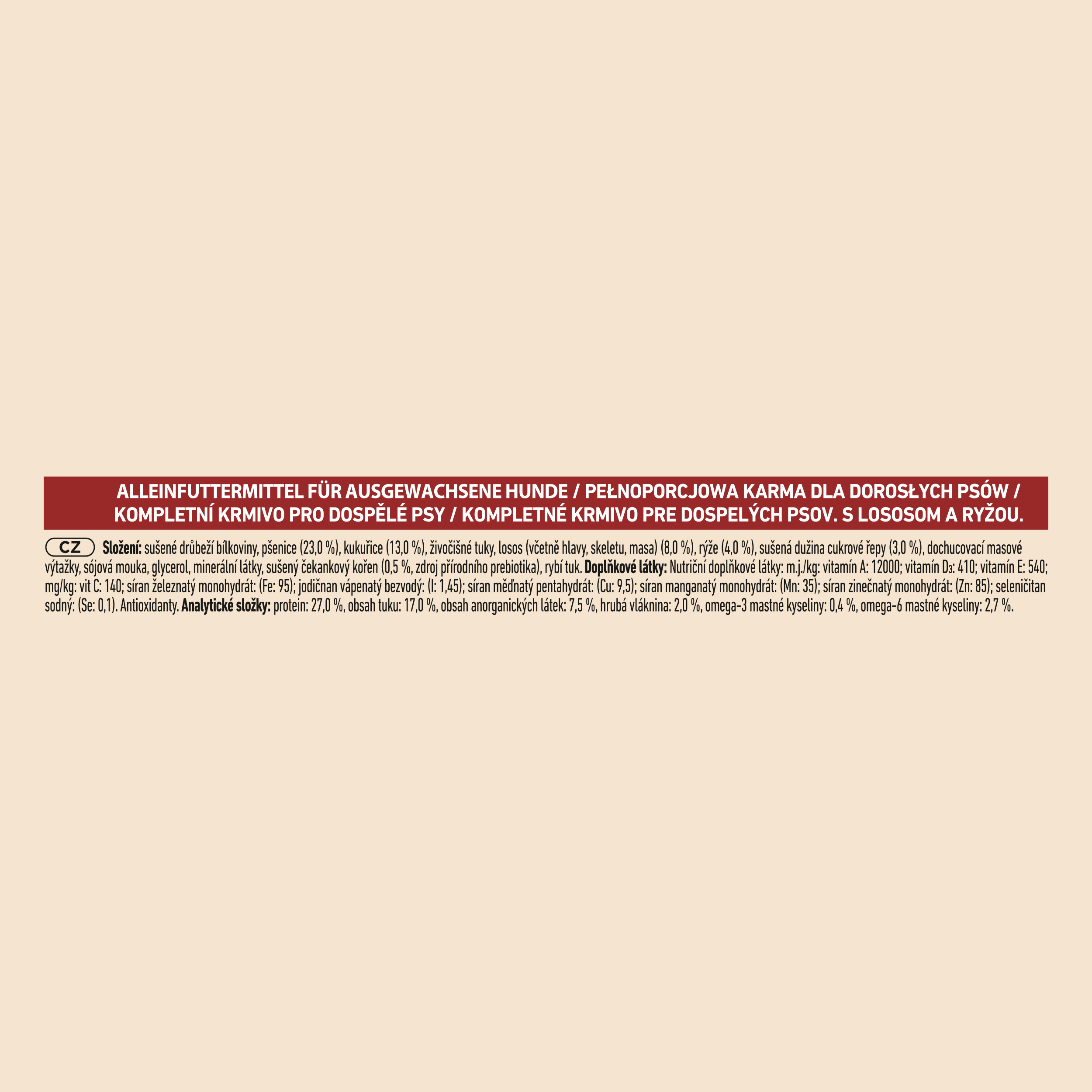 Složení: sušené drůbeží bílkoviny, pšenice (23,0 %), kukuřice (13,0 %), živočišné tuky, losos (včetně hlavy, skeletu, masa) (8,0 %), rýže (4,0 %), sušená dužina cukrové řepy (3,0 %), dochucovací masové výtažky, sójová mouka, glycerol, minerální látky, sušený čekankový kořen (0,5 %zdroj přírodního prebiotika), rybí tuk.