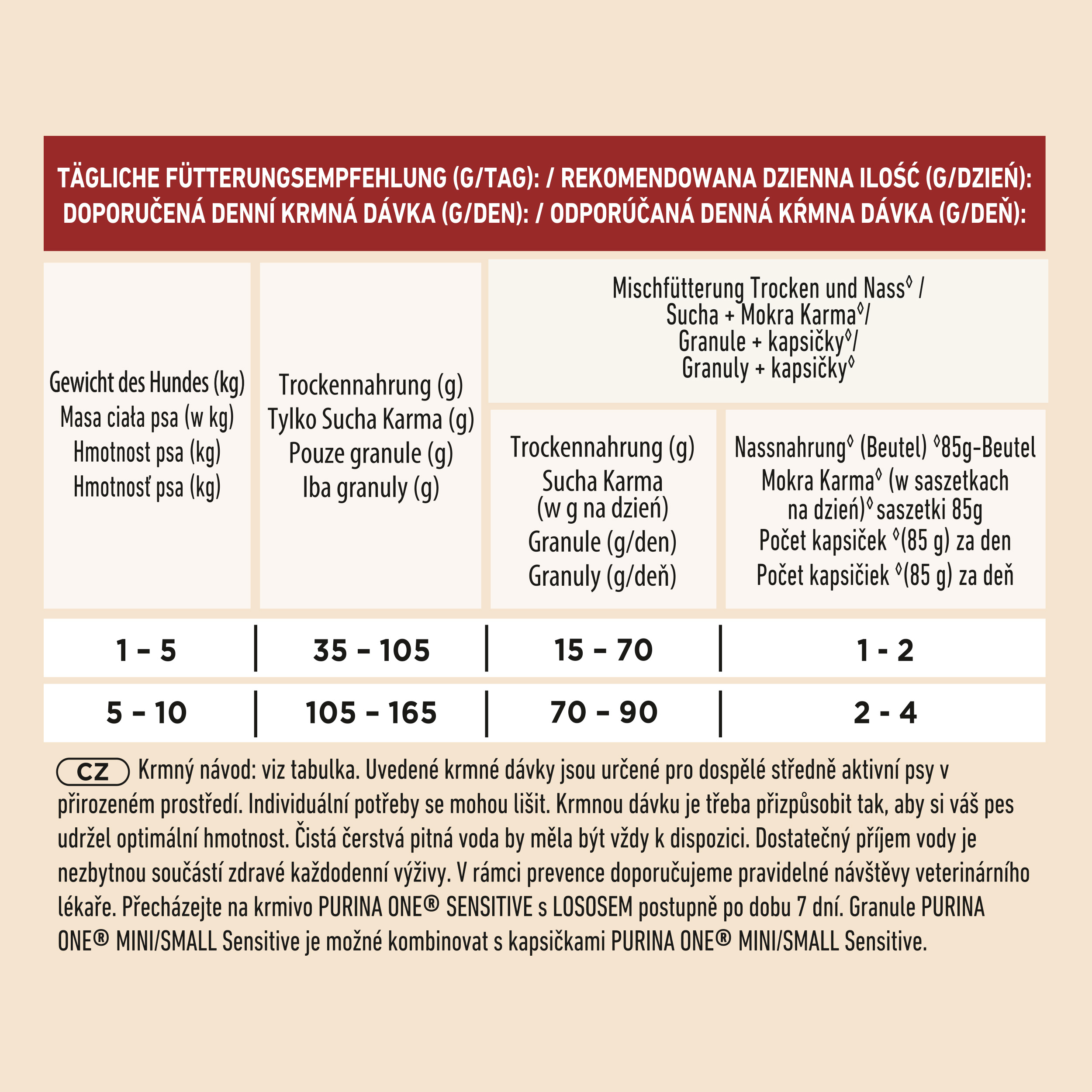 Krmný návod: Doporučená denní krmná dávka (g/den): Hmotnost psa 1-5 kg: pouze granule: 35-105 g, granule + kapsičky: granule: 15-70 g, počet kapsiček (85 g): 1-2; Hmotnost psa 5-10 kg: pouze granule: 105-165 g, granule + kapsičky: granule: 70-90 g, počet kapsiček (85 g): 2-4. Uvedené krmné dávky jsou určené pro dospělé středně aktivní psy v přirozeném prostředí. Individuální potřeby se mohou lišit. Krmnou dávku je třeba přizpůsobit tak, aby si Váš pes udržel optimální hmotnost. Čistá čerstvá pitná voda by měla být vždy k dispozici. Dostatečný příjem vody je nezbytnou součástí zdravé každodenní výživy. V rámci prevence doporučujeme pravidelné návštěvy veterinárního lékaře. Přecházejte na krmivo PURINA ONE SENSITIVE s LOSOSEM postupně po dobu 7 dní. Granule Purina ONE MINI/SMALL Sensitive je možné kombinovat s kapsičkami Purina ONE MINI/SMALL Sensitive.