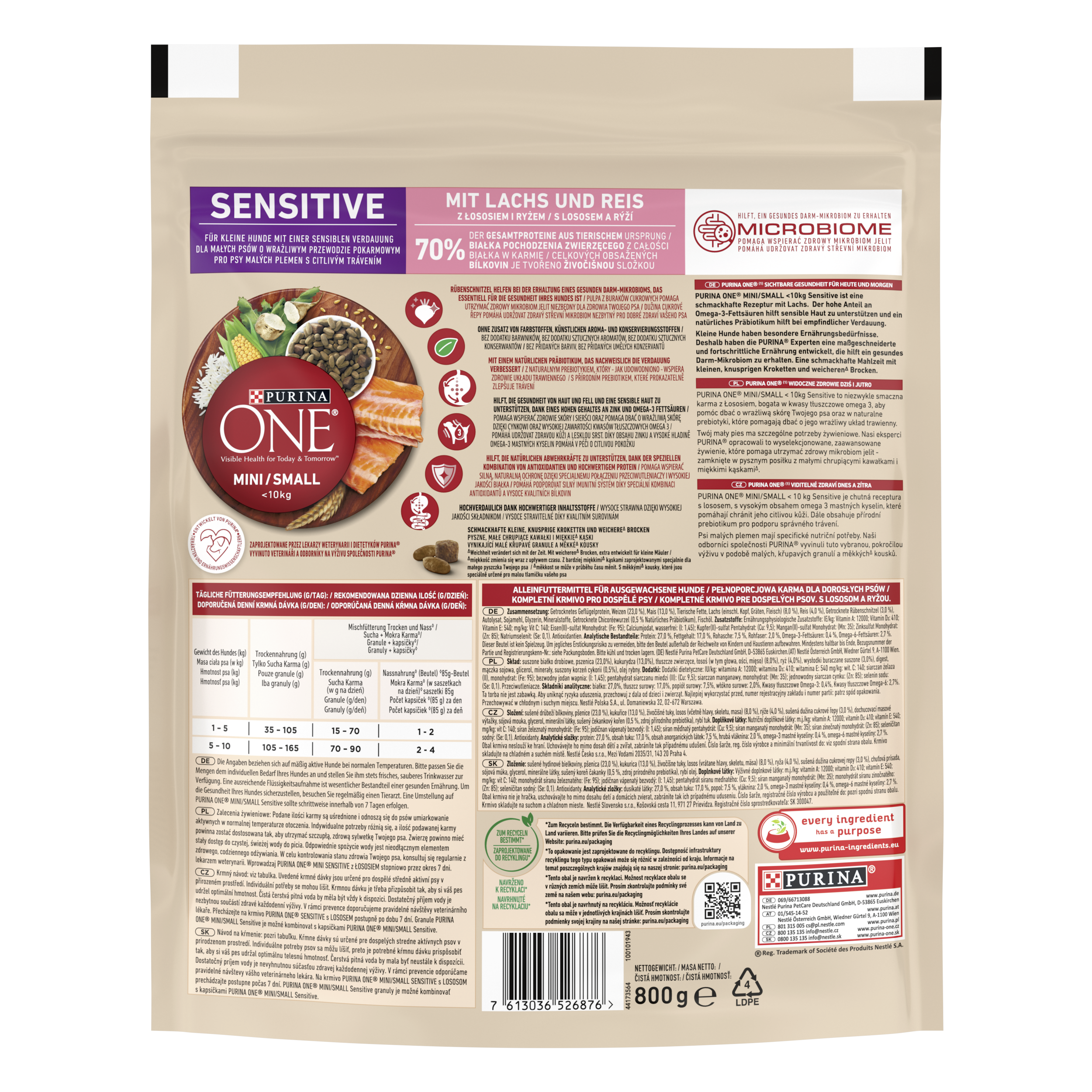 PURINA ONE MINI/SMALL < 10 kg Sensitive je chutná receptura s lososem, s vysokým obsahem omega 3 mastných kyselin, které pomáhají chránit jeho citlivou kůži. Dále obsahuje přírodní prebiotikum pro podporu správného trávení. Psi malých plemen mají specifické nutriční potřeby. Udržovat vyvážený střevní mikrobiom je nezbytné pro dobré zdraví vašeho psa. Vyvážený střevní mikrobiom je důležitý pro podporu správného zažívání, imunitního systému a celkového zdraví vašeho psa. A to je důvod, proč odborníci společnosti Purina vyvinuli Purina ONE MINI/SMALL < 10 kg. Pokročilá výživa, v podobě malých křupavých granulí a měkkých* kousků, která pomáhá udržovat zdravý střevní mikrobiom a je speciálně určená pro malou tlamičku vašeho psa. Tyto receptury pomáhají poskytovat potřebné živiny tak, aby vyhovovaly jeho nutričním potřebám. Vyzkoušejte Purina ONE MINI/SMALL < 10 kg a pozorujte viditelné výsledky na celkovém zdraví vašeho psa. *měkkost se může během času změnit