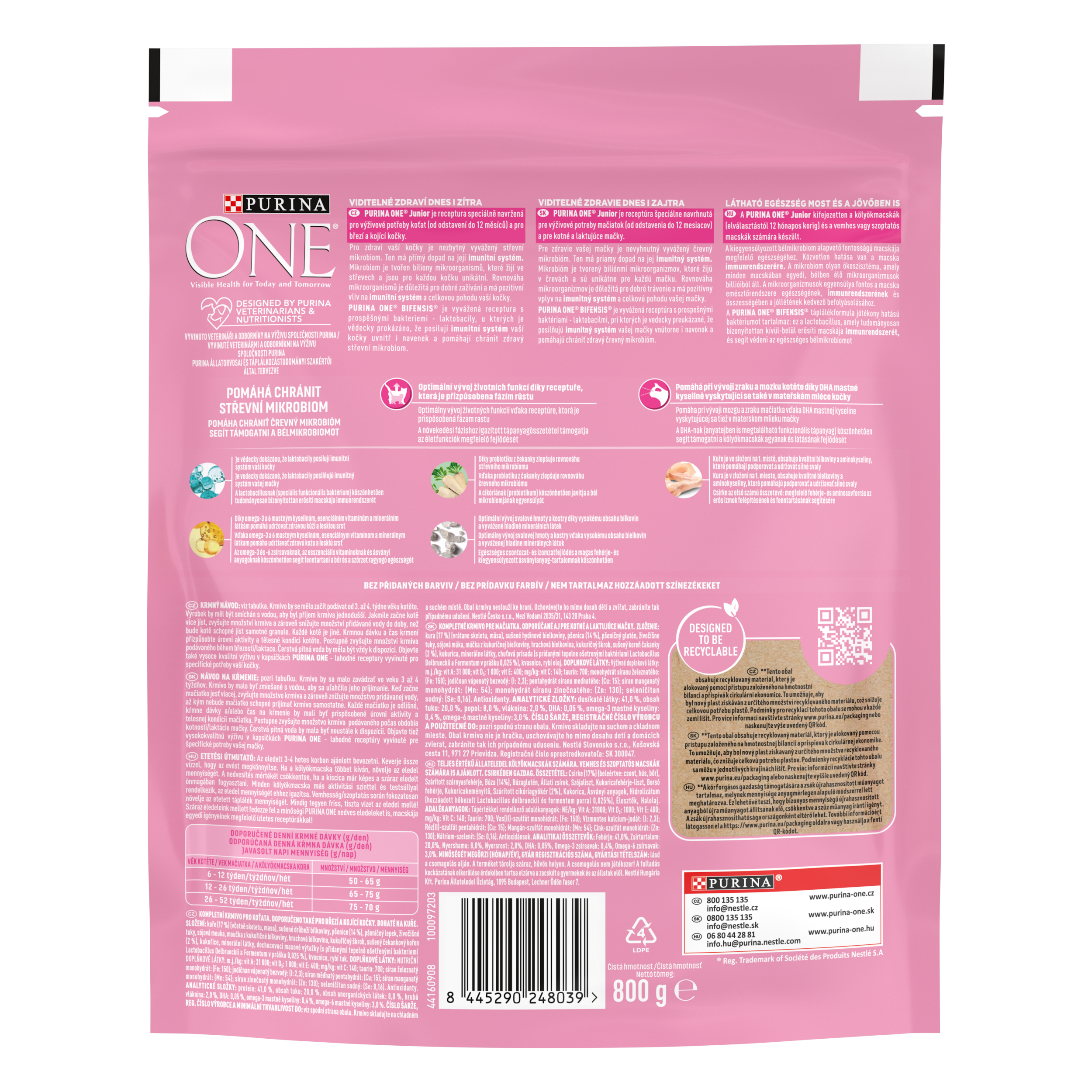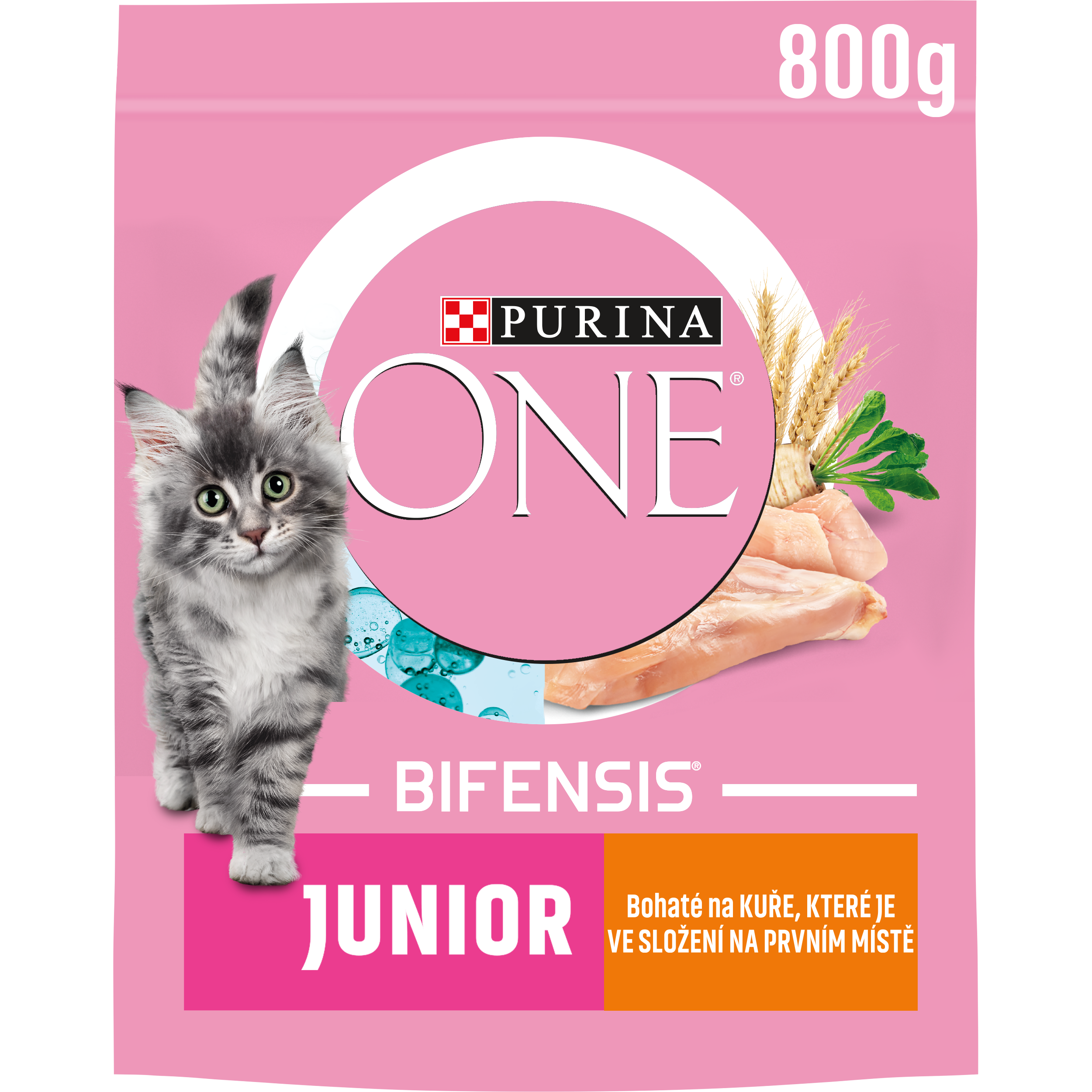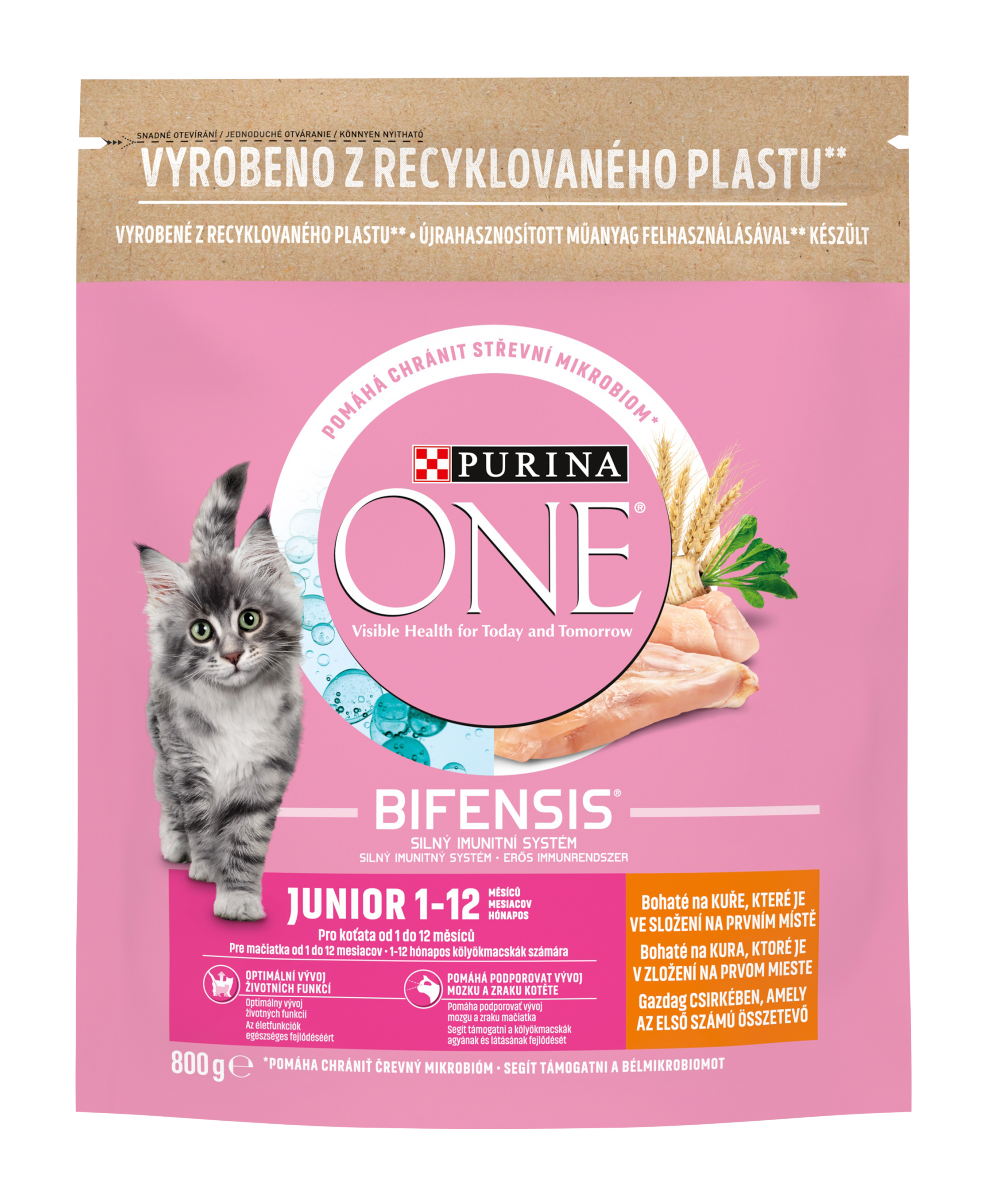 VIDITELNÉ ZDRAVÍ DNES I ZÍTRA Purina ONE Junior je receptura speciálně navržená pro výživové potřeby koťat (od odstavení do 12 měsíců) a pro březí a kojící kočky. Pro zdraví vaší kočky je nezbytný vyvážený střevní mikrobiom. Ten má přímý dopad na její imunitní systém. Mikrobiom je tvořen biliony mikroorganismů, které žijí ve střevech a jsou pro každou kočku unikátní. Rovnováha mikroorganismů je důležitá pro dobré zažívání a má pozitivní vliv na imunitní systém a celkovou pohodu vaší kočky. PURINA ONE BIFENSIS je vyvážená receptura s prospěšnými bakteriemi - laktobacily, u kterých je vědecky prokázáno, že posilují imunitní systém vaší kočky uvnitř i navenek a pomáhají chránit zdravý střevní mikrobiom