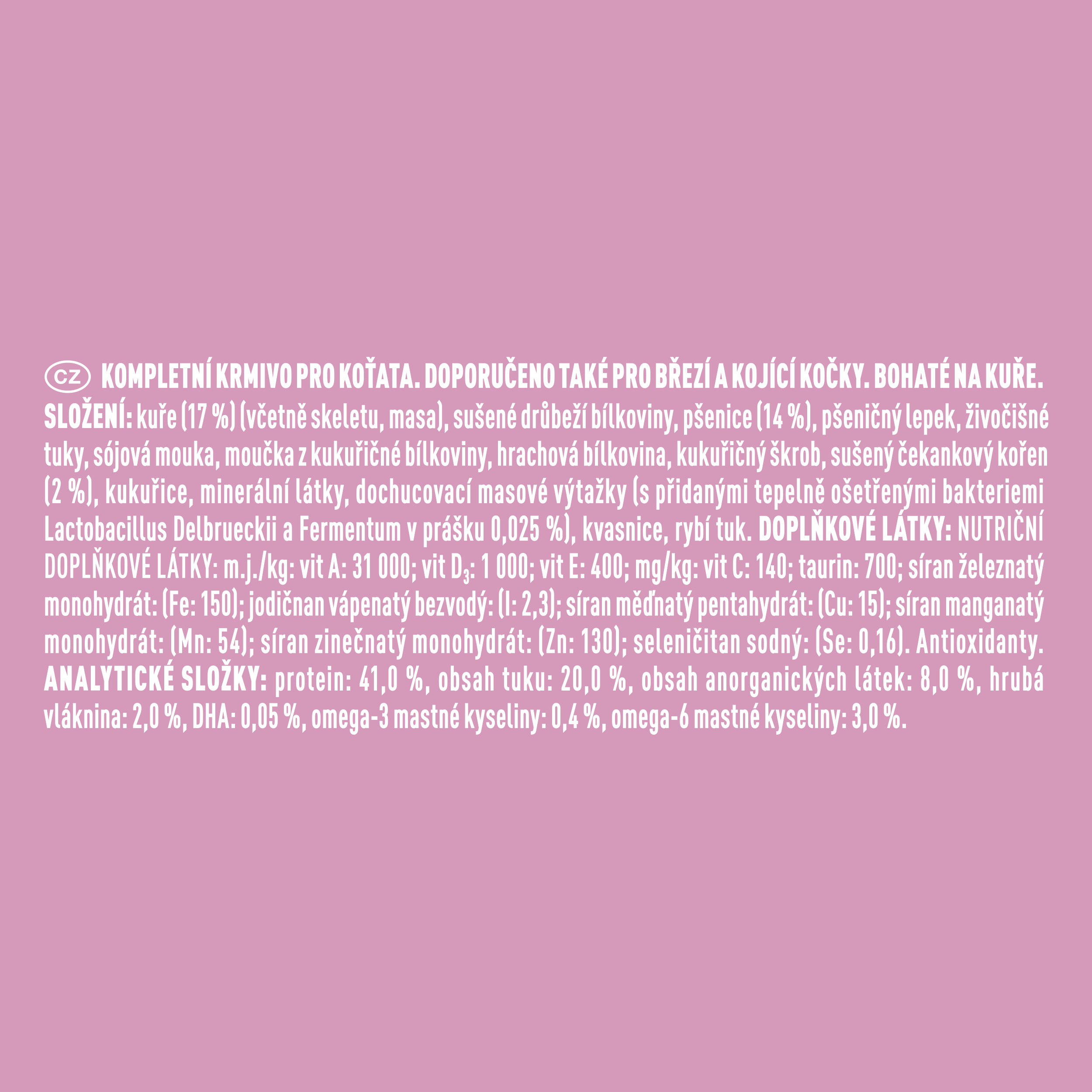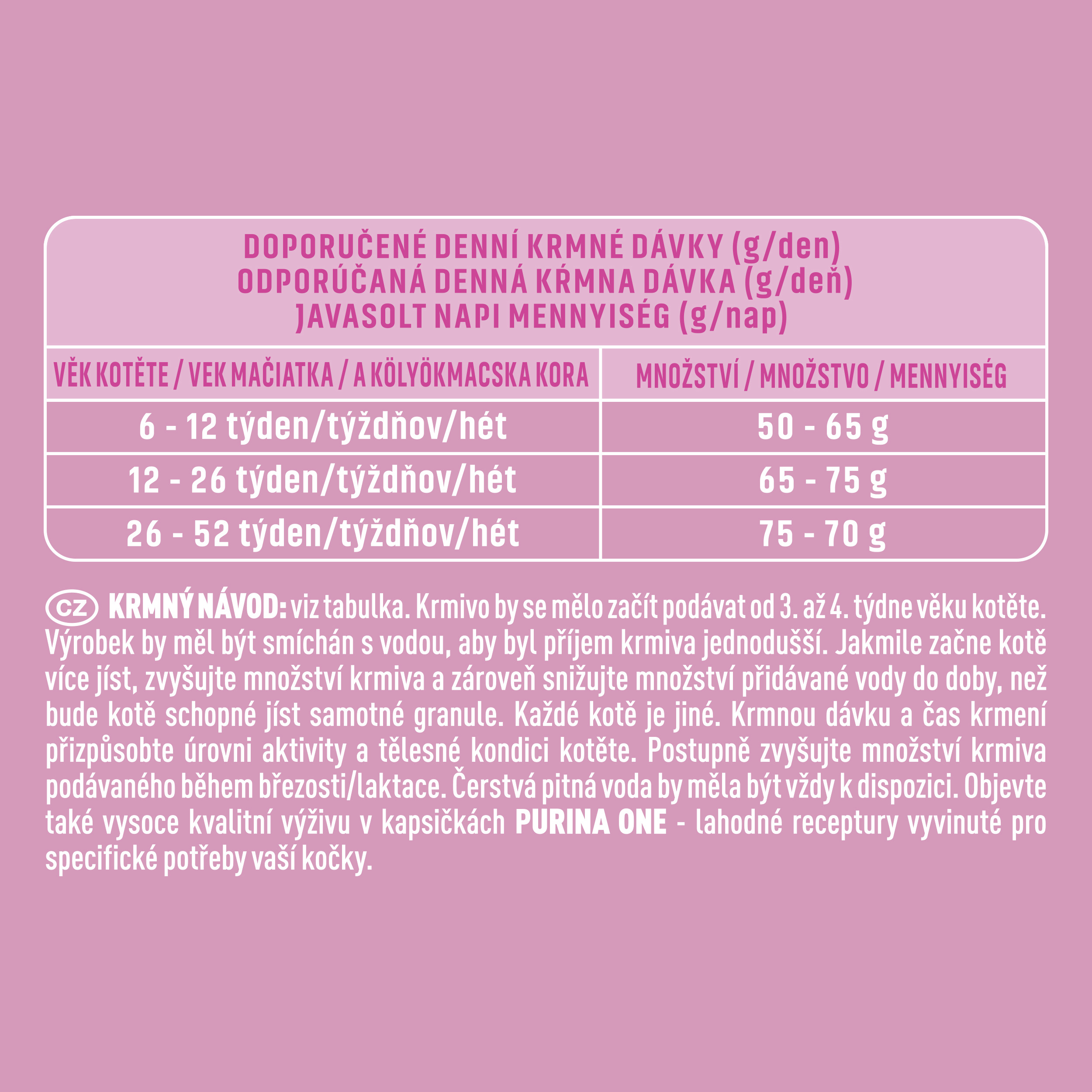 Krmný návod: Krmivo by se mělo začít podávat od 3. až 4. týdne věku kotěte. Výrobek by měl být smíchán s vodou, aby byl příjem krmiva jednodušší. Jakmile začne kotě více jíst, zvyšujte množství krmiva a zároveň snižujte množství přidávané vody do doby, než bude kotě schopné jíst samotné granule. Každé kotě je jiné. Krmnou dávku a čas krmení přizpůsobte úrovni aktivity a tělesné kondici kotěte. Postupně zvyšujte množství krmiva podávaného během březosti/laktace. Čerstvá pitná voda by měla být vždy k dispozici. Objevte také vysoce kvalitní výživu v kapsičkách Purina ONE - lahodné receptury vyvinuté pro specifické potřeby vaší kočky.
