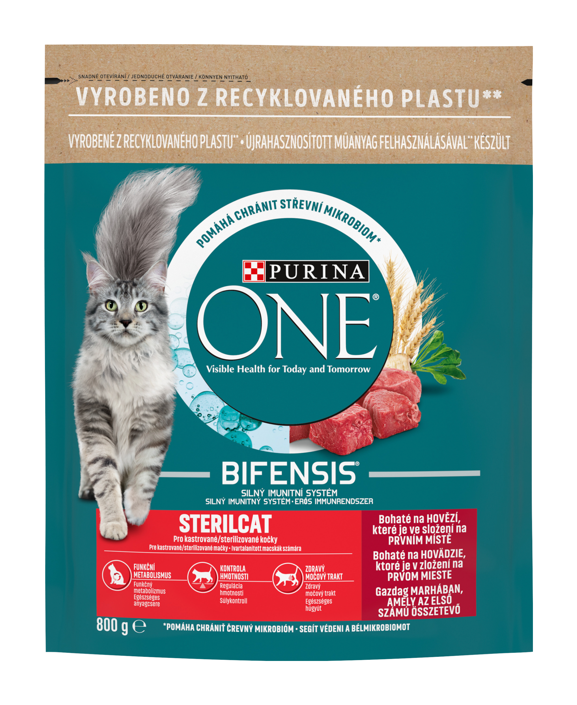 VIDITELNÉ ZDRAVÍ DNES I ZÍTRA PURINA ONE Sterilcat je receptura s výživovým profilem přizpůsobeným pro kastrované/sterilizované kočky. Pro zdraví vaší kočky je nezbytný vyvážený střevní mikrobiom. Ten má přímý dopad na její imunitní systém. Mikrobiom je tvořen biliony mikroorganismů, které žijí ve střevech a jsou pro každou kočku unikátní. Rovnováha mikroorganismů je důležitá pro dobré zažívání a má pozitivní vliv na imunitní systém a celkovou pohodu vaší kočky. PURINA ONE BIFENSIS je vyvážená receptura s prospěšnými bakteriemi - laktobacily, u kterých je vědecky prokázáno, že posilují imutní systém vaší kočky uvnitř i navenek a pomáhají chránit zdravý střevní mikrobiom.