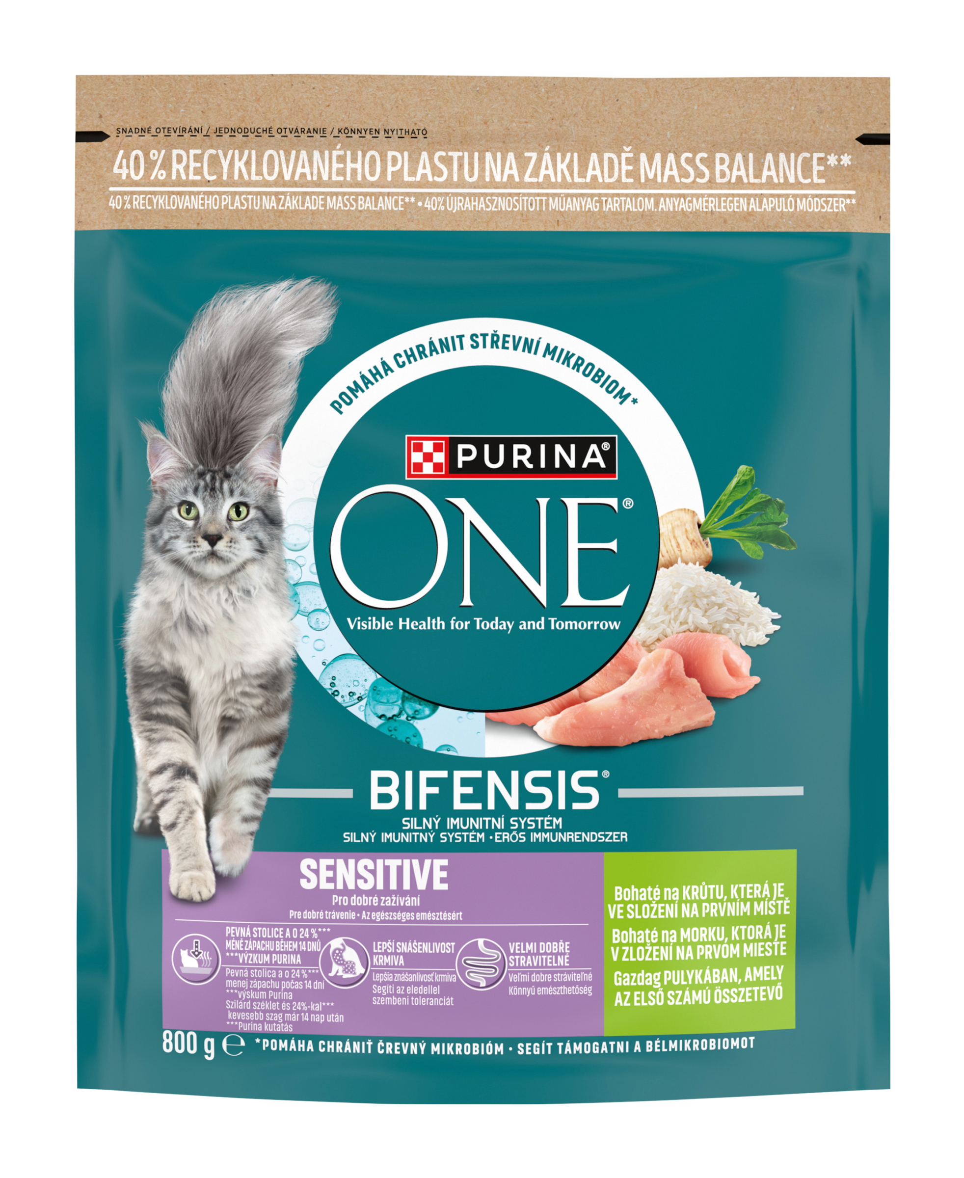 VIDITELNÉ ZDRAVÍ DNES I ZÍTRA PURINA ONE Sensitive je receptura speciálně navržená pro kočky s citlivým zažíváním a malou chutí k jídlu. Pro zdraví vaší kočky je nezbytný vyvážený střevní mikrobiom. Ten má přímý dopad na její imunitní systém. Mikrobiom je tvořen biliony mikroorganismů, které žijí ve střevech a jsou pro každou kočku unikátní. Rovnováha mikroorganismů je důležitá pro dobré zažívání a má pozitivní vliv na imunitní systém a celkovou pohodu vaší kočky. PURINA ONE BIFENSIS je vyvážená receptura s prospěšnými bakteriemi - laktobacily, u kterých je vědecky prokázáno, že posilují imunitní systém vaší kočky uvnitř i navenek a pomáhají chránit zdravý střevní mikrobiom