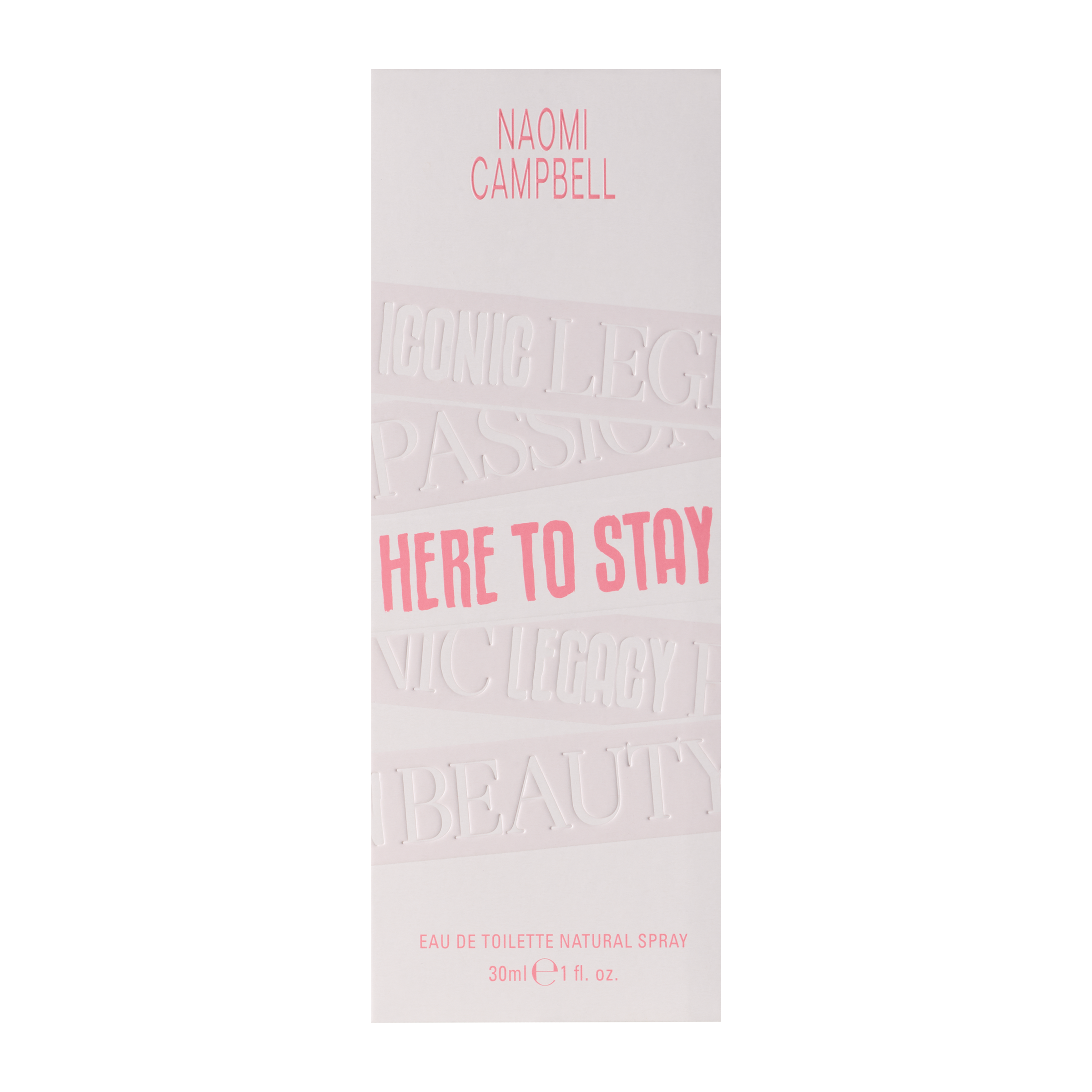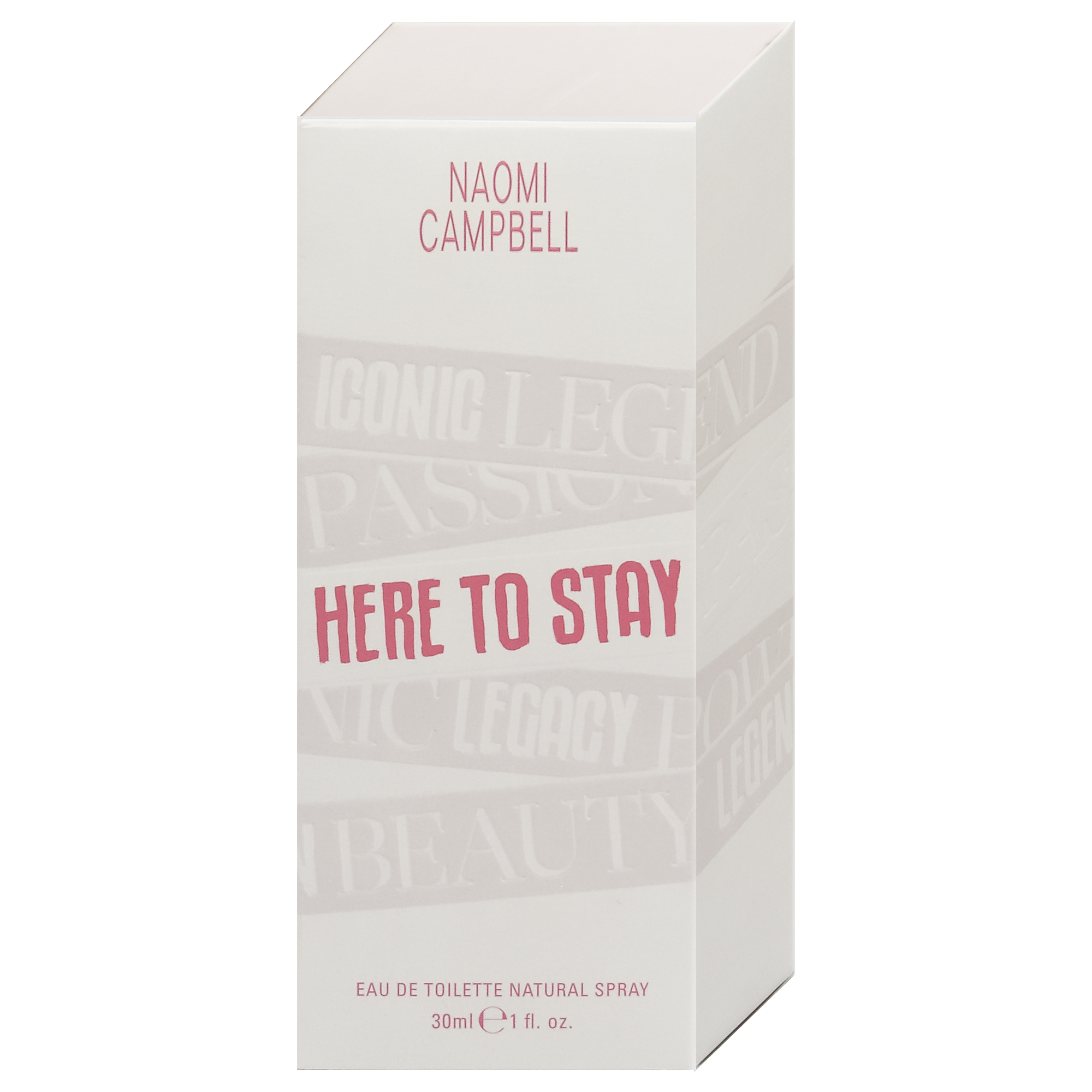 Naomi Campbell Here To Stay je jiskřivá květinově-ovocná kompozice určená silným a sebevědomým ženám. Vévodí jí šťavnaté tóny malin a červeného rybízu prolínající se s opojným srdcem z jasmínu a růží, ovinutým něžně smyslným spojením vanilky a pižma.
