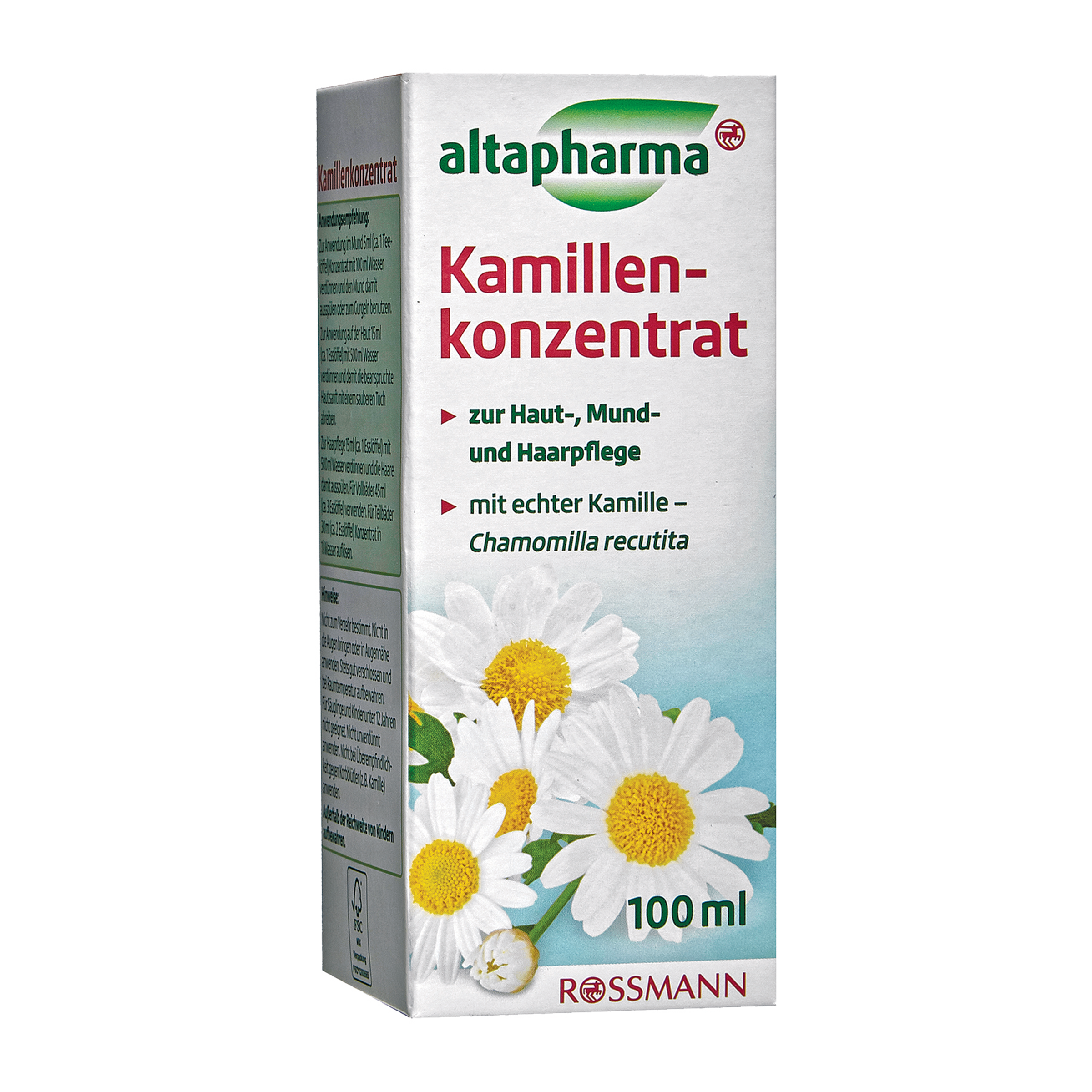 Heřmánek pravý je díky své spolehlivé účinnosti po generace ceněn jako léčivá bylina. Heřmánek obsažený v heřmánkovém koncentrátu altapharma se vyznačuje rozmanitými možnostmi použití. Heřmánkový koncentrát altapharma lze tedy použít jednak k péči o vlasy a ústní dutinu, a stejně tak k ošetření namáhané pokožky. Heřmánkový koncentrát altapharma je vhodný i jako přísada do koupele.