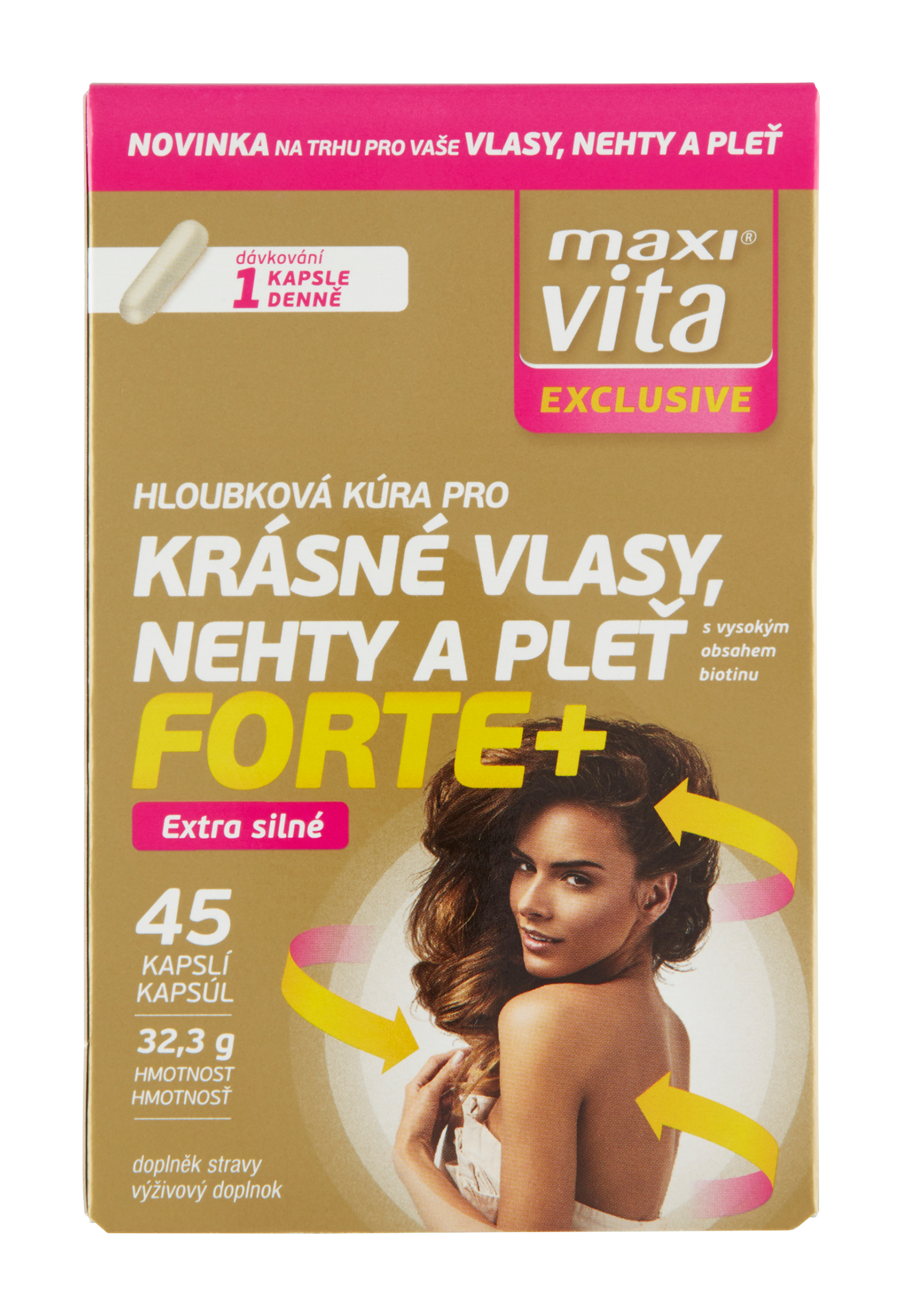 MaxiVita@ Exclusive Hloubková kúra pro krásné vlasy, nehty a pleť. Vyvážená kombinace důležitých aminokyselin, rostlinných extraktů a minerálních látek napomáhá péči o vaše vlasy zevnitř. Aminokyseliny jsou základními stavebními kameny keratinu, který má vliv na kvalitu a vzhled vlasů a nehtů. Biotin pomáhá zachovat kvalitu vlasů a pleti. Hloubková kůra pro krásné vlasy, nehty a pleť: