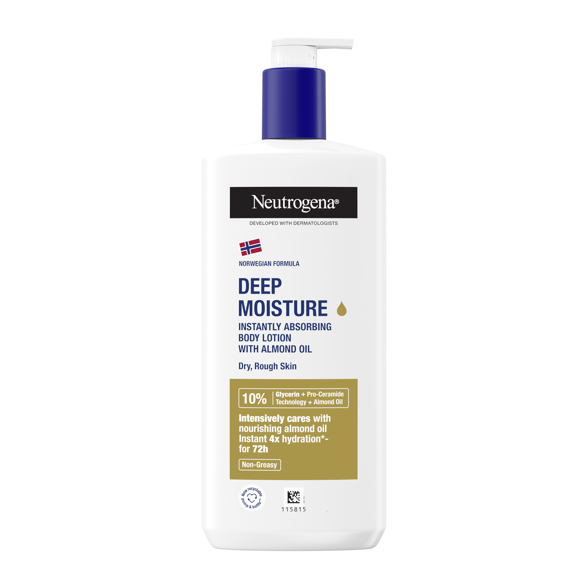 Neutrogena® Norská receptura Hloubkově hydratační tělové mléko s mandlovým olejem. Pro suchou, hrubou pokožku. Nemastné mléko obohacené o mandlový olej intenzivně pečuje o pokožku a okamžitě jí dodává 4x více hydratace*, bez lepivého pocitu. Kožní bariéra, tvořená více než 100 ceramidy, udržuje přirozenou hydrataci a zdravý vzhled pokožky. Pokud je vaše kůže suchá, je čas na doplnění ceramidů. Nová pro-ceramide technologie inovativním způsobem posiluje esenciální ceramidy pokožky. Mandlový olej pokožku vyživuje a zanechává ji hebkou. Okamžitě se vstřebává do pokožky, takže se můžete ihned obléknout. Intenzivně hydratuje po dobu 72 hodin. Složení s vysokou tolerancí, vhodné i pro citlivou pokožku. *v porovnání s neošetřenou pokožkou.