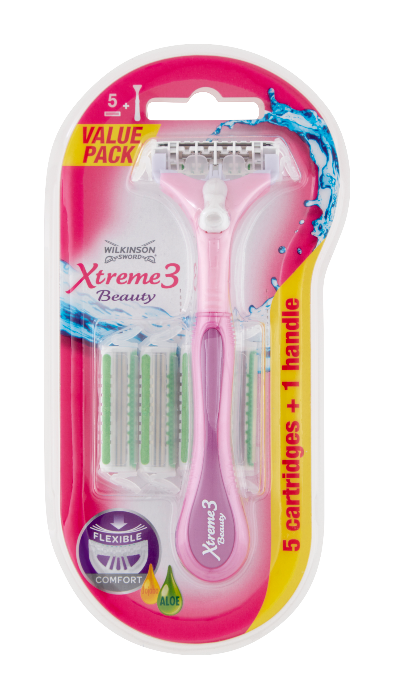 Holicí strojek Xtreme3 Beauty s výměnnými hlavicemi disponuje 3 flexibilními břity a zvlhčujícím proužkem.