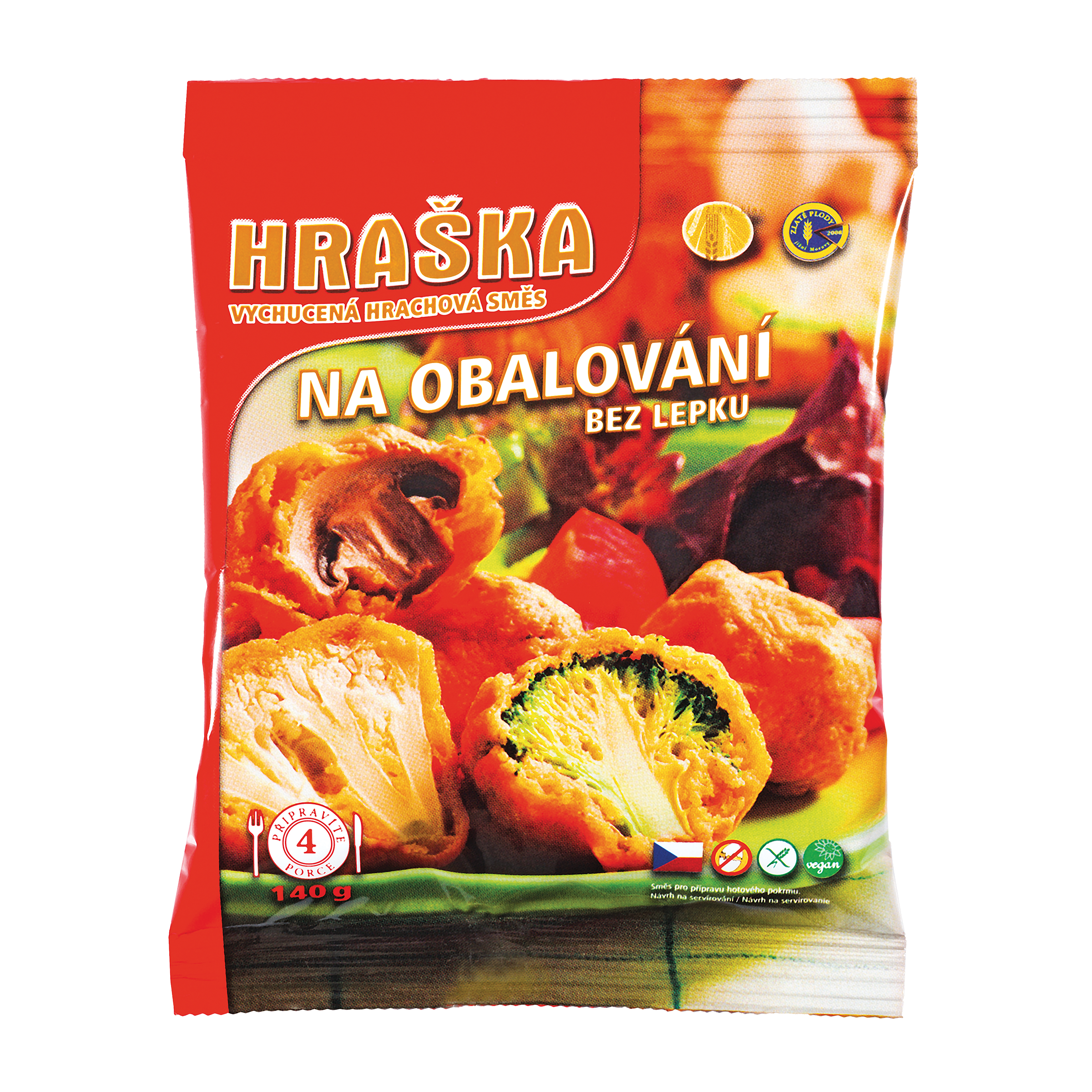 Návod na přípravu: Řízky - květák, brokolice, žampiony aj. Recept na 4 porce, 1 porce = 100 g: Smícháme 100 g Hrašky a 150 ml vody na těstíčko (hustota řidší jako je hořčice). Naporcujeme 300 g zeleniny. Kousky zeleniny namáčíme v těstíčku. Klademe je do vyšší vrstvy rozehřátého oleje (160 °C) a smažíme. Zahušťování Hraška dobře zahušťuje i polévky a omáčky. Polévky: 1 lžíce Hrašky (30 g) zahustí 1,5 l polévky. Omáčky: 50 g Hrašky zahustí 600 ml omáčky. Hrašku stačí rozmíchat ve studené vodě a 20 minut povařit! Namísto vejce 1 vejce = 20 g směsi Hraška + 40 ml vody. Směs Hraška můžeme použít i na přípravu placek, bramboráků, karbanátků a sekané. V těchto receptech směs Hraška použijeme namísto vajíček, strouhanky i mouky. Směs Hraška stačí rozmíchat ve studené vodě na těstíčko a namáčením řízků do těstíčka obalovat! Balená potravina určená ke spotřebě po nezbytné tepelné úpravě.