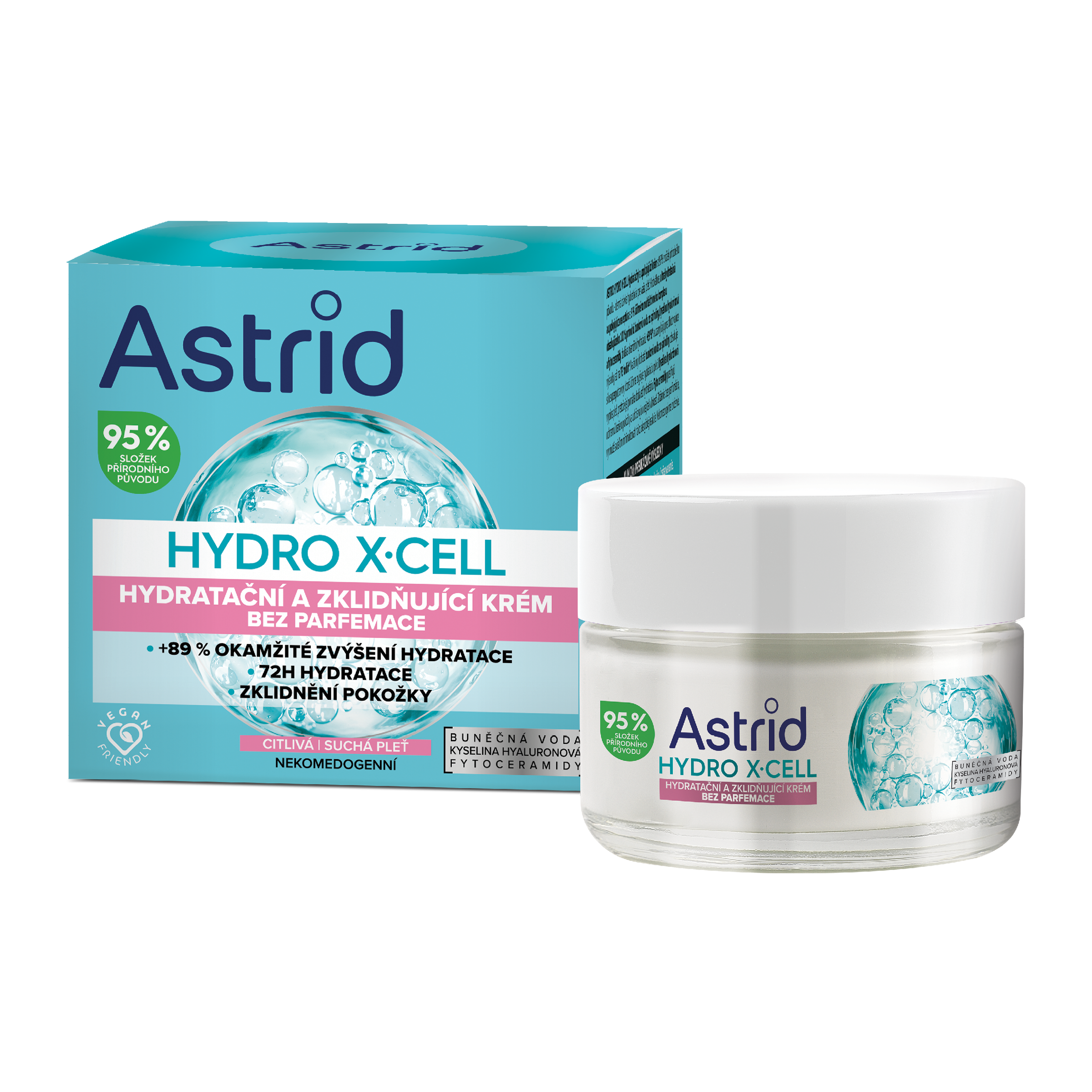 Astrid Hydro X·Cell Hydratační a zklidňující krém s 95 % složek přírodního původu - denní dávka hydratace pro vaši pleť. Hedvábná, ultrahydratační a zklidňující receptura s 5 % účinného multiaktivního komplexu obsahujícího 100 % přírodní buněčnou vodu ze spiruliny, kyselinu hyaluronovou a fytoceramidy dodává okamžitou hydrataci +89 %* a uzamyká ji pro dlouhotrvající výsledky až na 72 hodin*. Na živiny bohatá buněčná voda ze spiruliny obsahuje sílu superpotraviny, která účinně zvyšuje hydratací pleti. Kyselina hyaluronová vypíná pleť, protože jí pomáhá dodávat hydrataci. Fytoceramidy posilují ochrannou bariéru pleti a udržují v ní tak vlhkost. Složení bez parfemace, vyvinuté s cílem minimalizovat riziko alergické reakce. Nekomedogenní složení.