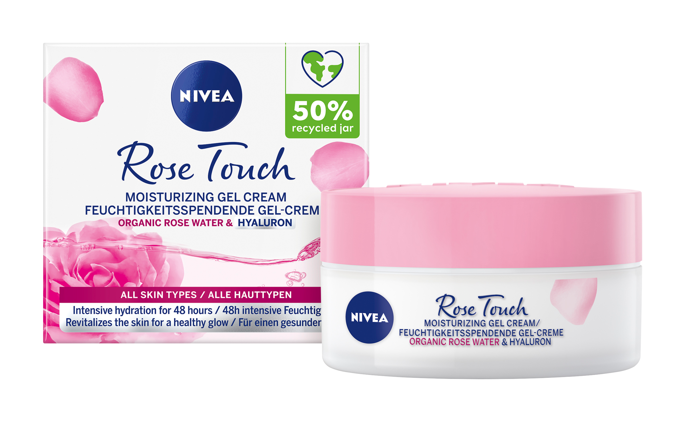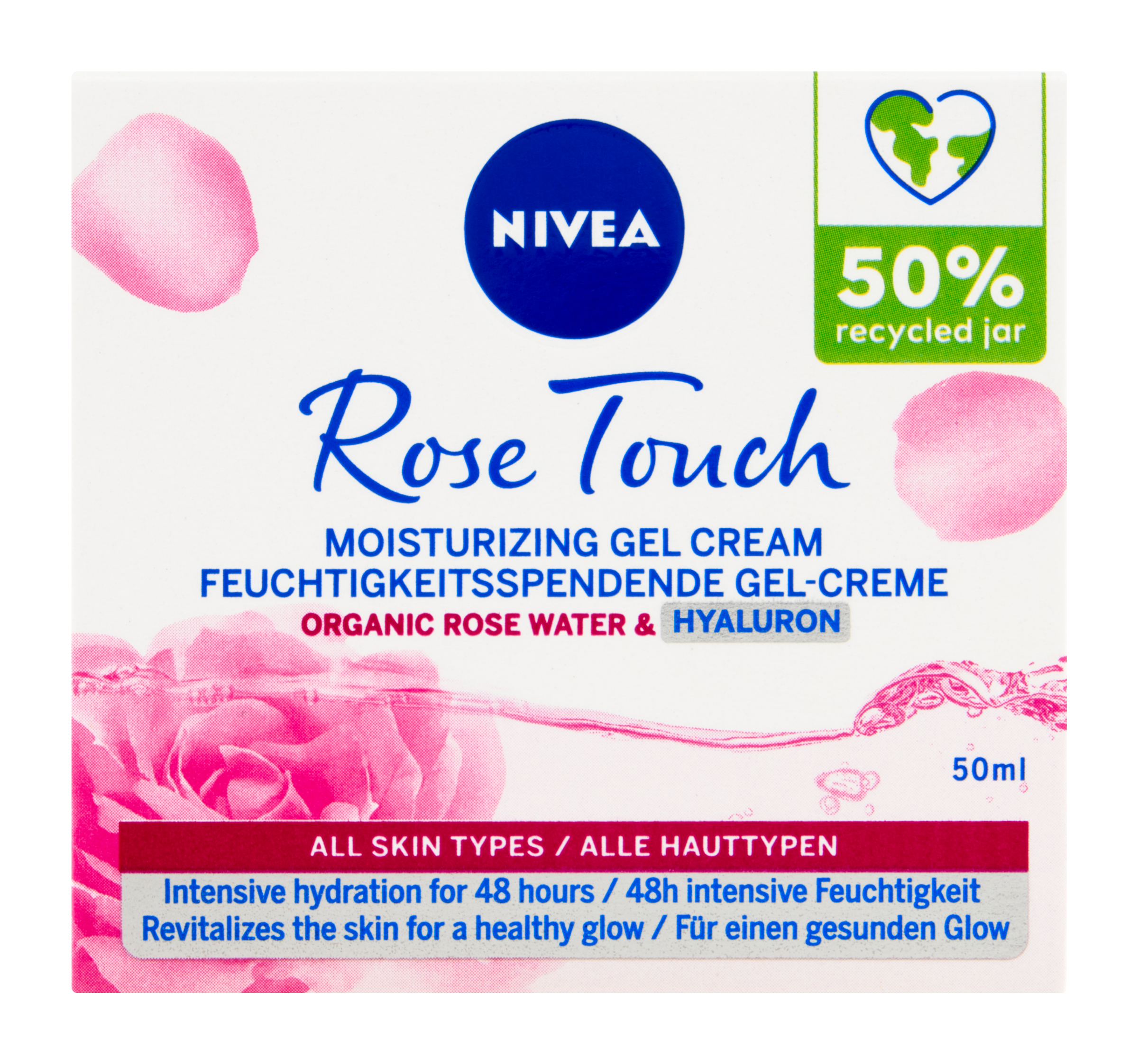 Nivea® Hydratační denní gel-krém Rose Touch s organickou růžovou vodou a kyselinou hyaluronovou revitalizuje pleť a intenzivně ji hydratuje po 48 h. Pleť zanechá jemnou, sametově hebkou a rozjasněnou. Rychle se vstřebávající gelové složení s delikátní vůní růží je vhodné pro všechny typy pleti včetně citlivé.