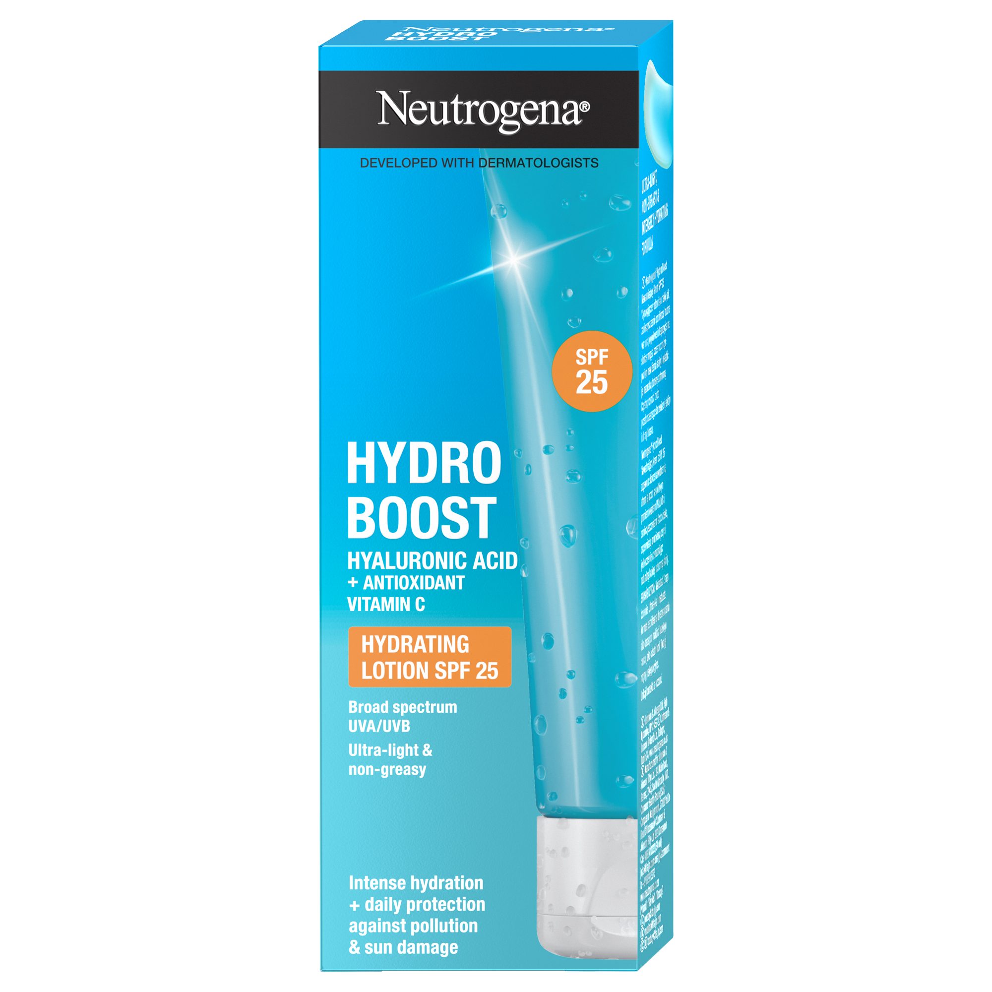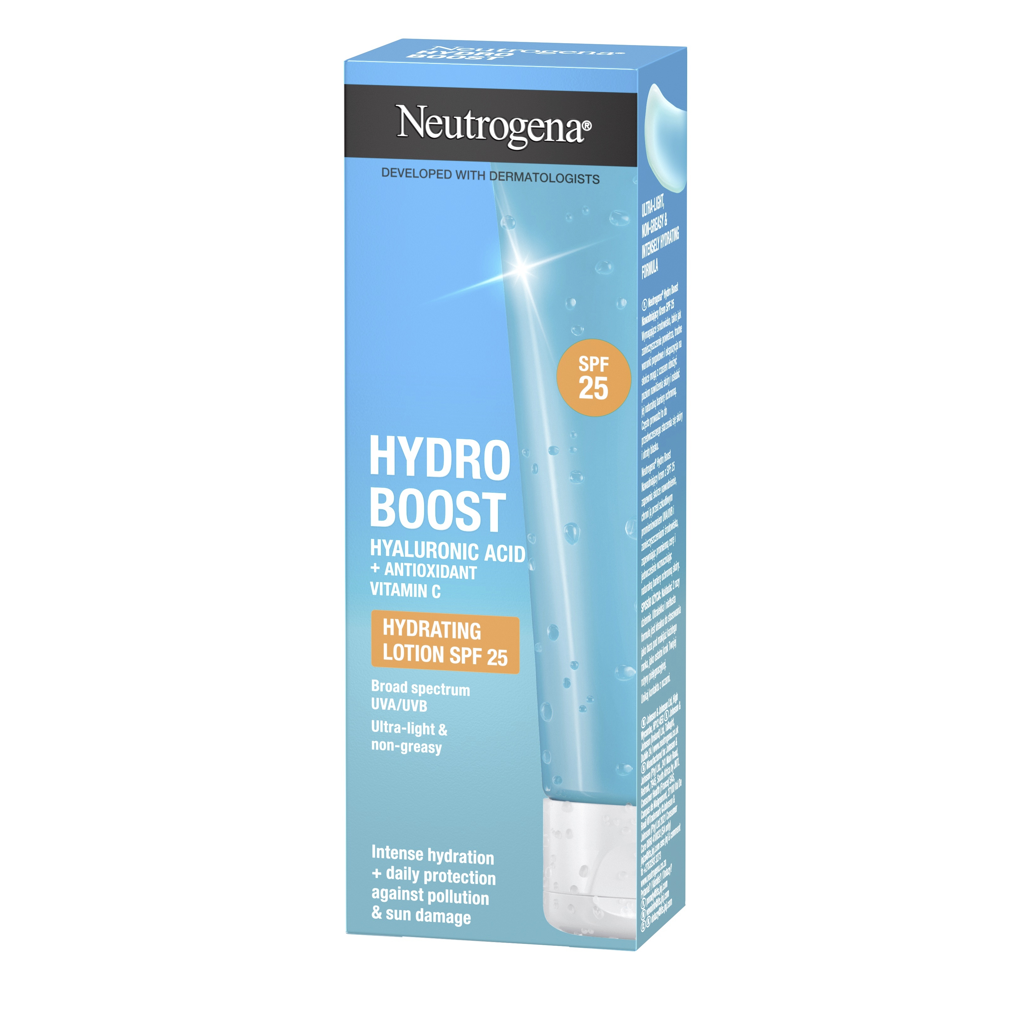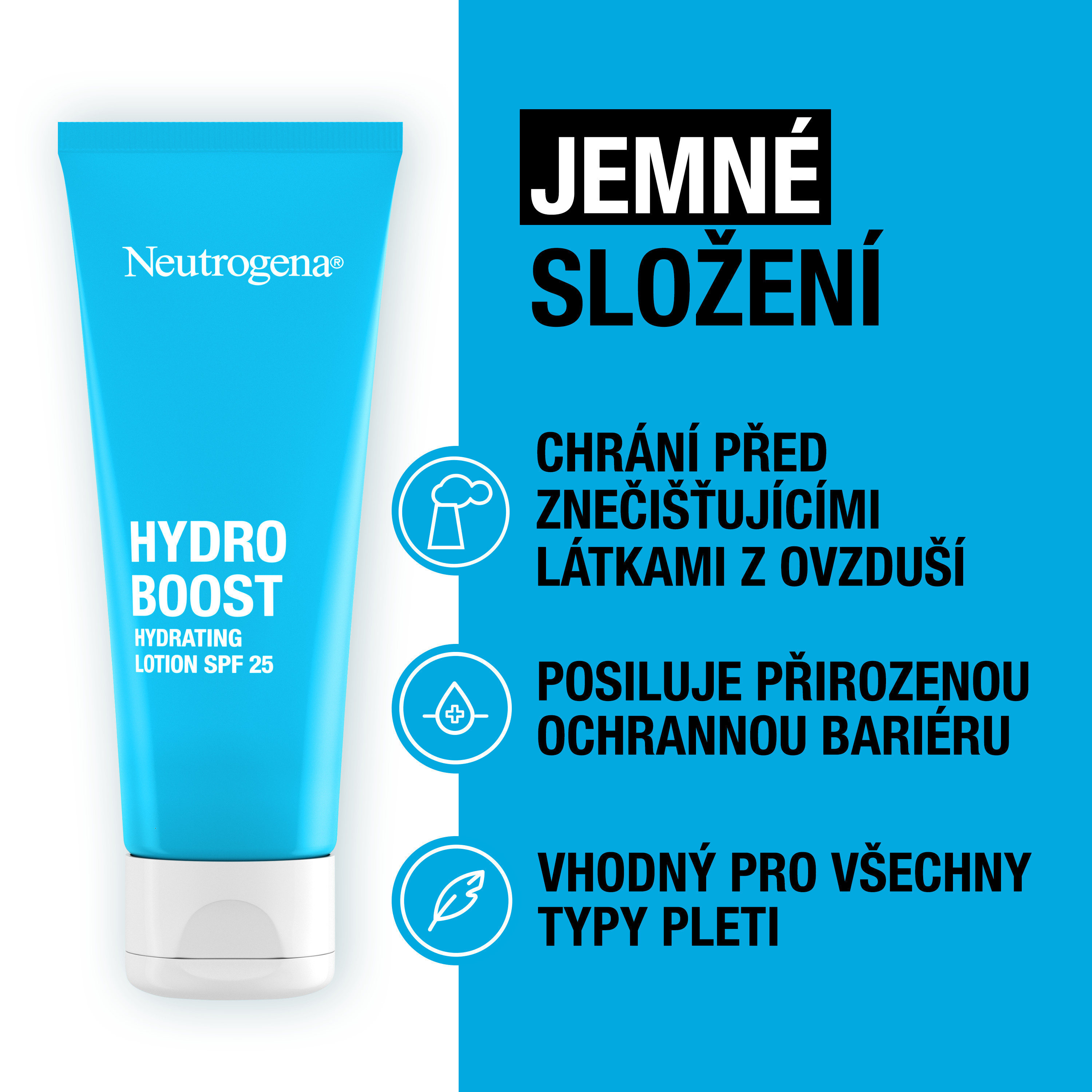 Náročné podmínky jako znečištění ovzduší, nepříznivé počasí a sluneční záření mohou zhoršit hydrataci pleti a její přirozenou ochrannou bariéru. To často vede k předčasnému stárnutí pokožky a ztrátě jasu. Neutrogena® Hydro Boost Hydratační krém SPF 25 pleť intenzivně hydratuje, chrání ji před škodlivým UVA/UVB zářením a znečišťujícími látkami z ovzduší a posiluje její přirozenou ochrannou bariéru. Pro zářivou pleť. Vhodný pro všechny typy pleti. Ultralehké, nemastné & intenzivně hydratující složení. Nekomedogenní - neucpává póry.