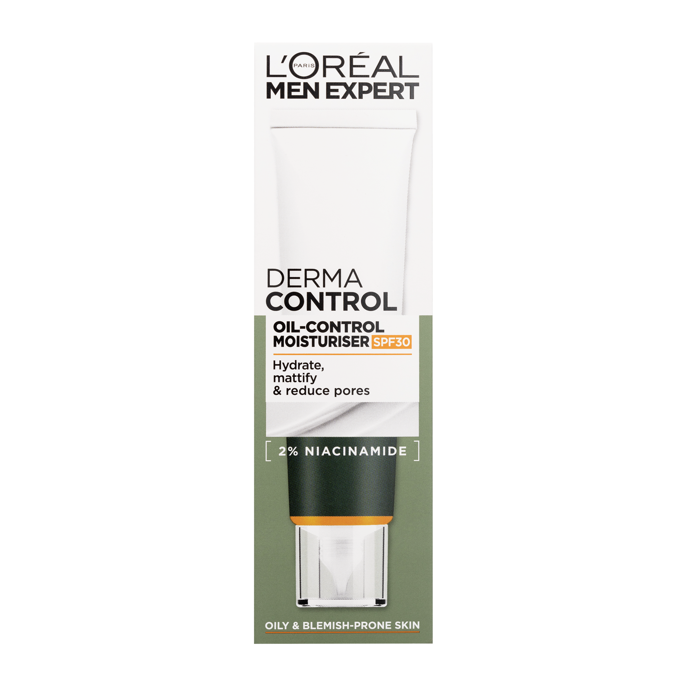Hydratační krém L'Oréal Paris Men Expert Derma Control Oil-Control Moisturiser pomáhá obnovit rovnováhu pleti na mastných místech. Složení s ochranným faktorem SPF 30 poskytuje ochranu před UV zářením a pomáhá předcházet známkám stárnutí způsobeným slunečním zářením. Jeho lehká textura, ideální pro každodenní použití, nelepí a okamžitě se vstřebává. Obsahuje 2% niacinamid (vitamin B3), který je známý svými hydratačními vlastnostmi. U mastné pleti a pleti se sklonem k nedokonalostem pomáhá minimalizovat vzhled nedokonalostí a pórů, zároveň vyhlazuje pleť.