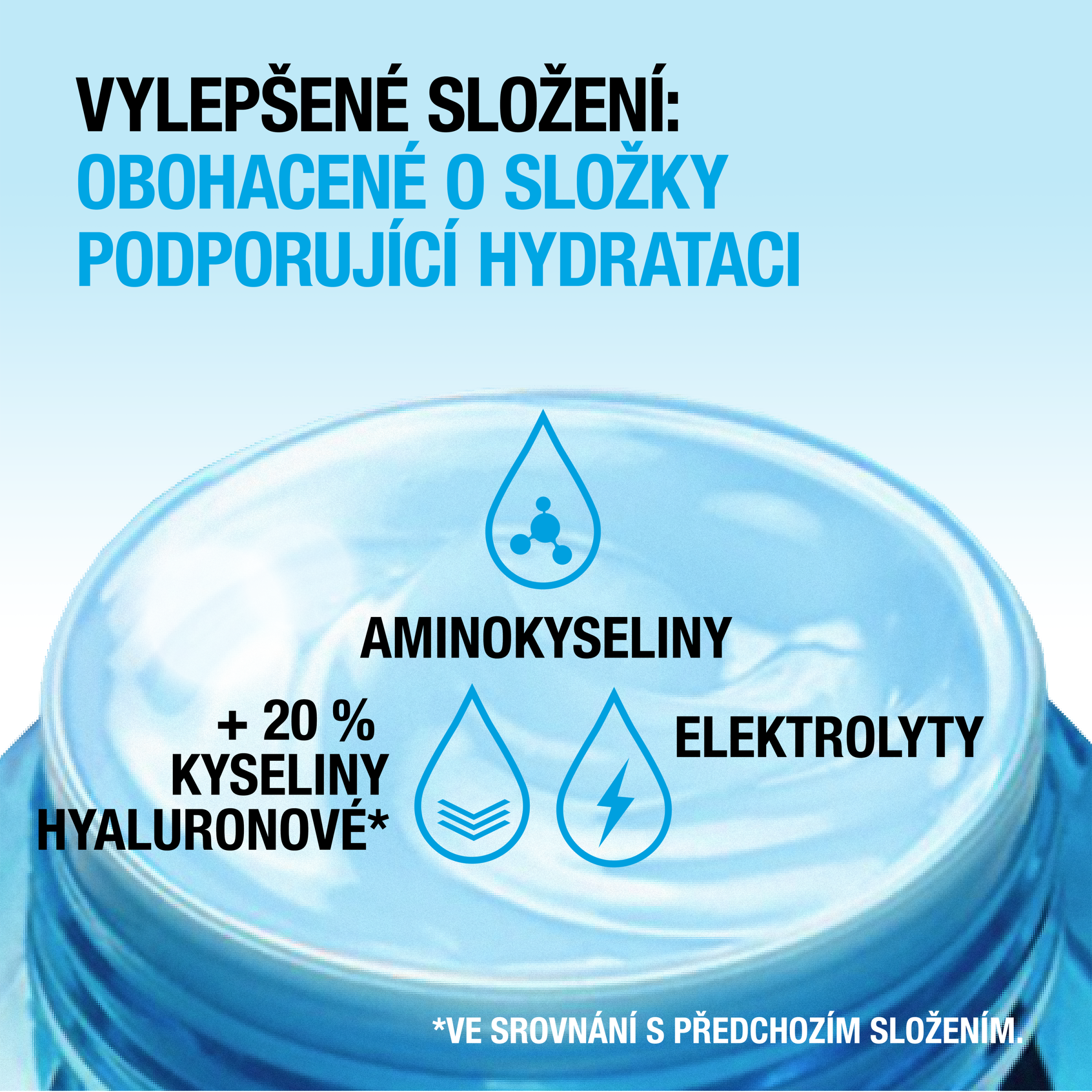 - o 20 % více Kyseliny Hyaluronové* pomáhá zadržet vodu v pokožce a zvýšit její hydrataci