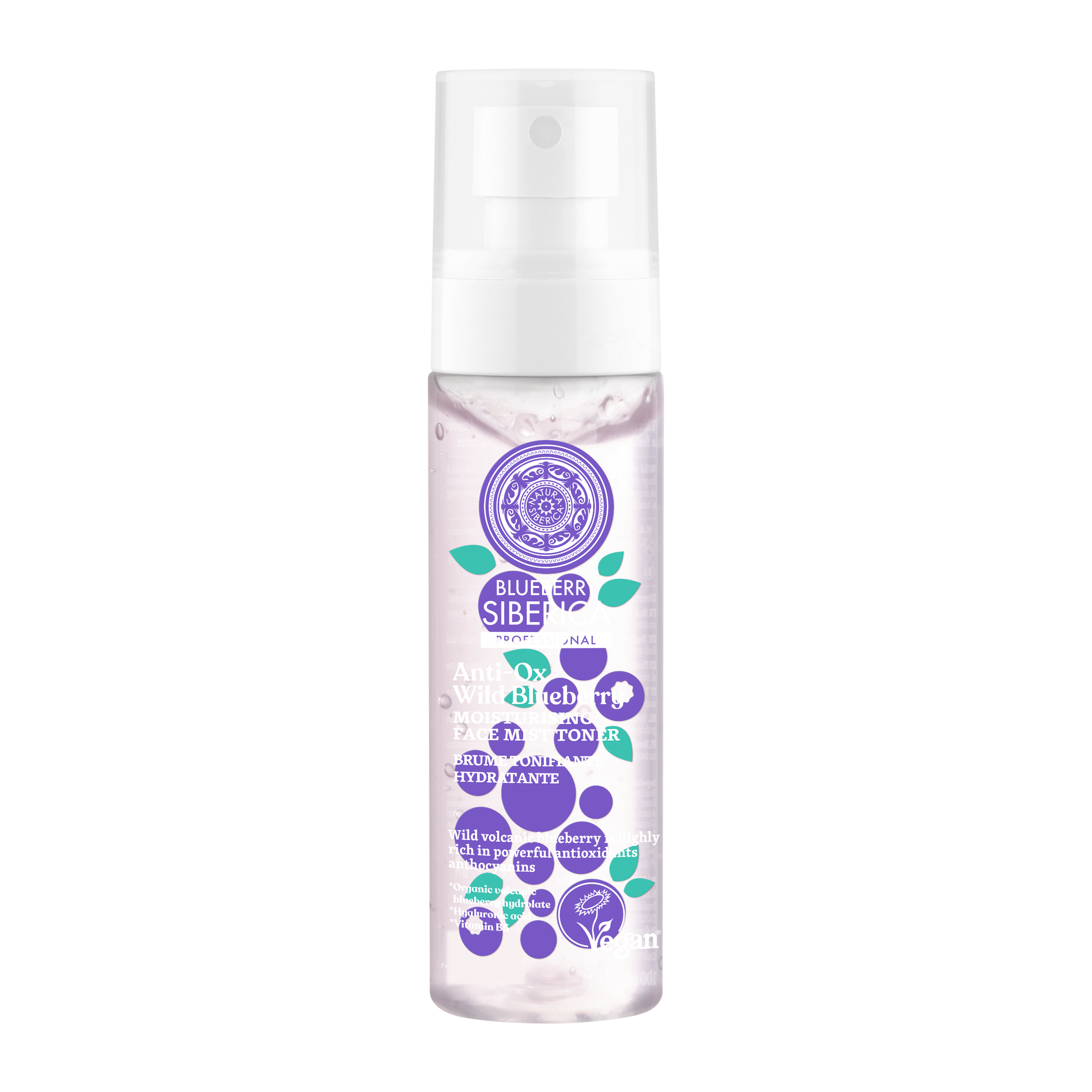 Tato hydratační pleťová mlha tonikum pleť dokonale hydratuje a zanechává ji svěží, přirozeně zářící. Divoké sopečné borůvky, rostoucí v drsných podmínkách tajgy, obsahují velké množství cenných antioxidantů antokyanů. Borůvky jsou také bohaté na beta karoten a vitamíny skupiny B, které dodávají jas, zanechávají pokožku hydratovanou a hebkou. Kyselina hyaluronová – účinně hydratuje pokožku, zabraňuje vzniku jemných vrásek. Vitamin B5 je skutečný super hrdina mezi vitamíny B. Dokonale tonizuje a vyhlazuje texturu pokožky.