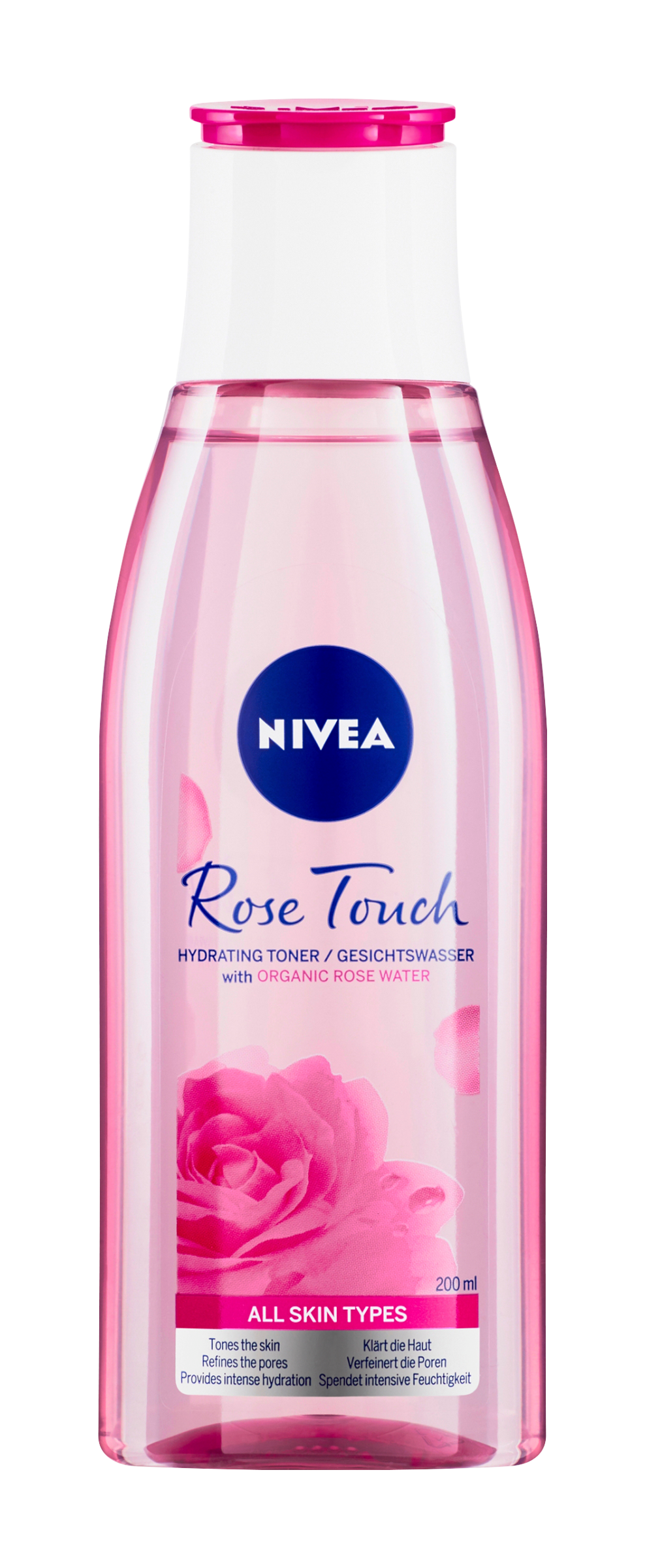 Nivea® hydratační pleťová voda Rose Touch s organickou růžovou vodou dočišťuje a tonizuje pleť, zjemňuje póry a poskytuje 24h intenzivní hydrataci. Pro všechny typy pleti včetně citlivé.