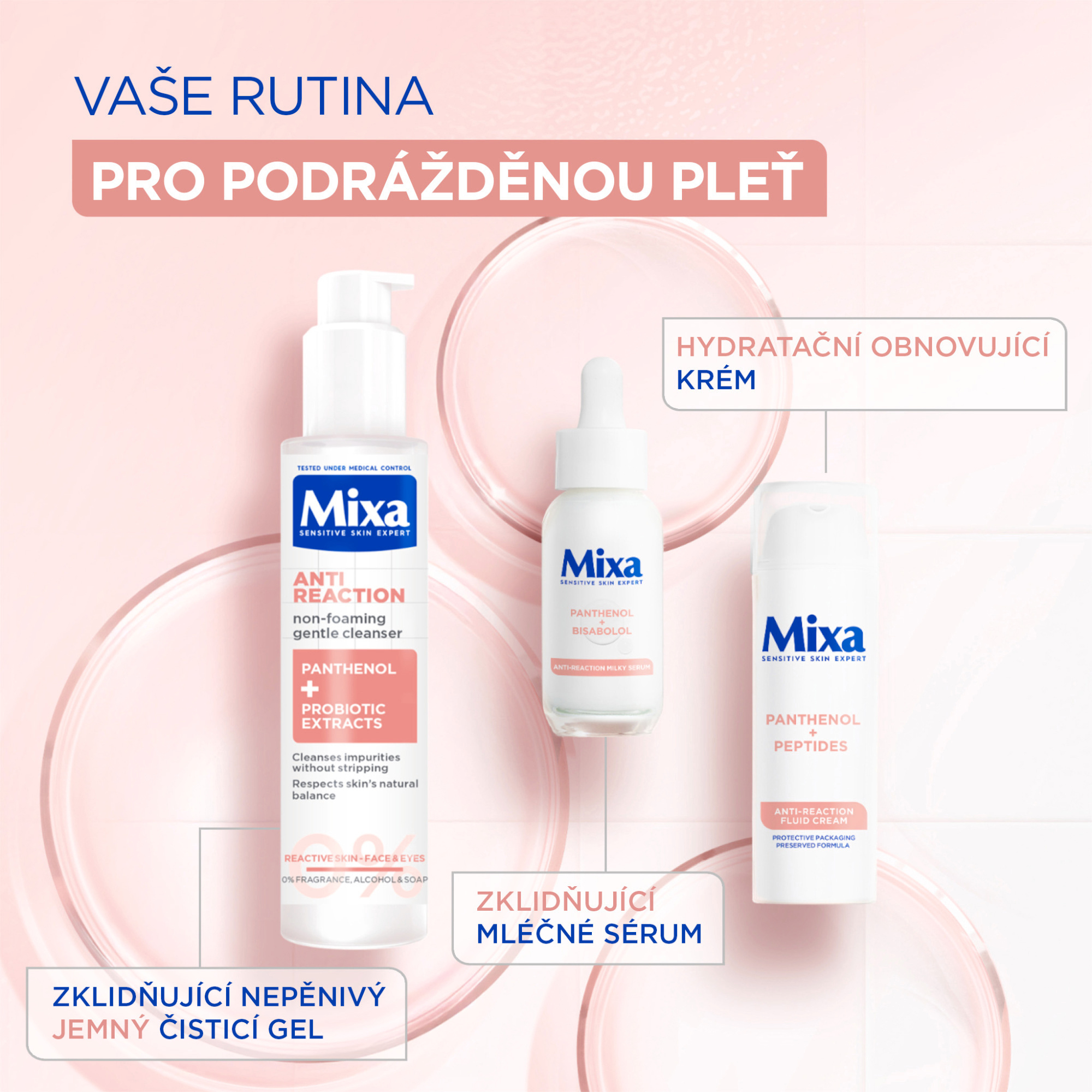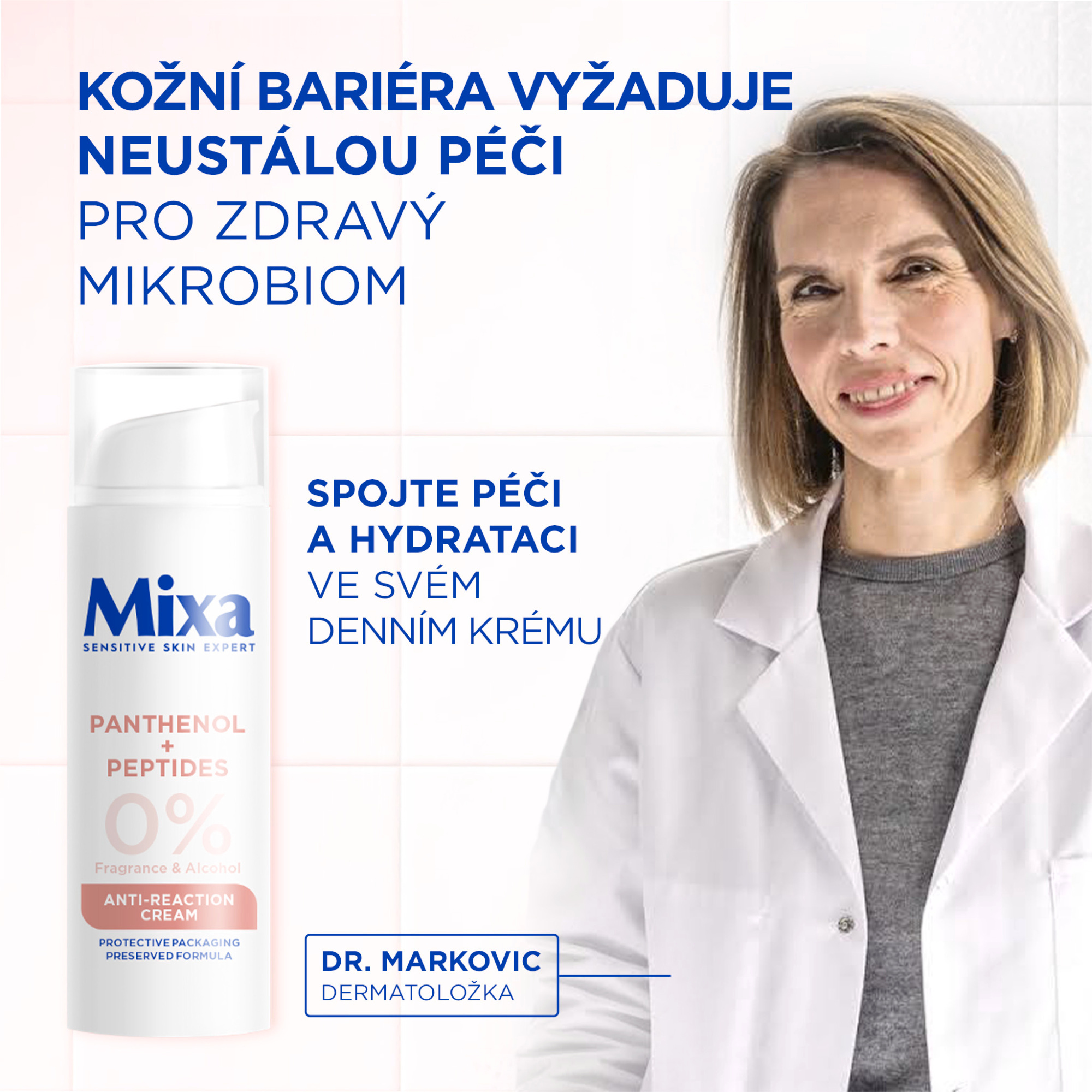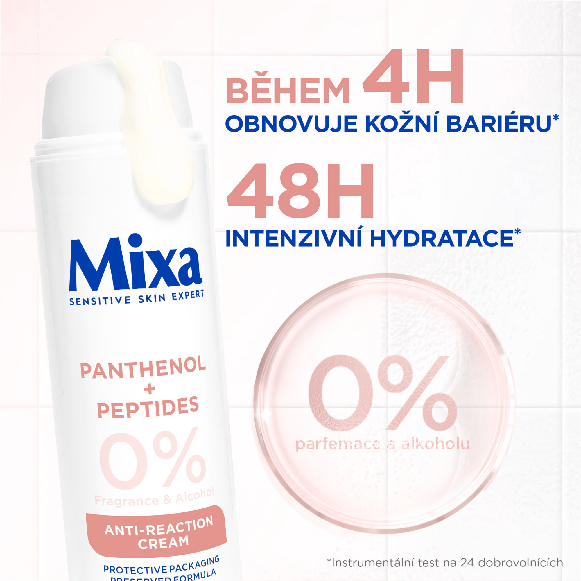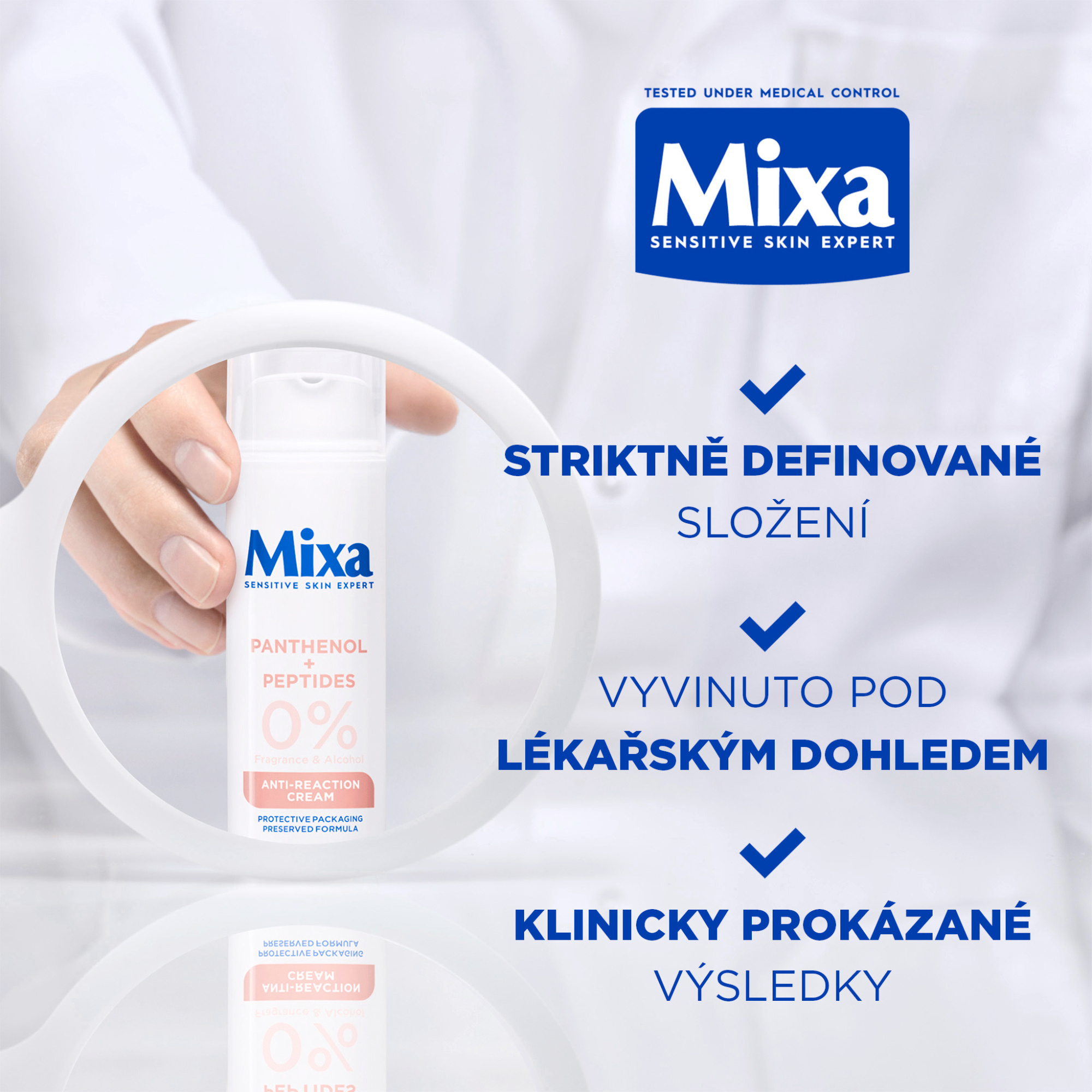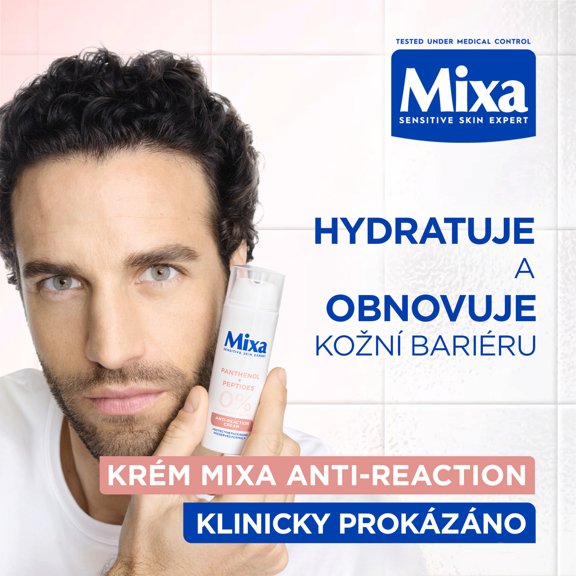 Hydratační regenerační krém Mixa Anti-Reaction s panthenolem a peptidy pro hydrataci a regeneraci kožní bariéry, vhodný pro citlivou pleť.