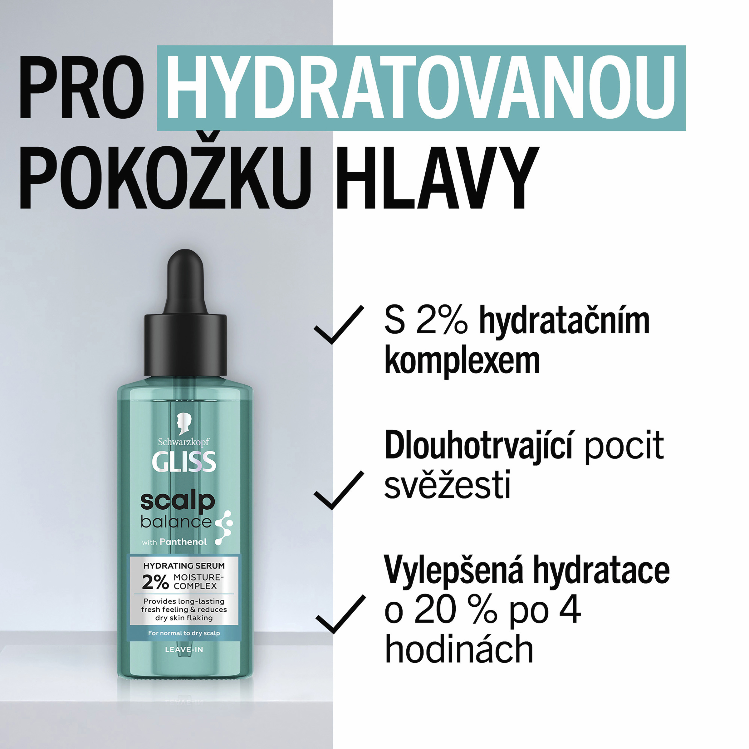 Hydratační sérum pro normální až suchou pokožku hlavy. Bezoplachové sérum na pokožku hlavy s panthenolem a 2% hydratačním komplexem pro dlouhotrvající pocit svěžesti. Sérum speciálně vyvinuté pro normální až suchou pokožku hlavy pomáhá předcházet jejímu vysušování a snižuje šupinatění pokožky způsobené suchostí. Již po 4 hodinách zlepšuje hydrataci pokožky hlavy o 20 % pro hydratovanou pokožku hlavy. Neobsahuje silikony a je veganské*.