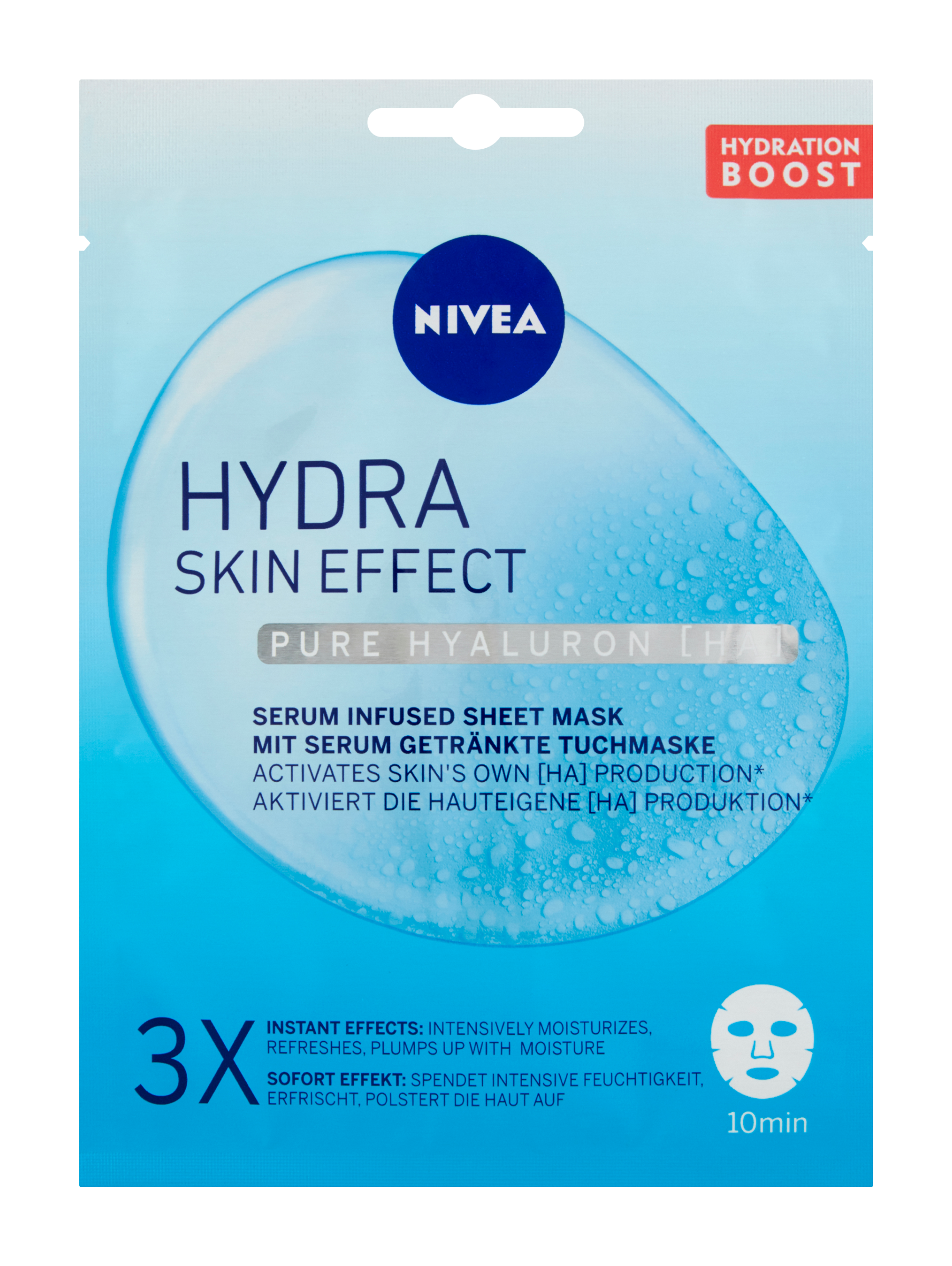 Nivea® 10 minutová hydratační textilní maska Hydra Skin Effect s kyselinou hyaluronovou, aktivující tvorbu vlastní kyseliny hyaluronové v pleti, a aloe vera poskytuje okamžitě intenzivní hydrataci pleti, osvěžuje a redukuje známky suché pleti. Výsledkem je hydratovaná, vyplněná a osvěžená pleť.