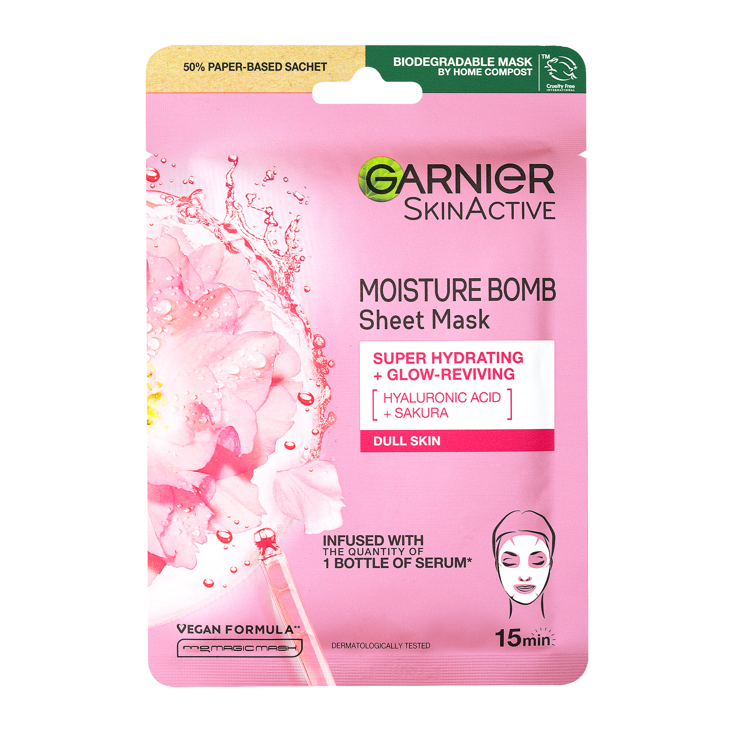 Vypadá vaše pleť mdle a váš obličej nemá jednotný vzhled? Připravit se, nasadit, zazářit! Maskujte s naší revoluční textilní maskou, která vaši pleť dokonale nabije dávkou hydratace už za 15 minut! Obsahuje hydratační složení obohacené o kyselinu hyaluronovou a sakuru s účinkem na posílení jasu. Vhodné i pro citlivou pleť.