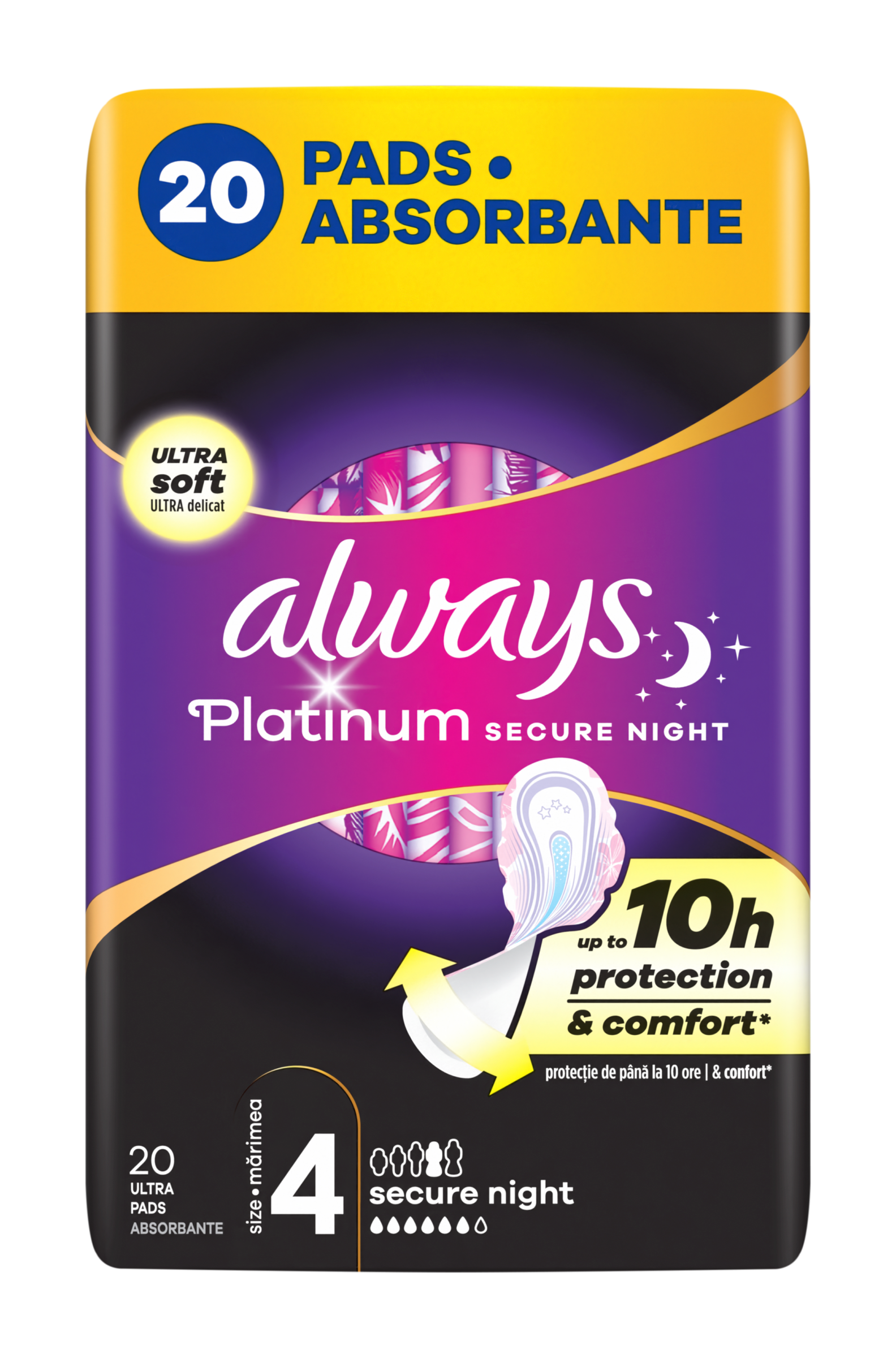 Hygienické vložky Always Platinum jsou navržené tak, aby zcela zabraňovaly protékání, posunování a nepohodlí. S hygienickými vložkami Always Platinum můžete snít bez obav. Hygienické vložky Always Platinum Secure Night (velikost 4) mají o 60 %* větší zadní část, takže vám poskytnou lepší ochranu přesně tam, kde to nejvíc potřebujete.