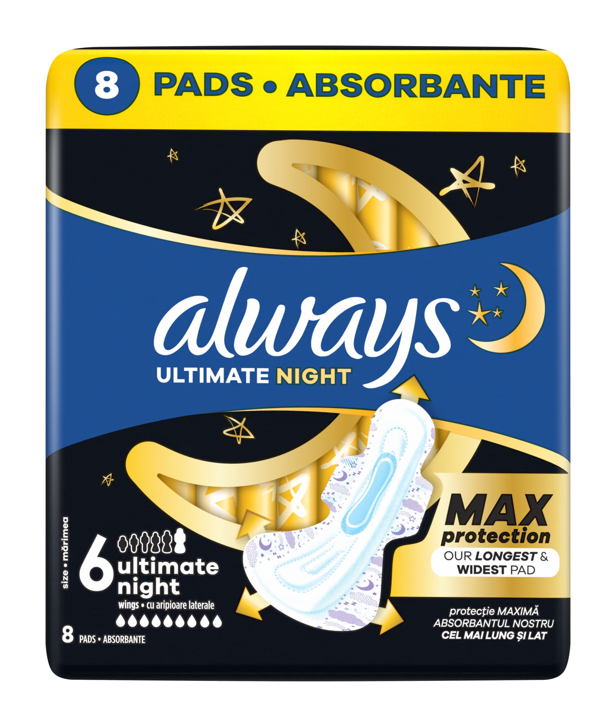 Nemusíte dělat kompromisy a smiřovat se s nekvalitním spánkem: Hygienické vložky Always Ultimate Night (velikost 6) s křidélky jsou navrženy pro maximální ochranu, takže se nemusíte v noci probouzet a kontrolovat, jestli vložka neprotéká nebo nepotřebuje vyměnit. Nejdelší a nejširší vložky této značky jsou vybaveny technologií LeakGuard a představují vložky s největší absorpcí této značky, takže v noci chrání proti protečení. Systém InstantDry absorbuje tekutinu během několika sekund a odvádí vlhkost od pokožky. Jsou vybaveny také systémem ComfortFit a extra křidélky na zadní straně, které jsou navržena tak, aby vložka zůstala na svém místě, ať už spíte jakkoli. Díky propracovanému systému pro určení vhodné velikosti Always Moje velikost si najdete tu nejlepší ochranu značky Always podle intenzity vaší menstruace a velikosti kalhotek.